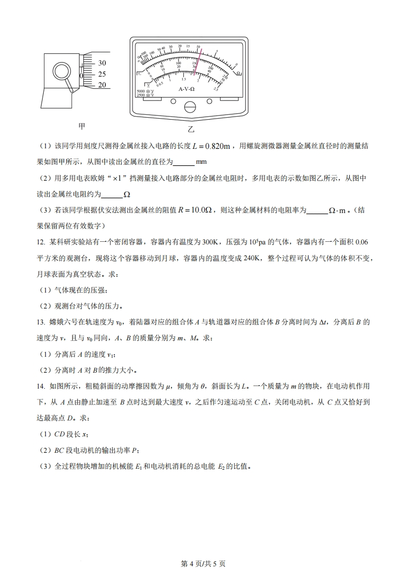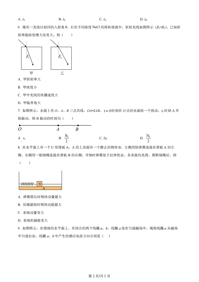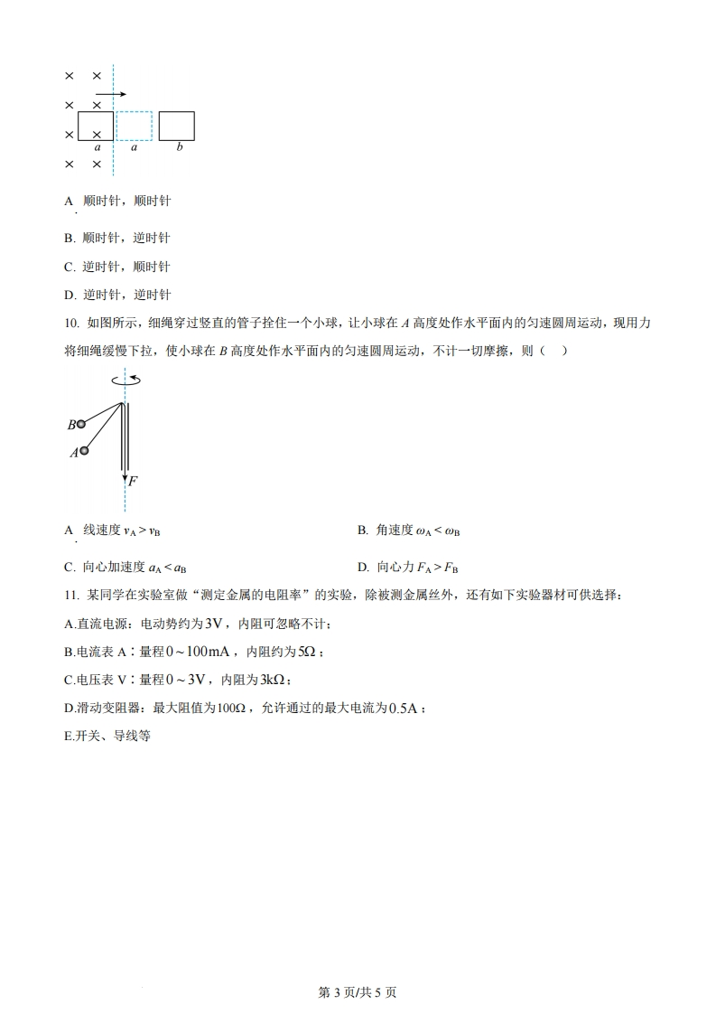 江苏高考物理试卷1.在静电场中有a、b两点,试探电荷在两点的静电力F与电荷量g满足如图所示的关系,请问a、b两点的场强大小关系是()A.E。=EbB.E=2EC.E。E。2.用立体影院的特殊眼镜去观看手机液晶屏幕,左镜片明亮,右镜片暗,现在将手机屏幕旋转90度,会观察到()A.两镜片都变亮B.两镜片都变暗C.两镜片没有任何变化D.左镜片变暗,右镜片变亮3.用粒子轰击氮核从原子核中打出了质子,该实验的核反应方程式是X+,N→H+“C,粒子X为()A.正电子9eB.中子。nC.氘核HD.氢核4.喷泉a、b形成如图所示的形状,不计空气阻力,则喷泉a、b的()bA.加速度相同B.初速度相同C.最高点的速度相同D.在空中的时间相同5.在原子跃迁中,辐射如图所示的4种光子,其中只有一种光子可使某金属发生光电效应,是哪一种名第1页共5页A.1B.2C.3D.46.现有一光线以相同的入射角0,打在不同浓度NaC1的两杯溶液中,折射光线如图所示(P,<52),己知折射率随浓度增大而变大。则(甲A.甲折射率大B.甲浓度小C.甲中光线的传播速度大D.甲临界角大7.如图所示,水面上有O、A、B三点共线,OA=2AB,t=0时刻在O点的水面给一个扰动,1时刻A开始振动,则B振动的时刻为()0ABAtC.2118.在水平面上有一个U形滑板A,A的上表面有一个静止的物体B,左侧用轻弹簧连接在滑板A的左侧,右侧用一根细绳连接在滑板B的右侧,开始时弹簧处于拉伸状态,各表面均光滑,剪断细绳后,则(wBA.弹簧原长时物体动量最大B.压缩最短时物体动能最大C.系统动量变大D.系统机械能变大9.如图所示,在绝缘的水平面上,有闭合的两个线圈a、b,线圈α处在匀强磁场中,现将线圈a从磁场中匀速拉出,线圈a、b中产生的感应电流方向分别是()第2页共5页A顺时针,顺时针B.顺时针,逆时针C.逆时针,顺时针D.逆时针,逆时针10.如图所示,细绳穿过竖直的管子拴住一个小球,让小球在A高度处作水平面内的匀速圆周运动,现用力将细绳缓慢下拉,使小球在B高度处作水平面内的匀速圆周运动,不计一切摩擦,则()BOA线速度VA>BB.角速度OAFB11.某同学在实验室做“测定金属的电阻率”的实验,除被测金属丝外,还有如下实验器材可供选择:A直流电源:电动势约为3V,内阻可忽略不计:B.电流表A:量程0~100mA,内阻约为52:C.电压表V:量程0~3V,内阻为3k2:D.滑动变阻器:最大阻值为1002,允许通过的最大电流为0.5A:E开关、导线等第3页/共5页