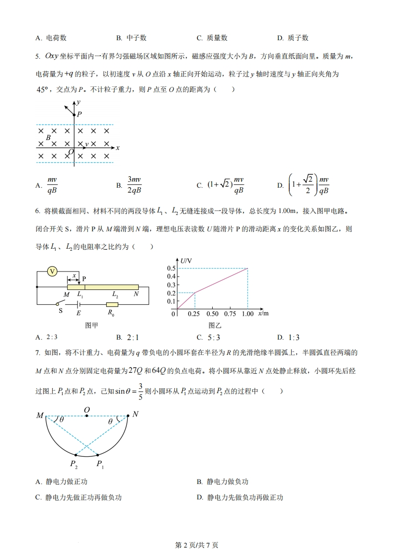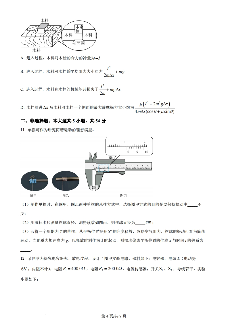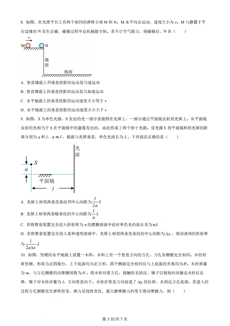 2024年普通高中学业水平选择性考试(广西卷)物理一、选释题,本大题共10小题,共46分。第17题,每小题4分,只一项符合题目要求,第8~10题,每小题6分,有多项符合题目要求,全部选对的得6分,选对但不全的得3分,有选错的得0分。1.潮汐现象出现的原因之一是在地球的不同位置海水受到月球的引力不相同。图中、b和c处单位质量的海水受月球引力大小在()地球○月球A.a处最大B.b处最大C.c处最大D.a、c处相等,b处最小2.工人卸货时常利用斜面将重物从高处滑下。如图,三个完全相同的货箱正沿着表面均匀的长直木板下滑,货箱各表面材质和粗糙程度均相同。若1、2、3号货箱与直木板间摩擦力的大小分别为F、F2和F3,则()A.F1
