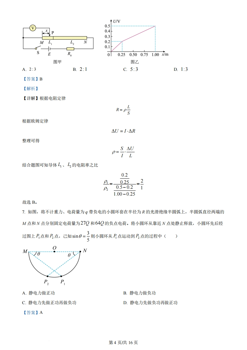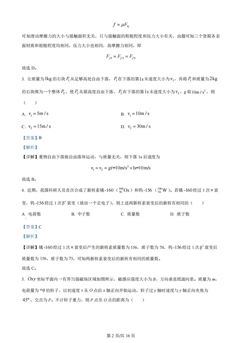 2024年普通高中学业水平选择性考试(广西卷)物理一、选释题,本大题共10小题,共46分。第1~7题,每小题4分,只一项符合题目要求,第8~10题,每小题6分,有多项符合题目要求,全部选对的得6分,选对但不全的得3分,有选错的得0分。1.潮汐现象出现的原因之一是在地球的不同位置海水受到月球的引力不相同。图中α、b和c处单位质量的海水受月球引力大小在()6地球○月球A.a处最大B.b处最大C.c处最大D.a、c处相等,b处最小【答案】A【解析】【详解】根据万有引力公式F=G MmR可知图中α处单位质量的海水收到月球的引力最大:故选A。2.工人卸货时常利用斜面将重物从高处滑下。如图,三个完全相同的货箱正沿着表面均匀的长直木板下滑,货箱各表面材质和粗糙程度均相同。若1、2、3号货箱与直木板间摩擦力的大小分别为F、F2和F3,则()A.F1