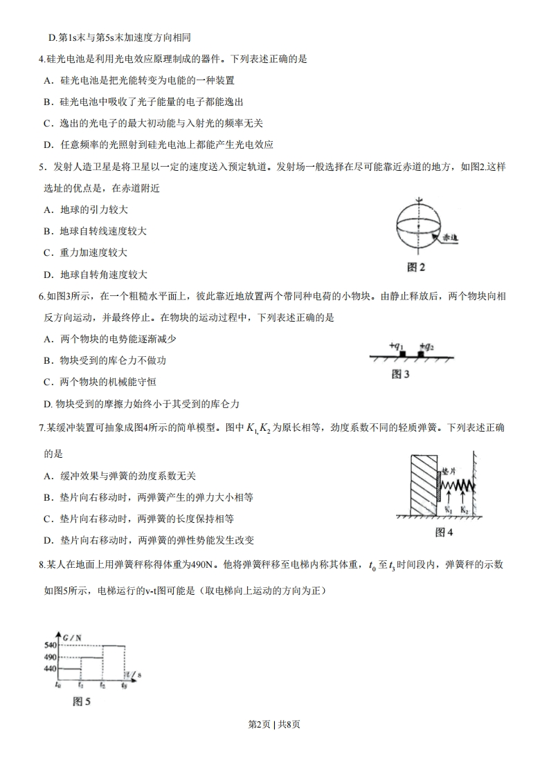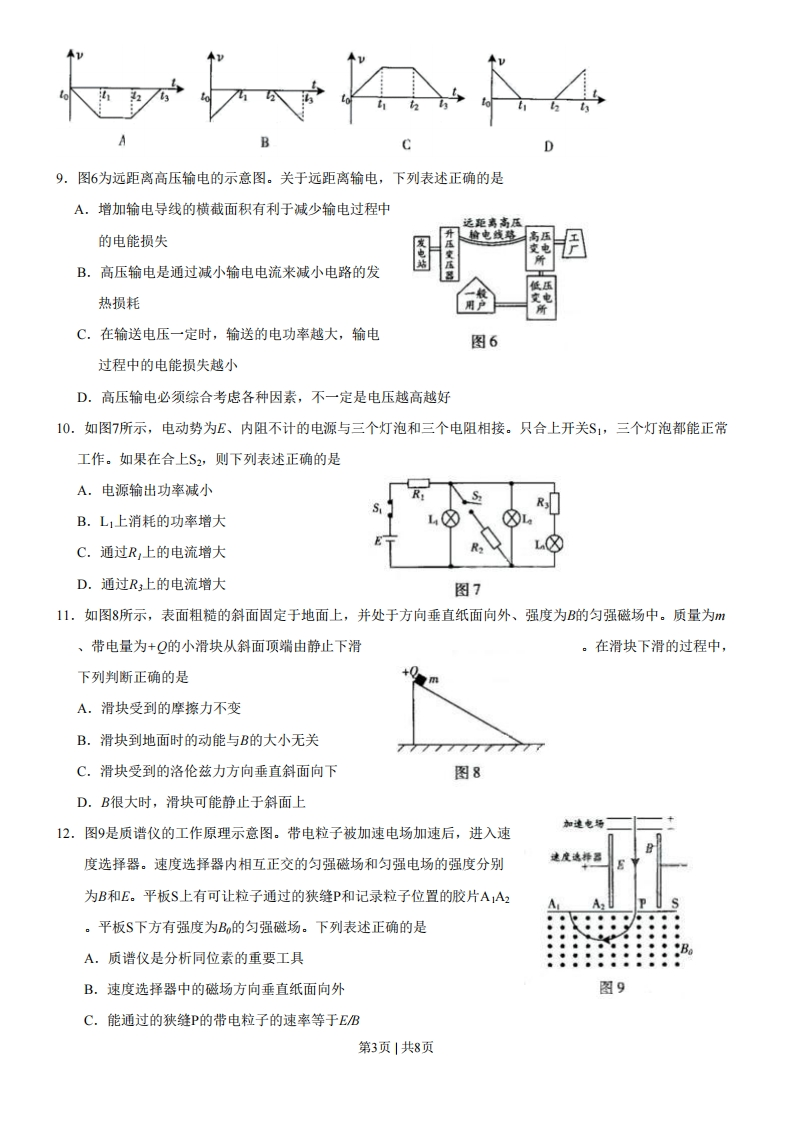 秘密★启用前★★★★★★2009年普通高等学校招生全国统一考试(广东卷)物理本试卷共8页,20小题,满分150分。考试用时120分钟。注意事项:1答卷前,考生务必用黑色字迹的钢笔或签字笔将自己的姓名和考生号、试室号、座位号填写在答题卡上。用2B铅笔将试卷类型(A)填涂在答思卡相应位置上。将条形码横贴在答题卡右上角“条形码粘贴处”。2.选择题每小题选出答案后,用2B铅笔把答题卡上对应题目选项的答案信息点涂黑,如需改动用橡皮擦干净后,再选涂其他答案。3非选择题必须用黑色字迹的钢笔或签字笔作答。答案必须写在答题卡各题目指定区域内相应的位置上;如需改动,先划掉原来的答案,然后再写上新的答案;不准使用铅笔和涂改液。不按以上要求作答的答案无效。4.作答选做题时,请先用2铅笔填涂选做题的题号对应的信息点,再作答。漏涂、错涂、多涂的,答案无效。5考生必须保持答题卡的整洁。考试结束后,将试卷和答题卡一并交回。一、选释题:本大题共12小题,每小题4分,共48分。在每小题给出的四个选项中,有一个或一个以上选项符合题目要求,全部选对的得4分,选不全的得2分,有选错或不答的得0分。1.物理学的发展丰富了人类对物质世界的认识,推动了科学技术的创新和革命,促进了物质生产的繁荣与人类文明的进步。下列表述正确的是A.牛顿发现了万有引力定律B.洛伦兹发现了电磁感应定律C.光电效应证实了光的波动性D.相对论的创立表明经典力学己不再适用2.科学家发现在月球上含有丰富的3H(氨3)。它是一种高效、清洁、安全的核聚变燃料,其参与的一种核聚变反应的方程式为He+3H→2H+He。关于He聚变下列表述正确的是A.聚变反应不会释放能量B.聚变反应产生了新的原子核v/(m/s)C.聚变反应没有质量亏损D.目前核电站都采用3H聚变反应发电3.某物体运动的速度图像如图1,根据图像可知A.0-2s内的加速度为1m/s22B.0-5s内的位移为10m图1C.第1s末与第3s末的速度方向相同第1页|共8页D.第1s末与第5s末加速度方向相同4.硅光电池是利用光电效应原理制成的器件。下列表述正确的是A.硅光电池是把光能转变为电能的一种装置B.硅光电池中吸收了光子能量的电子都能逸出C,逸出的光电子的最大初动能与入射光的频率无关D.任意频率的光照射到硅光电池上都能产生光电效应5.发射人造卫星是将卫星以一定的速度送入预定轨道。发射场一般选择在尽可能靠近赤道的地方,如图2这样选址的优点是,在赤道附近A.地球的引力较大B.地球自转线速度较大C.重力加速度较大图2D.地球自转角速度较大6如图3所示,在一个粗糙水平面上,彼此靠近地放置两个带同种电荷的小物块。由静止释放后,两个物块向相反方向运动,并最终停止。在物块的运动过程中,下列表述正确的是A.两个物块的电势能逐渐减少+g:B.物块受到的库仑力不做功图3C.两个物块的机械能守恒D.物块受到的摩擦力始终小于其受到的库仑力7某缓冲装置可抽象成图4所示的简单模型。图中K,K,为原长相等,劲度系数不同的轻质弹簧。下列表述正确的是A.缓冲效果与弹簧的劲度系数无关B.垫片向右移动时,两弹簧产生的弹力大小相等C.垫片向右移动时,两弹簧的长度保持相等图4D.垫片向右移动时,两弹簧的弹性势能发生改变8某人在地面上用弹簧秤称得体重为490N。他将弹簧秤移至电梯内称其体重,t。至1时间段内,弹簧秤的示数如图5所示,电梯运行的v-t图可能是(取电梯向上运动的方向为正)G/N540490440图5第2页|共8页/介9.图6为远距离高压输电的示意图。关于远距离输电,下列表述正确的是A.增加输电导线的横截面积有利于减少输电过程中运距离高压的电能损失电线高压电B.高压输电是通过减小输电电流来减小电路的发热损耗C.在输送电压一定时,输送的电功率越大,输电图6过程中的电能损失越小D.高压输电必须综合考虑各种因素,不一定是电压越高越好10.如图7所示,电动势为£、内阻不计的电源与三个灯泡和三个电阻相接。只合上开关S1,三个灯泡都能正常工作。如果在合上S2,则下列表述正确的是A.电源输出功率减小B.L1上消耗的功率增大C.通过R,上的电流增大D.通过R;上的电流增大图711.如图8所示,表面粗糙的斜面固定于地面上,并处于方向垂直纸面向外、强度为B的匀强磁场中。质量为m、带电量为+Q的小滑块从斜面顶端由静止下滑。在滑块下滑的过程中,下列判断正确的是A.滑块受到的摩擦力不变B.滑块到地面时的动能与B的大小无关777777777C.滑块受到的洛伦兹力方向垂直斜面向下图8D.B很大时,滑块可能静止于斜面上加速电场12.图9是质谱仪的工作原理示意图。带电粒子被加速电场加速后,进入速度选择器。速度选择器内相互正交的匀强磁场和匀强电场的强度分别速度选择器为B和E。平板S上有可让粒子通过的狭缝P和记录粒子位置的胶片AA2AA:0。平板S下方有强度为B的匀强磁场。下列表述正确的是A.质谱仪是分析同位素的重要工具B.速度选择器中的磁场方向垂直纸面向外图9C.能通过的狭缝P的带电粒子的速率等于EB第3页|共8页