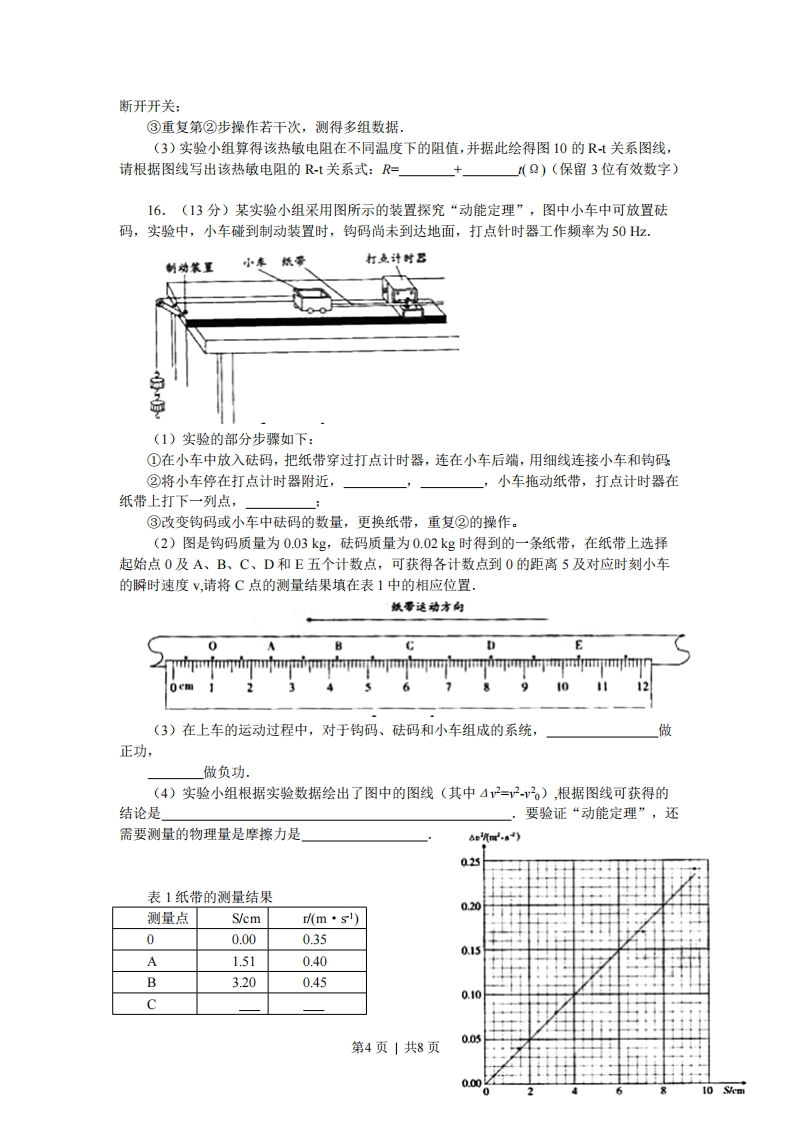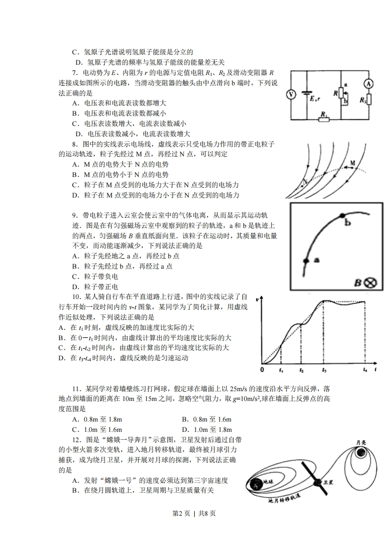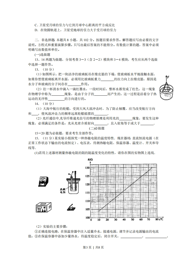 2008年普通高等学校招生全国统一考试广东卷物理本试卷共8页,20小题,满分150分,考试用时120分钟。一、选择题:本大题共12小题。每小题4分,共48分。在每小题给出的四个选项中,有一个或一个以上选项符合题目要求,全部选对的得4分,选不全的得2分,有选错或不答的得0分。1.加利略在著名的斜面实验中,让小球分别沿倾角不同、阻力很小的斜面从静止开始滚下,他通过实验观察和逻辑推理,得到的正确结论有A.倾角一定时,小球在斜面上的位移与时间成正比B.倾角一定时,小球在斜面上的速度与时间成正比C.斜面长度一定时,小球从顶端滚到底端时的速度与倾角无关D.斜面长度一定时,小球从顶端滚到底端所需的时间与倾角无关2.铝箔被a粒子轰击后发生了以下核反应:?A+2He→+。n.下列判断正确的是A.0n是质子B.。n是中子C.X是8Si的同位素D.X是P的同位素3.运动员跳伞将经历加速下降和减速下降两个过程,将人和伞看成一个系统,在这两个过程中,下列说法正确的是A.阻力对系统始终做负功B.系统受到的合外力始终向下C.重力做功使系统的重力势能增加D.任意相等的时间内重力做的功相等4.1930年劳伦斯制成了世界上第一台回旋加速器,其原理如图所示,这台加速器由两个铜质D形合D1、D2构成,其间留有空隙,下列说法正确的是A.离子由加速器的中心附近进入加速器B.离子由加速器的边缘进入加速器C.离子从磁场中获得能量D.离子从电场中获得能量5,小型交流发电机中,矩形金属线圈在匀强磁场中匀速转动。产e/Y生的感应电动势与时间呈正弦函数关系,如图所示,此线圈与一个R=2010Q的电阻构成闭合电路,不计电路的其他电阻,下列说法正确的是A.交叉电流的周期为0.125B.交叉电流的频率为8Hz0.125/020WC.交变电流的有效值为V2A-20D.交变电流的最大值为4A6.有关氢原子光谱的说法正确的是A.氢原子的发射光谱是连续谱B.氢原子光谱说明氢原子只发出特定频率的光第1页|共8页C,氢原子光谱说明氢原子能级是分立的D.氢原子光谱的频率与氢原子能级的能量差无关7.电动势为E、内阻为r的电源与定值电阻R1、R及滑动变阻器R连接成如图所示的电路,当滑动变阻器的触头由中点滑向b端时,下列说法正确的是A.电压表和电流表读数都增大RB.电压表和电流表读数都减小C.电压表读数增大,电流表读数减小D.电压表读数减小,电流表读数增大8.图中的实线表示电场线,虚线表示只受电场力作用的带正电粒子的运动轨迹,粒子先经过M点,再经过N点,可以判定A.M点的电势大于N点的电势B.M点的电势小于N点的电势C.粒子在M点受到的电场力大于在N点受到的电场力D.粒子在M点受到的电场力小于在N点受到的电场力9.带电粒子进入云室会使云室中的气体电离,从而显示其运动轨迹.图是在有匀强磁场云室中观察到的粒子的轨迹,a和b是轨迹上的两点,匀强磁场B垂直纸面向里.该粒子在运动时,其质量和电量不变,而动能逐渐减少,下列说法正确的是A.粒子先经地之a点,再经过b点B.粒子先经过b点,再经过a点C.粒子带负电BD.粒子带正电10.某人骑自行车在平直道路上行进,图中的实线记录了自行车开始一段时间内的图象,某同学为了简化计算,用虚线作近似处理,下列说法正确的是A.在时刻,虚线反映的加速度比实际的大B.在0一时间内,由虚线计算出的平均速度比实际的大C.在-2时间内,由虚线计算出的平均速度比实际的大D.在3-1时间内,虚线反映的是匀速运动011.某同学对着墙壁练习打网球,假定球在墙面上以25m/s的速度沿水平方向反弹,落地点到墙面的距离在10m至15m之间,忽略空气阻力,取g=10m/s2,球在墙面上反弹点的高度范围是A.0.8m至1.8mB.0.8m至1.6mC.1.0m至1.6mD.1.0m至1.8m12.图是“嫦娥一导奔月”示意图,卫星发射后通过自带的小型火箭多次变轨,进入地月转移轨道,最终被月球引力捕获,成为绕月卫星,并开展对月球的探测,下列说法正确的是A.发射“嫦娥一号”的速度必须达到第三宇宙速度B.在绕月圆轨道上,卫星周期与卫星质量有关第2页|共8页C.卫星受月球的引力与它到月球中心距离的平方成反比D.在绕圆轨道上,卫星受地球的引力大于受月球的引力二.非选择题本题共8小题,共102分。按题目要求作答。解答题应写出必要的文字说明。方程式和重要演算步骤。只写出最后答案的不能得分。有数值计算的题,答案中必须明确写出数值和单位。(一)选做题13、14两题为做题,分别考查3一3(含2一2)模块和3一4模块,考生应从两个选做中选择一题作答。13.(10分)(1)如图所示,把一块洁净的玻璃板吊在橡皮筋的下端,使玻璃板水平地接触水面,如果你想使玻璃板离开水面,必须用比玻璃板重力的拉力向上拉橡皮筋,原因是水分子和玻璃的分子间存在作用:(2)往一杯清水中滴入一滴红墨水,一段时间后,整杯水都变成了红色,这一现象在物理学中称为现象,是由于分子的而产生的,这一过程是沿着分子热运动的无序性的方向进行的。14.(10分)(1)大海中航行的轮船,受到大风大浪冲击时,为了防止倾覆,应当改变航行方向和,使风浪冲击力的频率远离轮船摇摆的(2)光纤通信中,光导纤维递光信号的物理原理是利用光的现象,要发生这种现象,必须满足的条件是:光从光密介质射向且入射角等于或大于(二)必做题15一20题为必做题,要求考生全部作答。15.(11分)某实验小组探究一种热敏电阻的温度特性.现在器林:直流恒流电源(在正常工作状态下输出的电流恒定)、电压表,待测热敏电阻、
