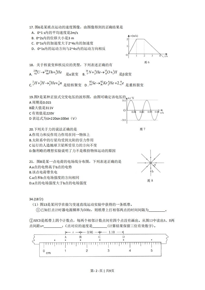 2010年普通高等学校招生全国统一考试(广东卷物理)一、单项选择题:本大题共4小题,每小题4分。共16分。在每小题给出的四个选项中,只有一个选项符合题目要求,选对的得4分,选错或不答的得0分。13.图2为节日里悬挂灯笼的一种方式,A,B点等高,0为结点,轻绳AO、帐度相等,拉力别为F.,F灯笼受到的重力为13.图2为节日里悬挂灯笼的一种方式,A、B点等高,O为结点,轻绳AO、BO长度相等,拉力分别为FA、FB.灯笼受到的重力为G.下列表述正确的是A.FA一定小于GB.Fa与FB大小相等图2C.Fa与FB是一对平衡力D.Fa与FB大小之和等于G14.图3是密闭的气缸,外力推动活塞P压缩气体,对缸内气体做功800,同时气体向外界放热200,缸内气体的A.温度升高,内能增加600B.温度升高,内能减少200C.温度降低,内能增加600]压力传感器D.温度降低,内能减少200J洗15.如图4所示,某种自动洗衣机进水时,与洗衣缸相连的细管中会封闭一定质量的空气,通过压力传感器感知管中的空气压力,从而控制进水量。设温度不变,洗衣缸内水位升高,则细管中被封闭的空气图4A.体积不变,压强变小B.体积变小,压强变大C.体积不变,压强变大MMD.体积变小,压强变小×X××B16.如图5所示,平行导轨间有一矩形的匀强磁场区域,细OI N金属棒PQ沿导轨从MN处匀速运动到M'N'的过程中,图5D棒上感应电动势E随时间t变化的图示,可能正确的是二双项选择题:本大题共9小题,每小题6分,共54分。在每小题给出的四个选项中,有两个选项符合题目要求,全部选对得6分,只选1个且正确的得3分,有选错或不答的得0分。第-1-页1共9页17.图6是某质点运动的速度图像,由图像得到的正确结果是A.01s内的平均速度是2m/sB.02s内的位移大小是3m(mC.0~1s内的加速度大于2~4s内的加速度D.01s内的运动方向与24s内的运动方向相反图618.关于核衰变和核反应的类型,下列表述正确的有A微U→7h+e是度变B.N+→O+H是B衰变cH+H→He+n是轻核聚变D.Se→KHe+2e是重核裂变19.图7是某种正弦式交变电压的波形图,由图可确定该电压的◆/VA周期是0.01S311B最大值是311V0C有效值是220V0.0D表达式为U=220sin100t(V)-31120.下列关于力的说法正确的是图7A.作用力和反作用力作用在同一物体上B.太阳系中的行星均受到太阳的引力作用C运行的人造地球卫星所受引力的方向不变D.伽利略的理想实验说明了力不是维持物体运动的原因21.图8是某一点电荷的电场线分布图,下列表述正确的是A.a点的电势高于b点的电势B.该点电荷带负电C.a点和b点电场强度的方向相同图8D.a点的电场强度大于b点的电场强度34.(18分)(1)图13是某同学在做匀变速直线运动实验中获得的一条纸带。①己知打点计时器电源频率为50Hz,则纸带上打相邻两点的时间间隔为】②ABCD是纸带上四个计数点,每两个相邻计数点间有四个点没有画出。从图13中读出A、B两点间距s=」:C点对应的速度是(计算结果保留三位有效数字)。54—0.904…1.104BCTTTTTTTTTTTTTTTTTTTTTTTTTTTTTTTTTTTTTTTTTTTTT02cm第-2-页1共9页(2)某同学利用电压表和电阻箱测定干电池的电动势和内阻,使用的器材还包括定值电阻(R=52)一个,开关两个,导线若干,实验原理图如图14().①在图14(b)的实物图中,己正确连接了部分电路,请完成余下电路的连接。②请完成下列主要实验步骤:A.检查并调节电压表指针指零:调节电阻箱,示数如图14(c)所示,读得电阻值是B.将开关5,闭合,开关S2断开,电压表的示数是1.49V:C.将开关52,电压表的示数是1.16V:断开开关S。③使用测得的数据,计算出干电池的内阻是(计算结果保留二位有效数字)。④由于所有电压表不是理想电压表,所以干电池测得的电动势比实际值偏(填“大”或“小)。(h】(c湖1435.(18分)如图15所示,一条轨道固定在竖直平面内,粗糙的ab段水平,bcde段光滑,cde段是以O为圆心、R为半径的一小段圆弧。可视为质点的物块A和B紧靠在一起,静止于b处,A的质量是B的3倍。两物块在足够大的内力作用下突然分离,分别向左、右始终沿轨道运动。B到b点时速度沿水平方向,此时轨道对B的支持力大小等于B所受重力的34,A与ab段的动摩擦因数为μ,重力加速度g,求:(1)物块B在d点的速度大小:第-3-页1共9页
