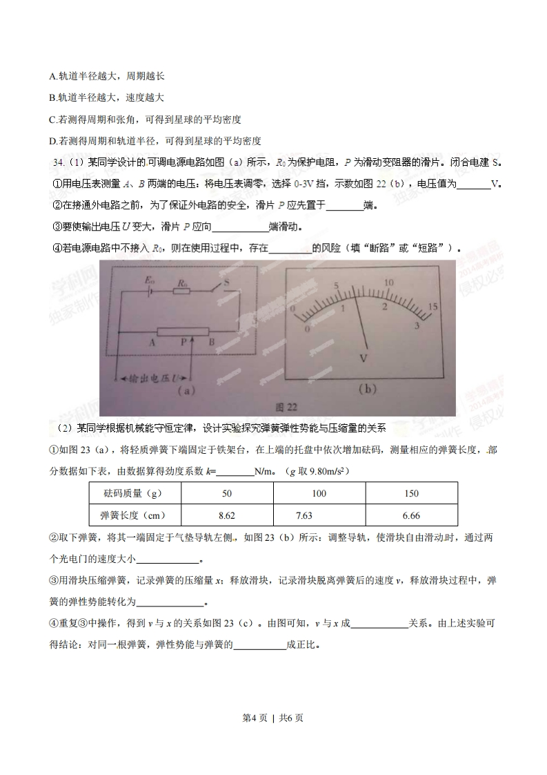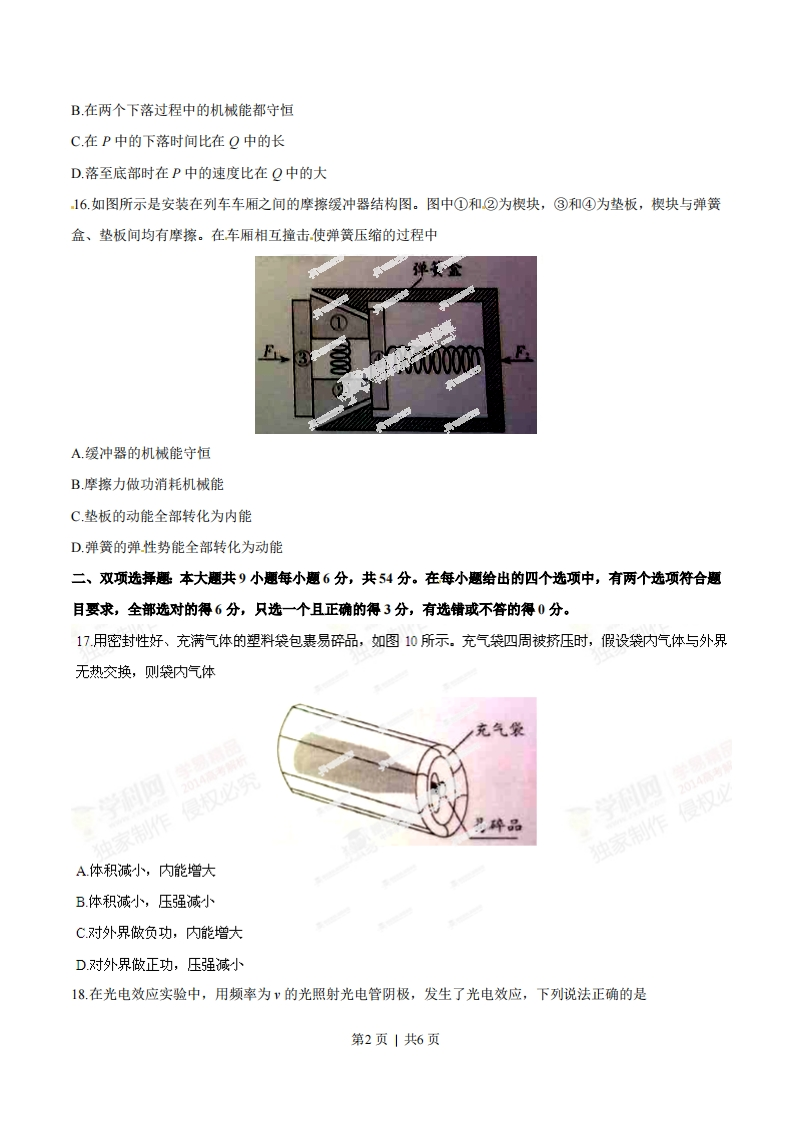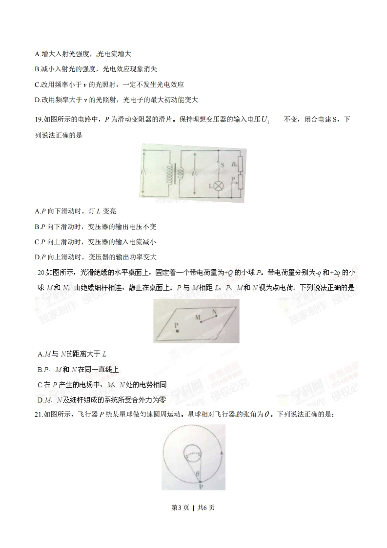 2014年高考广东卷理科综(物理部分)试题解析13.如图所示是物体做直线运动的1图象,由图可知,该物体0A.第1s内和第3s内的运动方向相反B.第3s内和第4s内的加速度相同C.第1s内和第4s内的位移大小不相等D.0-2s和0-4s内的平均速度大小相等14如图所示,水平地面上堆放着原木,关于原木P在支撑点么V处受力的方向,下列说法正确的是学利AM处受到的支持力竖直向上独家制作侵权BN处受到的支持力竖直向上C.M处受到的静摩擦力沿N方向DV处受到的静摩擦力沿水平方向5.如图所示,上下开口、内壁光滑的铜管P和塑料管Q竖直放置,小磁块先后在两管中从相同高度处由静止释放,并落至底部,则小磁块A.在P和O中都做自由落体运动第1页|共6页B.在两个下落过程中的机械能都守恒C在P中的下落时间比在Q中的长D.落至底部时在P中的速度比在Q中的大16.如图所示是安装在列车车厢之间的摩擦缓冲器结构图。图中①和②为楔块,③和④为垫板,楔块与弹簧盒、垫板间均有摩擦。在车厢相互撞击使弹簧压缩的过程中A.缓冲器的机械能守恒B.摩擦力做功消耗机械能C.垫板的动能全部转化为内能D.弹簧的弹性势能全部转化为动能二、双项选择题本大题共9小题每小题6分,共54分。在每小题给出的四个选项中,有两个选项符合题目要求,全部选对的得6分,只选一个且正确的得3分,有选错或不答的得0分。17用密封性好、充满气体的塑料袋包裹易碎品,如图10所示。充气袋四周被挤压时,假设袋内气体与外界无热交换,则袋内气体充气袋制作侵权必究”碎品独家制作侵权必A体积减小,内能增大B.体积减小,压强减小C对外界做负功,内能增大D对外界做正功,压强减小18.在光电效应实验中,用频率为ⅴ的光照射光电管阴极,发生了光电效应,下列说法正确的是第2页|共6页A增大入射光强度,光电流增大B.减小入射光的强度,光电效应现象消失C改用频率小于v的光照射,一定不发生光电效应D.改用频率大于v的光照射,光电子的最大初动能变大19.如图所示的电路中,P为滑动变阻器的滑片。保持理想变压器的输入电压U,不变,闭合电建S,下列说法正确的是A.P向下滑动时,灯L变亮B.P向下滑动时,变压器的输出电压不变CP向上滑动时,变压器的输入电流减小D.P向上滑动时,变压器的输出功率变大20如图所示,光滑绝缘的水平桌面上,固定着一个带电荷量为-Q的小球P。带电荷量分别为g和+2g的小球M和。由绝绿细杆相连,静止在桌面上。P与M相距L,P、M和V视为点电荷。下列说法正确的是独家制独家制们AM与N的距离大于LB.P、M和N在同一直线上C.在P产生的电场中,丛N处的电势相同2014D丛N及细杆组成的系统所受合外力为零侵权暖21.如图所示,飞行器P绕某星球做匀速圆周运动。星球相对飞行器的张角为日。下列说法正确的是:第3页|共6页