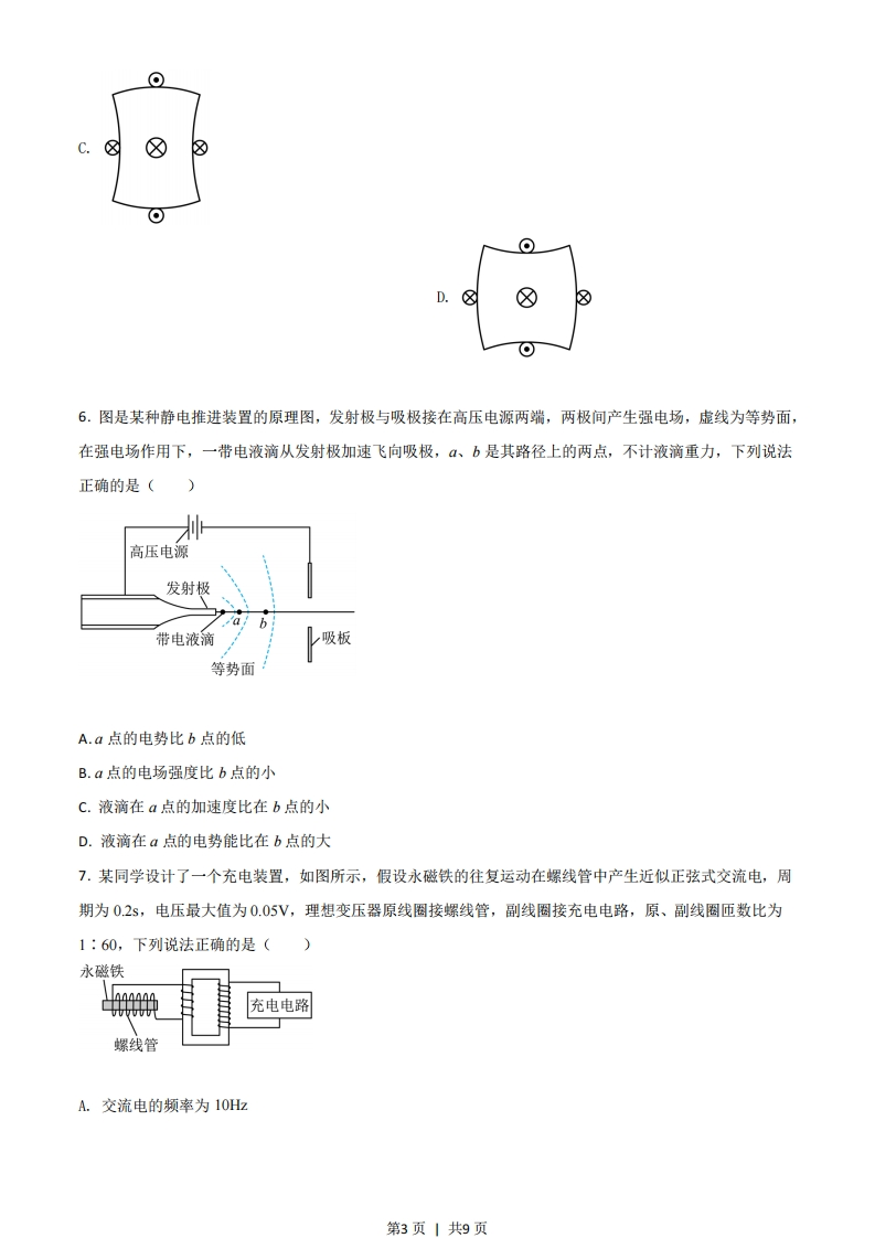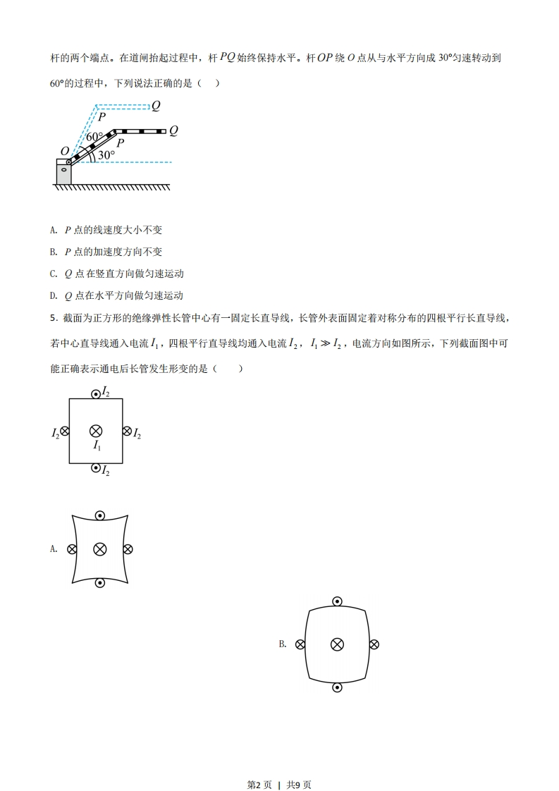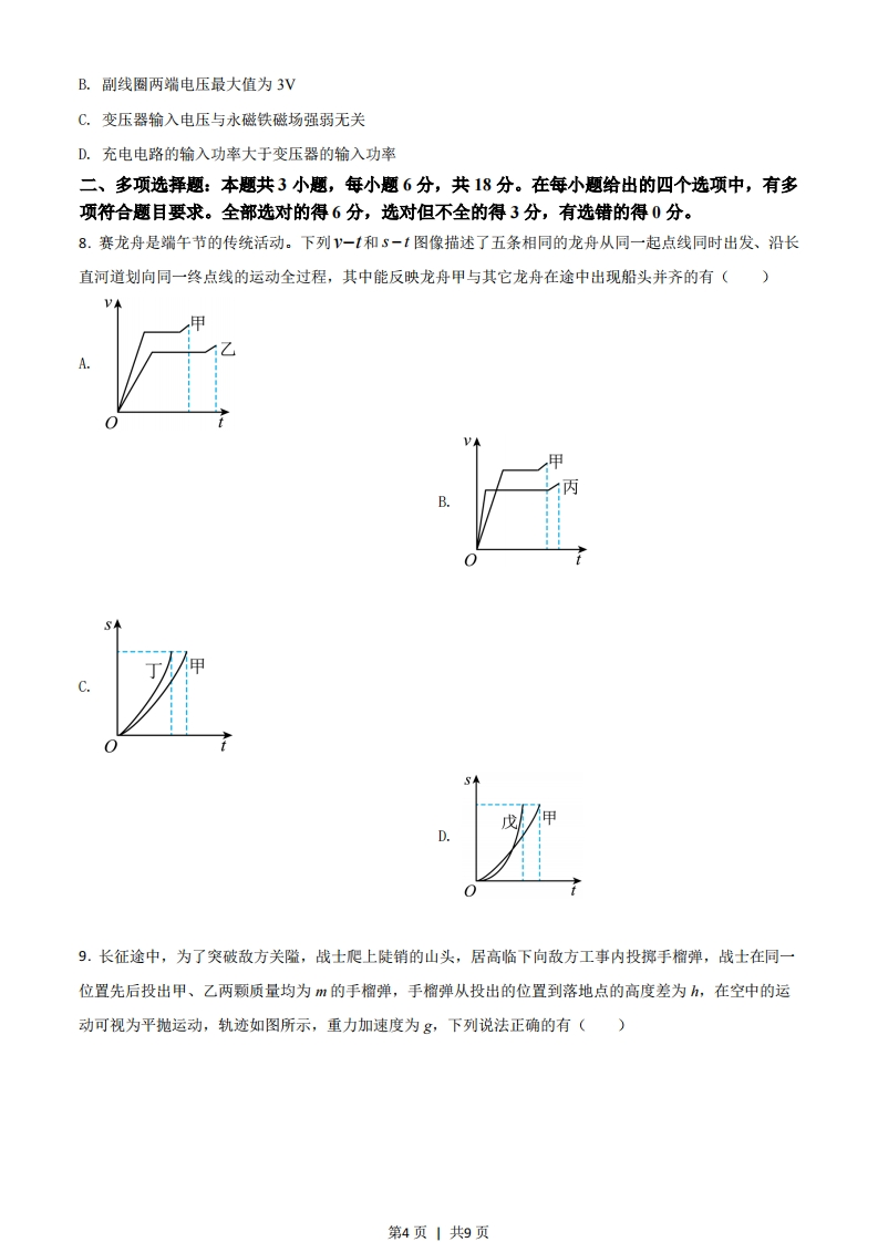 2021年广东省普通高中学业水平选择性考试物理一、单项选释题:本题共7小题,每小题4分,共28分。在每小题给出的四个选项中,只有一项是符合题目要求的。1.科学家发现银河系中存在大量的放射性同位素铝26,铝26的半衰期为72万年,其衰变方程为AI→沿Mg+Y,下列说法正确的是()A.Y是氨核B.Y是质子C.再经过72万年,现有的铝26衰变一半D.再经过144万年,现有的铝26全部衰变2.2021年4月,我国自主研发的空间站“天和”核心舱成功发射并入轨运行,若核心舱绕地球的运行可视为匀速圆周运动,己知引力常量,由下列物理量能计算出地球质量的是()A.核心舱的质量和绕地半径B.核心舱的质量和绕地周期C.核心舱的绕地角速度和绕地周期D.核心舱的绕地线速度和绕地半径3.唐代《耒耜经》记载了曲辕犁相对直辕犁的优势之一是起土省力,设牛用大小相等的拉力F通过耕索分别拉两种犁,F与竖直方向的夹角分别为α和B,α