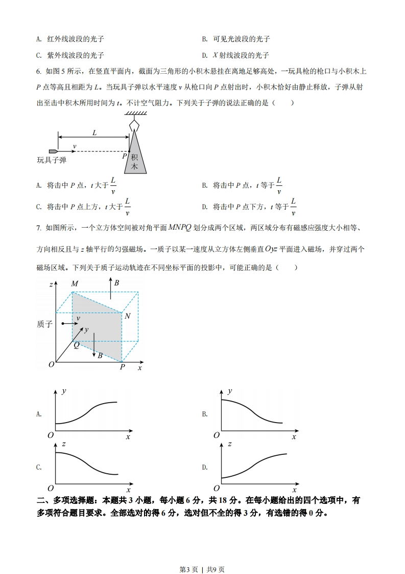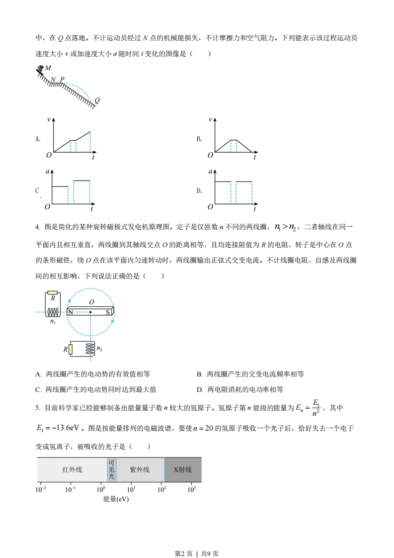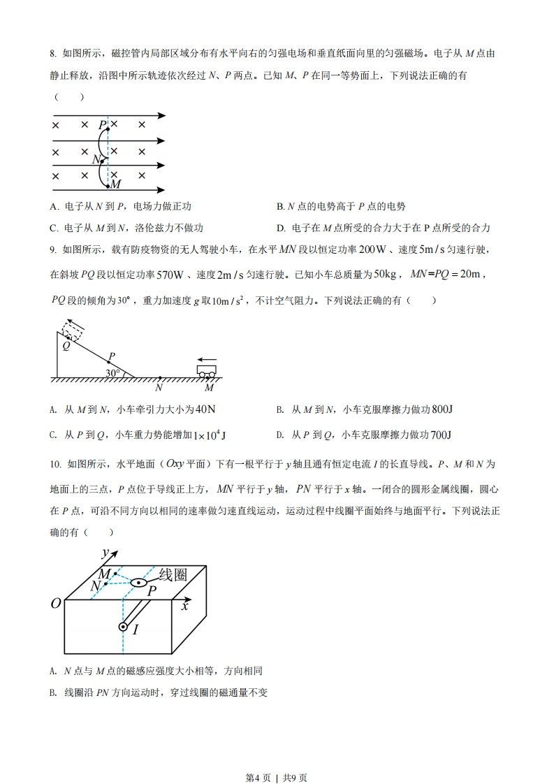 2022年广东省普通高中学业水平选择性考试物理本试卷共7页,16小题,满分100分,考试用时75分钟。注意事项:1、答卷前,考生务必用黑色字迹钢笔或签字笔将自己的姓名、考生号、考场号和座位号填写在答题卡上。用2B铅笔将试卷类型(A)填涂在答题卡相应位置上。将条形码横贴在答题卡右上角“条形码粘贴处”。2、作答选择题时,选出每小题答案后,用2B铅笔把答题卡上对应题目选项的答案信息点涂黑;如需改动,用橡皮擦干净后,再选涂其他答案,答案不能答在试卷上。3、非选择题必须用黑色字迹钢笔或签字笔作答,答案必须写在答题卡各题目指定区域内相应位置上;如需改动,先划掉原来的答案,然后再写上新的答案;不准使用铅笔和涂改液,不按以上要求作答的答案无效。4、作答选考题时,请先用2B铅笔填涂选做题的题号对应的信息点,再作答。漏涂、错涂、多涂的,答案无效。5、考生必须保持答题卡的整洁,考试结束后,将试卷和答题卡一并交回。一、单项选择题:本题共7小题,每小题4分,共28分。在每小题给出的四个选项中,只有一项是符合题目要求的。1.图是可用来制作豆腐的石磨。木柄AB静止时,连接AB的轻绳处于绷紧状态。O点是三根轻绳的结点,F、F和F分别表示三根绳的拉力大小,F=F,且∠AOB=60°。下列关系式正确的是()609A.F=FB.F=2FC.F=3FD.F=3F2.“祝融号”火星车需要“休眠”以度过火星寒冷的冬季。假设火星和地球的冬季是各自公转周期的四分之一,且火星的冬季时长约为地球的1.88倍。火星和地球绕太阳的公转均可视为匀速圆周运动。下列关于火星、地球公转的说法正确的是()A.火星公转的线速度比地球的大B.火星公转的角速度比地球的大C.火星公转的半径比地球的小D.火星公转的加速度比地球的小3.图是滑雪道的示意图。可视为质点的运动员从斜坡上的M点由静止自由滑下,经过水平NP段后飞入空第1页」共9页中,在Q点落地。不计运动员经过N点的机械能损失,不计摩擦力和空气阻力。下列能表示该过程运动员速度大小v或加速度大小a随时间t变化的图像是()爱MmimmmB4.图是简化的某种旋转磁极式发电机原理图。定子是仅匝数n不同的两线圈,n>几2,二者轴线在同一平面内且相互垂直,两线圈到其轴线交点O的距离相等,且均连接阻值为R的电阻,转子是中心在O点的条形磁铁,绕O点在该平面内匀速转动时,两线圈输出正弦式交变电流。不计线圈电阻、自感及两线圈间的相互影响,下列说法正确的是()RA.两线圈产生的电动势的有效值相等B.两线圈产生的交变电流频率相等C.两线圈产生的电动势同时达到最大值D.两电阻消耗的电功率相等5.目前科学家己经能够制备出能量量子数n较大的氢原子。氢原子第n能级的能量为En=,其中E,=-13.6V。图是按能量排列的电磁波谱,要使n=20的氢原子吸收一个光子后,恰好失去一个电子变成氢离子,被吸收的光子是(红外线见紫外线X射线光102101010102103能量(ev第2页|共9页A.红外线波段的光子B.可见光波段的光子C.紫外线波段的光子D.X射线波段的光子6.如图5所示,在竖直平面内,截面为三角形的小积木悬挂在离地足够高处,一玩具枪的枪口与小积木上P点等高且相距为L。当玩具子弹以水平速度ⅴ从枪口向P点射出时,小积木恰好由静止释放,子弹从射出至击中积木所用时间为1。不计空气阻力。下列关于子弹的说法正确的是()玩具子弹积木A将击中P点,1大于B.将击中P点,1等于马C.将击中P点上方,1大于马D.将击中P点下方,1等于马7.如图所示,一个立方体空间被对角平面MWPQ划分成两个区域,两区域分布有磁感应强度大小相等、方向相反且与:轴平行的匀强磁场。一质子以某一速度从立方体左侧垂直Oz平面进入磁场,并穿过两个磁场区域。下列关于质子运动轨迹在不同坐标平面的投影中,可能正确的是()MB质子二、多项选释题:本题共3小题,每小题6分,共18分。在每小题给出的四个选项中,有多项符合题目要求。全部选对的得6分,选对但不全的得3分,有选错的得0分。第3页|共9页