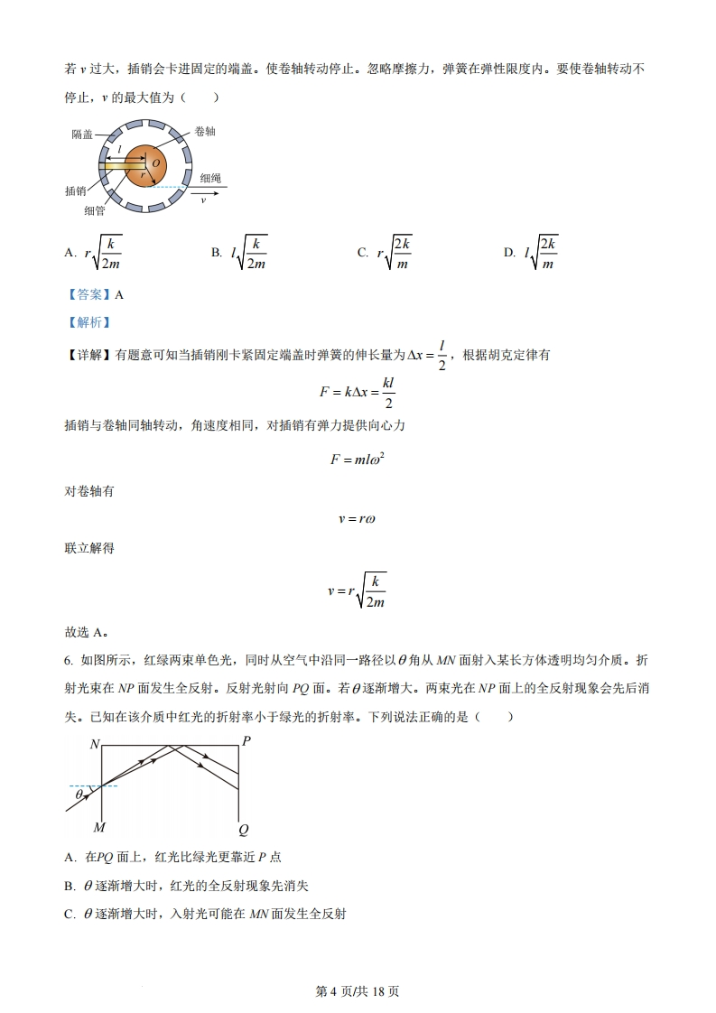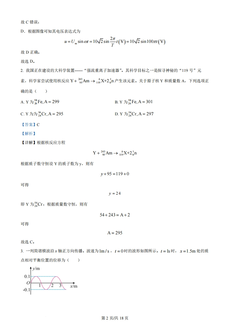 2024年普通高中学业水平选择性考试(广东卷)物理木试卷满分100分,考试时间75分钟一、单项选择题(本题共7小题,每小题4分,共28分。在每小题列出的四个选项中,只有一项符合题目要求)1.将阻值为50Q的电阻接在正弦式交流电源上。电阻两端电压随时间的变化规律如图所示。下列说法正确的是()↑/V10W20.02 .04t/s-10w2-A.该交流电的频率为100HzB.通过电阻电流的峰值为0.2AC.电阻在1秒内消耗的电能为山D.电阻两端电压表达式为u=10√2sin(100mt)V【答案】D【解析】【详解】A.由图可知交流电的周期为0.02s,则频率为f=7=50H故A错误:B.根据图像可知电压的峰值为10√2V,根据欧姆定律可知电流的峰值U=10W5=0.22AIm=R502故B错误:C.电流的有效值为1=0=0.2A√2所以电阻在1s内消耗的电能为W=I2Rt=0.22×50×1J=2J第1页供18页故C错误:D.根据图像可知其电压表达式为n(V)0sin0(V)故D正确。故选D。2.我国正在建设的大科学装置一“强流重离子加速器”。其科学目标之一是探寻神秘的“119号”元素,科学家尝试使用核反应Y+Am→1X+2产生该元素。关于原子核Y和质量数A,下列选项正确的是()A.Y为8Fe,A=299B.Y为8Fe,A=301C.Y为为4Cr,A=295D.Y为Cr,A=297【答案】C【解析】【详解】根据核反应方程Y+25Am→ngX+26n根据质子数守恒设Y的质子数为y,则有y+95=119+0可得y=24即Y为4C:根据质量数守恒,则有54+243=A+2可得A=295故选C。3.一列简谐横波沿x轴正方向传播。波速为lm/s,t=0时的波形如图所示。t=ls时,x=1.5m处的质点相对平衡位置的位移为()↑y/m0.10x/m-0.第2页供18页A.0B.0.1mc.-0.1mD.0.2m【答案】B【解析】【详解】由图可知简谐波的波长为1=2m,所以周期为元2mT=二==2sy Im/s当仁1s时,=1.5m处的质点运动半个周期到达波峰处,故相对平衡位置的位移为0.1m。故选B。4.电磁俘能器可在汽车发动机振动时利用电磁感应发电实现能量回收,结构如图甲所示。两对永磁铁可随发动机一起上下振动,每对永磁铁间有水平方向的匀强磁场,磁感应强度大小均为B,磁场中,边长为L的正方形线圈竖直固定在减震装置上。某时刻磁场分布与线圈位置如图乙所示,永磁铁振动时磁场分界线不会离开线圈。关于图乙中的线圈。下列说法正确的是()线圈磁场分界××XX××××卵2A.穿过线圈的磁通量为BLB.永磁铁相对线圈上升越高,线圈中感应电动势越大C.永磁铁相对线圈上升越快,线圈中感应电动势越小D.永磁铁相对线圈下降时,线圈中感应电流的方向为顺时针方向【答案】D【解析】【详解】A.根据图乙可知此时穿过线圈的磁通量为0,故A错误:BC.根据法拉第电磁感应定律可知永磁铁相对线圈上升越快,磁通量变化越快,线圈中感应电动势越大,故BC错误:D.永磁铁相对线圈下降时,根据安培定则可知线圈中感应电流的方向为顺时针方向,故D正确。故选D。5.如图所示,在细绳的拉动下,半径为”的卷轴可绕其固定的中心点O在水平面内转动。卷轴上沿半径方向固定着长度为1的细管,管底在0点。细管内有一根原长为2、劲度系数为k的轻质弹簧,弹簧底端固定在管底,顶端连接质量为m、可视为质点的插销。当以速度ⅴ匀速拉动细绳时,插销做匀速圆周运动。第3页供18页