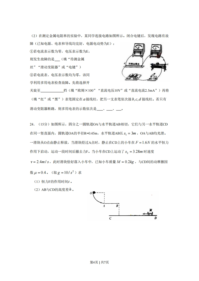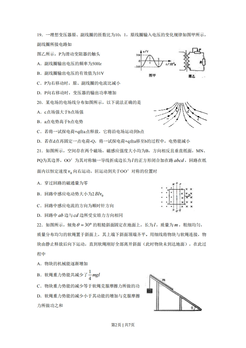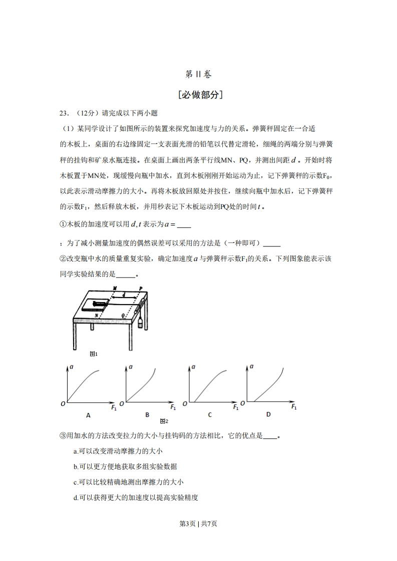 2010年普通高等学校招生全国统一考试(山东卷)理科综合物理部分第丨卷二、选择题(本题包括7小题,每小题给出的四个选项中,有的只有一个选项正确,有的有多个选项正确,全部选驻的得4分,选对但不全的得2分,有选错的得0分)16.如图甲所示,物体沿斜面由静止滑下,在水平面上滑行一段距离后停止,物体与斜面和水平面间的动摩擦因数相同,斜面与水平平滑连接。图乙中,α,∫和s分别表示物体速度大小、加速度大小、摩擦力大小和路程。图乙中正确的是图甲图Z17.如图所示,质量分虽为m1,m2的两个物体通过轻弹簧连接,在力F的作用下一起沿水平方向做匀速直线运动(m在地面,m2在空中),力F与水平方向成0角。则m,所受支持力N和摩擦力f正确的是A.N=mg+m2g-Fsin0B.N=mg+m2g-F cosC.f=fcos0D.f=Fsin018.1970年4月24日,我国自行设计、制造的第一颗人造地球卫星“东方红一号”发射成功,开创了我国航天事业的新纪元。“东方红一号”的运行轨道为椭圆轨道,其近地点M和远地点N的高度分别为439km和2384km,则A.卫星在M点的势能大于N点的势能B.卫星在M点的角速度大于N点的角速度地球C.卫星在M点的加速度大于N点的加速度D.卫星在N点的速度大于7.9km/s第1页|共7页19.一理想变压器原、副线圈的匝数比为10:1,原线圈输入电压的变化规律如图甲所示,副线圈所接电路如图乙所示,P为滑动变阻器的触头A.副线圈输出电压的频率为50HzB.副线圈输出电压的有效值为31V图甲图ZC.P为右移动时,原、副线圈的电流比减小D.P向右移动时,变压器的输出功率增加20.某电场的电场线分布如图所示,以下说法正确的是A.c点场强大于b点场强B.a点电势高于b点电势C.若将一试探电荷+q由a点释放,它将沿电场运动到b点D.若在d点再固定一点电荷-Q,将一试探电荷+q由a移至b的过程中,电势能减小21.如图所示,空间存在两个磁场,磁感应强度大小均为B,方向相反且垂直纸面,MN、PQ为其边界,OO'为其对称轴一导线折成边长为l的正方形闭合加在路abcd,回路在纸面内以恒定速度'。向右运动,叵运动到关于O0'对称的位置时A.穿过回路的磁通量为零B.回路中感应电动势大小为2BoC.回路中感应电流的方向为顺时针方向D.回路中ab边与cd边所受安培力方向相同22.如图所示,倾角0=30°的粗糙斜面固定在地面上,长为1,质量为m,粗细均匀,质量分布均匀的软绳置于斜面上,其上端下斜面顶端齐平。用细线将物块与软绳连接,物块由静止释放后向下运动,直到软绳刚好全部离开斜面(此时物块未到达地面),在此过程中A.物块的机械能逐渐增加B.软绳重力势能共减少了4mgC.物块重力势能的减少等于软绳克服摩擦力所做的功D.软绳重力势能的减少小于其动能的增加与克服摩擦力所做功之和第2页|共7页第川卷[必做部分]23.(12分)请完成以下两小题(1)某同学设计了如图所示的装置来探究加速度与力的关系。弹簧秤固定在一合适的木板上,桌面的右边缘固定一支表面光滑的铅笔以代替定滑轮,细绳的两端分别与弹簧秤的挂钩和矿泉水瓶连接。在桌面上画出两条平行线MN、PQ,并测出间距d。开始时将木板置于MN处,现缓慢向瓶中加水,直到木板刚刚开始运动为止,记下弹簧秤的示数Fo,以此表示滑动摩擦力的大小。再将木板放回原处并按住,继续向瓶中加水后,记下弹簧秤的示数F1,然后释放木板,并用秒表记下木板运动到PQ处的时间t。①木板的加速度可以用d,t表示为a=:为了减小测量加速度的偶然误差可以采用的方法是(一种即可)②改变瓶中水的质量重复实验,确定加速度a与弹簧秤示数F的关系。下列图象能表示该同学实验结果的是0A图2③用加水的方法改变拉力的大小与挂钩码的方法相比,它的优点是一。a.可以改变滑动摩擦力的大小b.可以更方便地获取多组实验数据c.可以比较精确地测出摩擦力的大小d可以获得更大的加速度以提高实验精度第3页|共7页