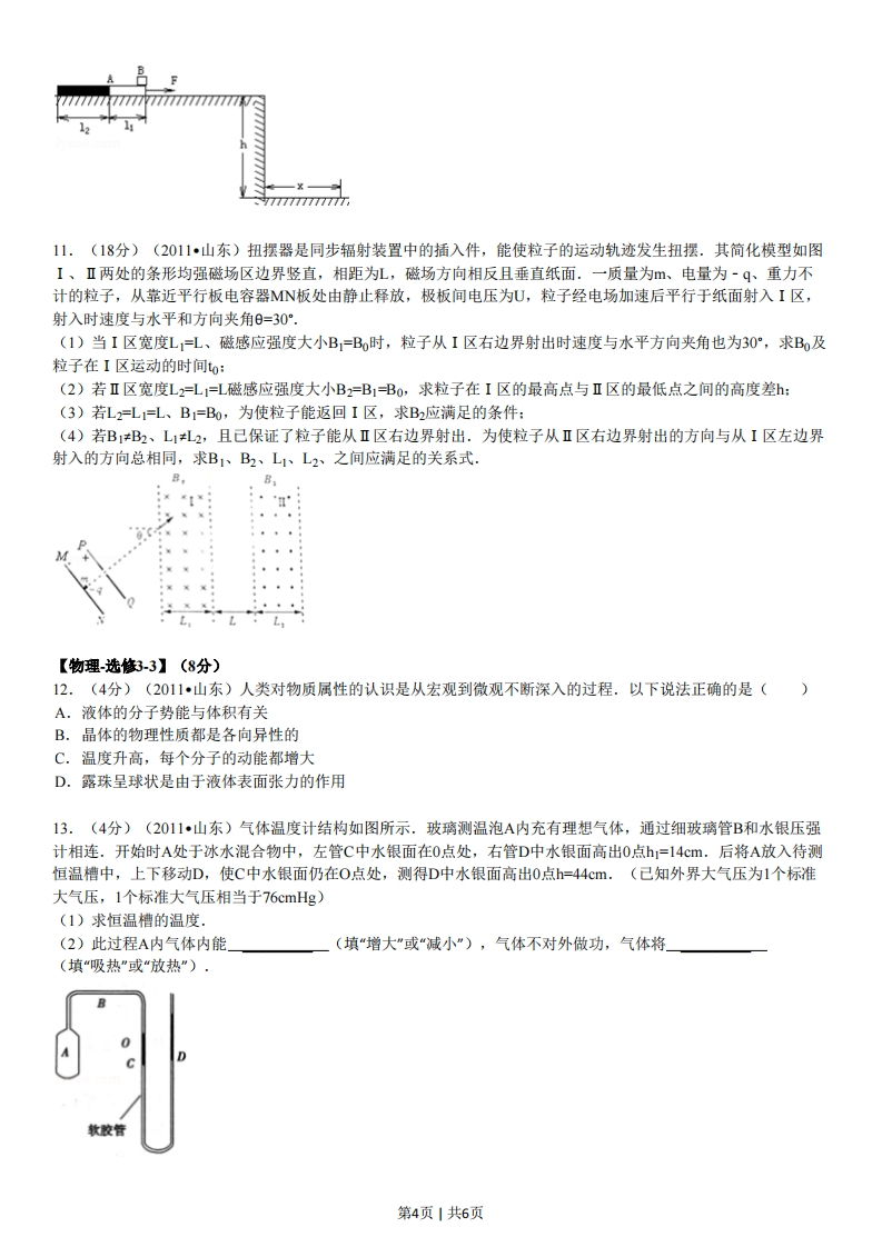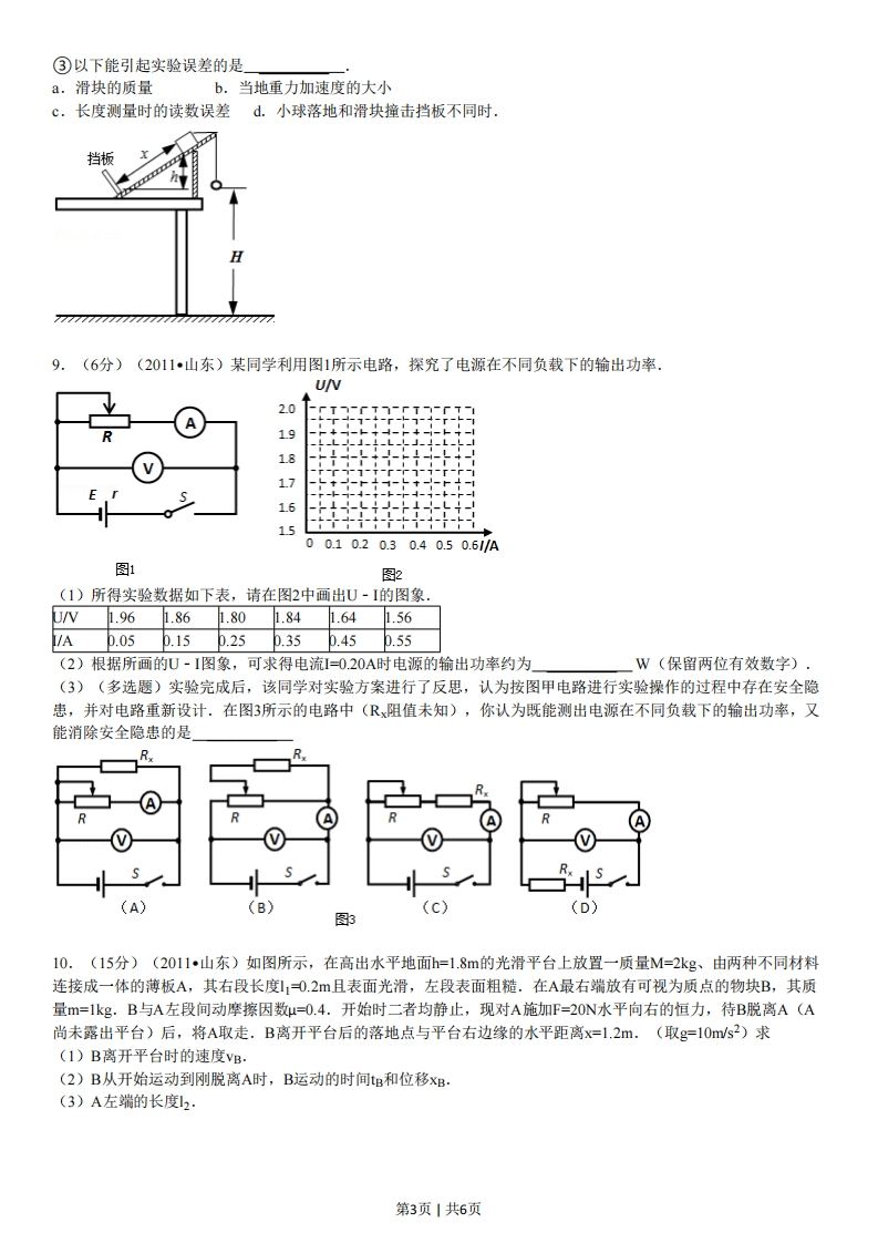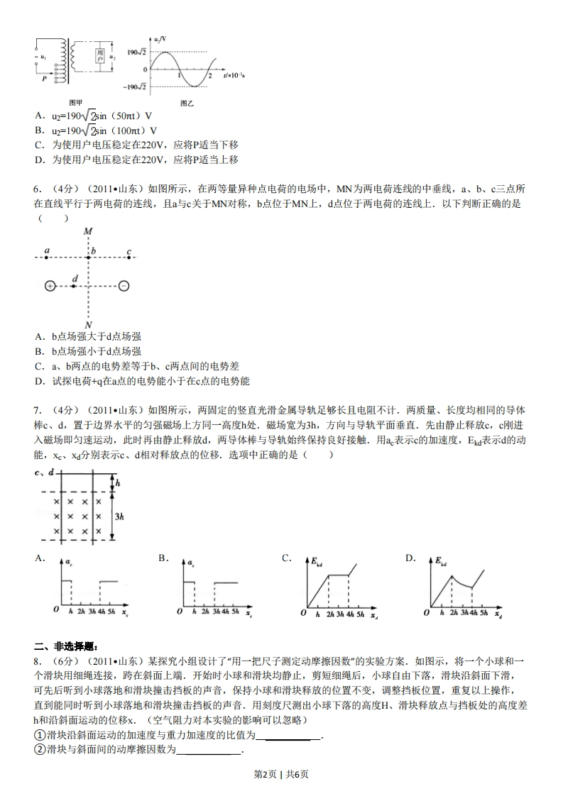 2011年山东省高考物理试卷二、选择题(本题包括7小题,每小题给出的四个选项中,有的只有一个选项正确,有的有多个选项正确,全部选对的得4分,选对但不全的得2分,有选错的得0分)1.(4分)(2011山东)了解物理规律的发现过程,学会像科学家那样观察和思考,往往比掌握知识本身更重要.以下符合事实的是()A.焦耳发现了电流热效应的规律B.库仑总结出了点电荷间相互作用的规律C.楞次发现了电流的磁效应,拉开了研究电与磁相互关系的序幕D.牛顿将斜面实验的结论合理外推,间接证明了自由落体运动是匀变速直线运动2.(4分)(2011山东)甲、乙为两颗地球卫星,其中甲为地球同步卫星,乙的运行高度低于甲的运行高度,两卫星轨道均可视为圆轨道.以下判断正确的是()A.甲的周期大于乙的周期B.乙的速度大于第一宇宙速度C.甲的加速度小于乙的加速度D.甲在运行时能经过北极的正上方3.(4分)(2011山东)如图所示,将小球a从地面以初速度vo竖直上抛的同时,将另一相同质量的小球b从距地面处由静止释放,两球恰在处相遇(不计空气阻力).则()2h●h/2A,两球同时落地B.相遇时两球速度大小相等C.从开始运动到相遇,球a动能的减少量等于球b动能的增加量D.相遇后的任意时刻,重力对球a做功功率和对球b做功功率相等4.(4分)(2011山东)如图所示,将两相同的木块、b置于粗糙的水平地面上,中间用一轻弹簧连接,两侧用细绳固定于墙壁.开始时a、b均静止.弹簧处于伸长状态,两细绳均有拉力,a所受摩擦力Fa0,b所受摩擦力F0,现将右侧细绳剪断,则剪断瞬间()77777777777777777777777777777A.F大小不变B.F鱼方向改变C.F仍然为零D.F方向向右5.(4分)(2011山东)为保证用户电压稳定在220V,变电所需适时进行调压,图甲为调压变压器示意图.保持输入电压1不变,当滑动接头P上下移动时可改变输出电压.某次检测得到用户电压2随时间t变化的曲线如图乙所示.以下正确的是()第1页1共6页190.2-190u2图甲图乙A.u2=1902sin (50nt)VB.u2=190W>in(100mt)VC.为使用户电压稳定在220V,应将P适当下移D.为使用户电压稳定在220V,应将P适当上移6.(4分)(2011山东)如图所示,在两等量异种点电荷的电场中,MN为两电荷连线的中垂线,a、b、c三点所在直线平行于两电荷的连线,且a与c关于MN对称,b点位于MN上,d点位于两电荷的连线上.以下判断正确的是()M9dNA.b点场强大于d点场强B.b点场强小于d点场强C.a、b两点的电势差等于b、c两点间的电势差D.试探电荷+q在a点的电势能小于在c点的电势能7.(4分)(2011山东)如图所示,两固定的竖直光滑金属导轨足够长且电阻不计.两质量、长度均相同的导体棒c、d,置于边界水平的匀强磁场上方同一高度h处.磁场宽为3h,方向与导轨平面垂直.先由静止释放c,c刚进入磁场即匀速运动,此时再由静止释放d,两导体棒与导轨始终保持良好接触.用a表示c的加速度,Ek侧表示d的动能,Xc、X分别表示c、d相对释放点的位移.选项中正确的是()c、dXXX××3kB.C.A2h3站4h5hx0店2h3站4h5h王O h 2h 3h 4h 5hx0h2h3站4h5h二、非选择题:8.(6分)(2011山东)某探究小组设计了“用一把尺子测定动摩擦因数”的实验方案.如图示,将一个小球和一个滑块用细绳连接,跨在斜面上端.开始时小球和滑块均静止,剪短细绳后,小球自由下落,滑块沿斜面下滑,可先后听到小球落地和滑块撞击挡板的声音,保持小球和滑块释放的位置不变,调整挡板位置,重复以上操作,直到能同时听到小球落地和滑块撞击挡板的声音.用刻度尺测出小球下落的高度H、滑块释放点与挡板处的高度差h和沿斜面运动的位移x.(空气阻力对本实验的影响可以忽略)①滑块沿斜面运动的加速度与重力加速度的比值为②滑块与斜面间的动摩擦因数为第2页1共6页③以下能引起实验误差的是a.滑块的质量b.当地重力加速度的大小c.长度测量时的读数误差d.小球落地和滑块撞击挡板不同时.挡板77777777777777777779.(6分)(2011山东)某同学利用图1所示电路,探究了电源在不同负载下的输出功率.。UN2.0-PT-厂T7-fT-fT1R1918171.61500.10.20.30.40.50.6/A图1图2(1)所得实验数据如下表,请在图2中画出U-I的图象。U/V1.961.861.801.841.64h.56I/Ap.05p.15p.25p.35p.45p.55(2)根据所画的U-I图象,可求得电流I=0.20A时电源的输出功率约为W(保留两位有效数字).(3)(多选题)实验完成后,该同学对实验方案进行了反思,认为按图甲电路进行实验操作的过程中存在安全隐患,并对电路重新设计.在图3所示的电路中(Rx阻值未知),你认为既能测出电源在不同负载下的输出功率,又能消除安全隐患的是(AX(B图310.(15分)(2011山东)如图所示,在高出水平地面h=1.8m的光滑平台上放置一质量M=2kg、由两种不同材料连接成一体的薄板A,其右段长度11O.2m且表面光滑,左段表面粗糙.在A最右端放有可视为质点的物块B,其质量m=1kg.B与A左段间动摩擦因数μ=0.4.开始时二者均静止,现对A施加F=2ON水平向右的恒力,待B脱离A(A尚未露出平台)后,将A取走.B离开平台后的落地点与平台右边缘的水平距离x=1.2m.(取g=10ms2)求(1)B离开平台时的速度vB.(2)B从开始运动到刚脱离A时,B运动的时间tB和位移xg.(3)A左端的长度12.第3页|共6页