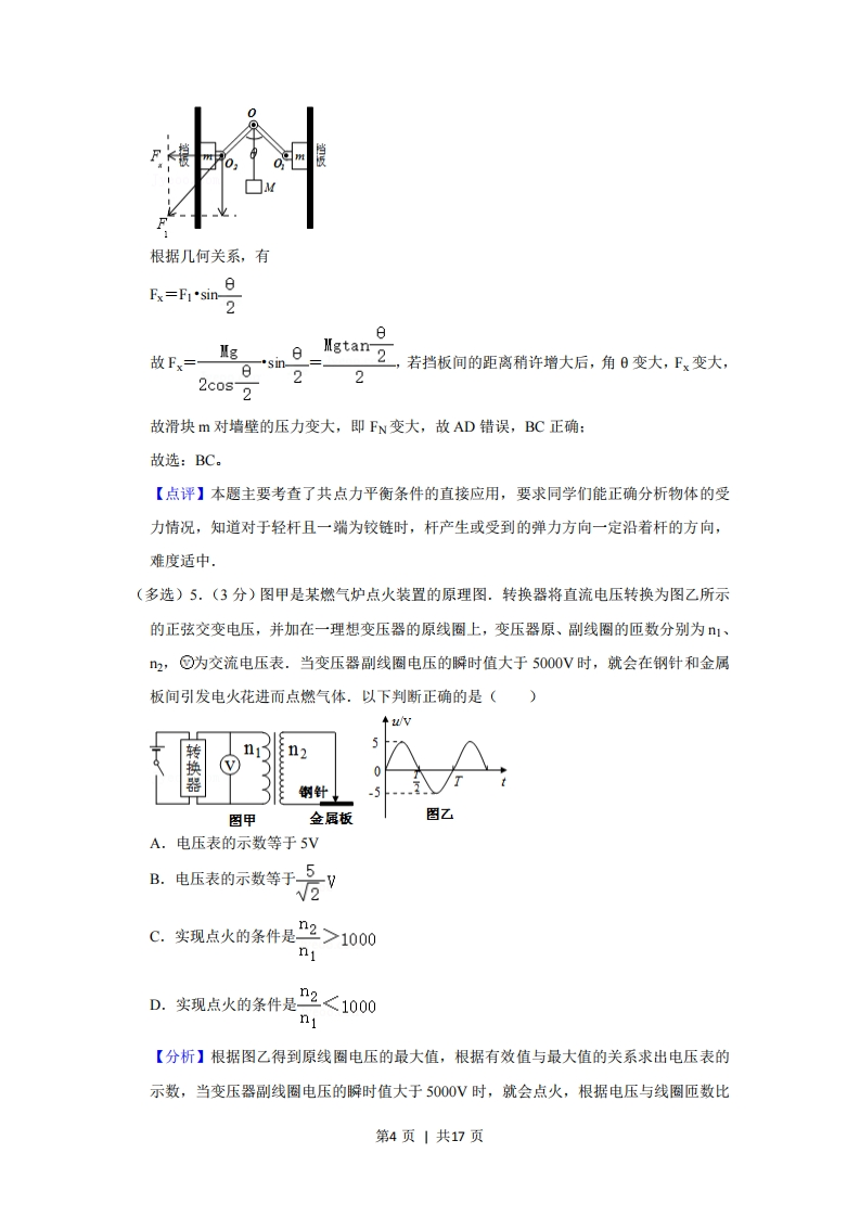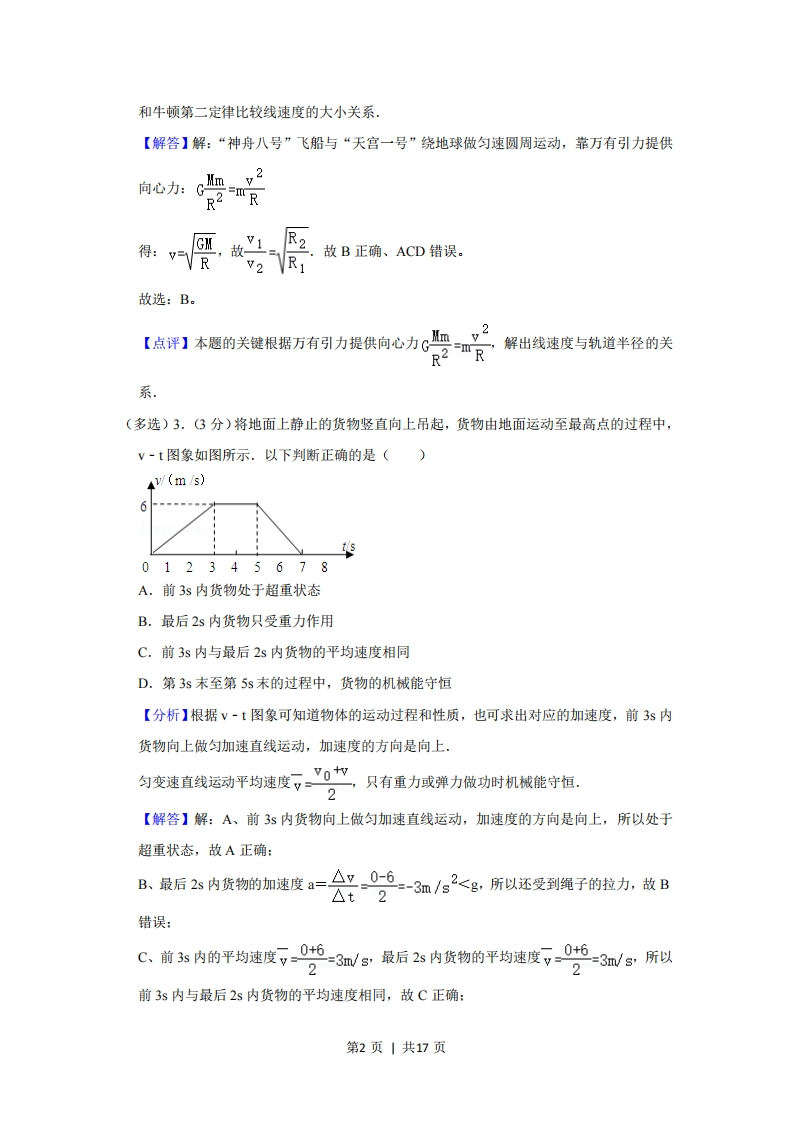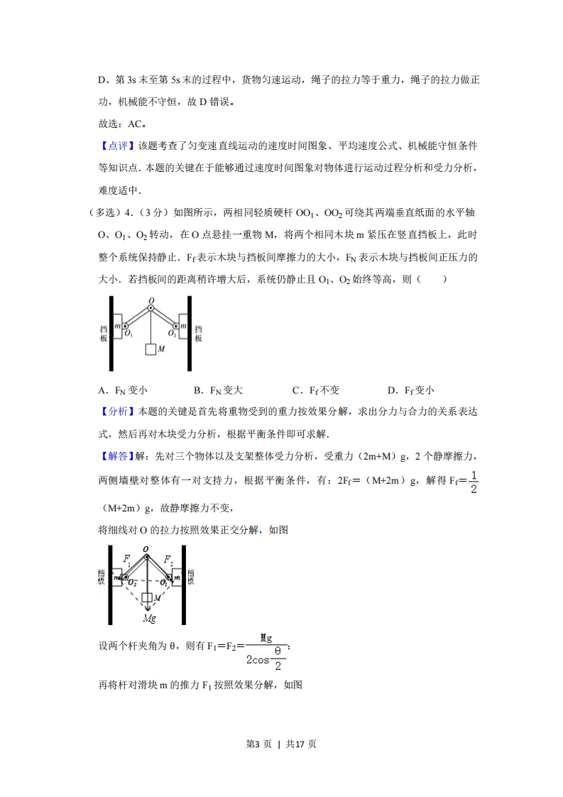 2012年山东省高考物理试卷事考答来与试想解析一、选择题(共7小题,每小题3分,满分21分)(多选)1.(3分)以下叙述正确的是()A.法拉第发现了电磁感应现象B.惯性是物体的固有属性,速度大的物体惯性一定大C.牛顿最早通过理想斜面实验得出力不是维持物体运动的原因D.感应电流遵从楞次定律所描述的方向,这是能量守恒定律的必然结果【分析】解答本题应掌握:法拉第发现了电磁感应现象:惯性是物体的固有属性,质量是惯性大小的量度.伽利略最早通过理想斜面实验得出力不是维持物体运动的原因:感应电流遵从楞次定律所描述的方向,符合能量守恒定律。【解答】解:A、1831年英国科学家法拉第发现了电磁感应现象。故A正确。B、惯性是物体的固有属性,质量是惯性大小的量度,与速度大小无关。故B错误。C、伽利略最早通过理想斜面实验得出力不是维持物体运动的原因。故C错误。D、感应电流遵从楞次定律所描述的方向,由于在电磁感应现象中,安培力是阻力,外界通过克服安培力做功,将机械能转化为电能,故楞次定律所描述的感应电流方向,这是能量守恒定律的必然结果。故D正确。故选:AD。【点评】本题考查了物理学史、惯性、楞次定律等等,要抓住惯性由物体的质量来量度,与速度无关,楞次定律符合能量守恒定律2.(3分)2011年11月3日,“神舟八号”飞船与“天宫一号”目标飞行器成功实施了首次交会对接.任务完成后“天宫一号”经变轨升到更高的轨道,等待与“神舟九号”交会对接.变轨前和变轨完成后“天宫一号”的运行轨道均可视为圆轨道,对应的轨道半径分别为R1、R2,线速度大小分别为V、2.则1等于()R2C.D.R2R图RR1【分析】天宫一号绕地球做匀速圆周运动,靠万有引力提供向心力,根据万有引力定律第1页|共17页和牛顿第二定律比较线速度的大小关系,【解答】解:“神舟八号”飞船与“天宫一号”绕地球做匀速圆周运动,靠万有引力提供向心力:v2R得:R2R故一故B正确、ACD错误。故选:B。【点评】本题的关键根据万有引力提供向心力0号三,解出线速度与轨道半径的关系(多选)3.(3分)将地面上静止的货物竖直向上吊起,货物由地面运动至最高点的过程中,V-t图象如图所示.以下判断正确的是()4以(m/s)012345678A.前3s内货物处于超重状态B.最后2s内货物只受重力作用C.前3s内与最后2s内货物的平均速度相同D.第3s末至第5s末的过程中,货物的机械能守恒【分析】根据V-1图象可知道物体的运动过程和性质,也可求出对应的加速度,前3s内货物向上做匀加速直线运动,加速度的方向是向上匀变速直线运动平均速度。v0+2一,只有重力或弹力做功时机械能守恒.【解答】解:A、前3s内货物向上做匀加速直线运动,加速度的方向是向上,所以处于超重状态,故A正确:B、最后25内货物的加速度a一公:02.3加/62<8,所以还受到绳子的拉力,故B错误:C、前3s内的平均速度v=2-3m/s,最后2s内货物的平均速度705-3/g,所以-0+62前3s内与最后2s内货物的平均速度相同,故C正确:第2页|共17页D、第3s末至第5s末的过程中,货物匀速运动,绳子的拉力等于重力,绳子的拉力做正功,机械能不守恒,故D错误。故选:AC。【点评】该题考查了匀变速直线运动的速度时间图象、平均速度公式、机械能守恒条件等知识点.本题的关键在于能够通过速度时间图象对物体进行运动过程分析和受力分析,难度适中,(多选)4.(3分)如图所示,两相同轻质硬杆O01、O02可绕其两端垂直纸面的水平轴O、O1、O2转动,在0点悬挂一重物M,将两个相同木块m紧压在竖直挡板上,此时整个系统保持静止.F表示木块与挡板间摩擦力的大小,F、表示木块与挡板间正压力的大小.若挡板间的距离稍许增大后,系统仍静止且O1、O2始终等高,则()档板A.FN变小B.FN变大C.Fr不变D.Fr变小【分析】本题的关键是首先将重物受到的重力按效果分解,求出分力与合力的关系表达式,然后再对木块受力分析,根据平衡条件即可求解【解答】解:先对三个物体以及支架整体受力分析,受重力(2+M)g,2个静摩擦力,两侧墙壁对整体有一对支持力,根据平衡条件,有:2=(M2m)8,解得F一之(M什2m)g,故静摩擦力不变,将细线对O的拉力按照效果正交分解,如图Mg设两个杆夹角为0,则有F1=F2=2c0s2再将杆对滑块m的推力F,按照效果分解,如图第3页|共17页