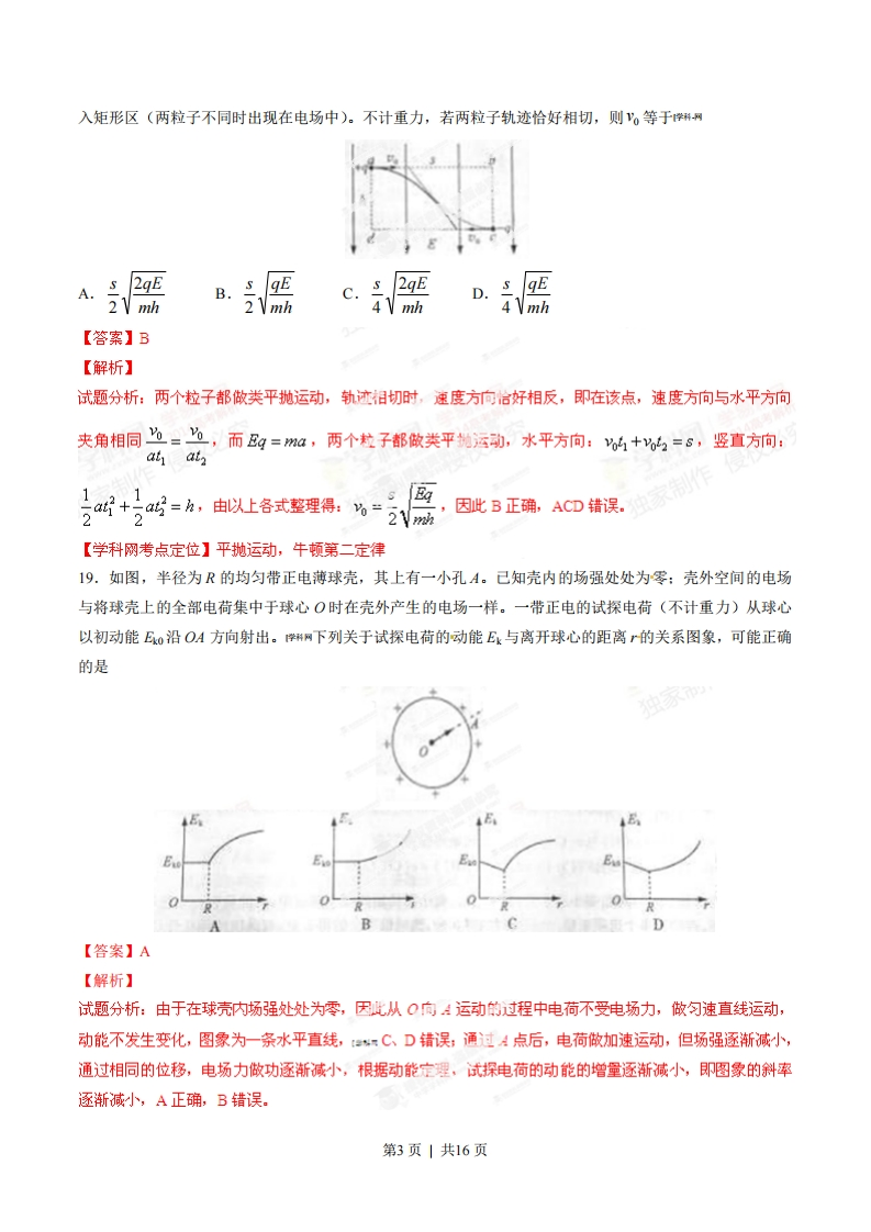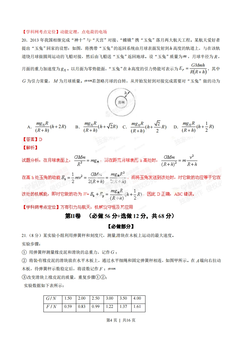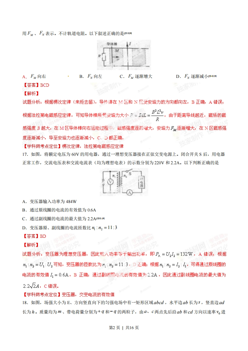2014年普通高等学校招生全国统一考试(山东卷)理科综合物理试题(110分/300分)第1卷(必做,共42分)14.如图,用两根等长轻绳将木板悬挂在竖直木桩上等高的两点,制成一简易秋千。某次维修时将两轻绳剪去一小段,但仍保持等长且悬挂点不变。木板静止时,F表示木板所受合力的大小,F2表示单根轻绳对木反拉力的大小,则维修后A.F1不变,F变大B.F1不变,F2变小C.F变大,F2变大D.F1变小,F2变小【答案】A【解析】试题分析:前后两次木板始终处于静止状态,因此前后两次木反所受合力了:都等于零,保持不变,C、D错误:绳子剪去一段后长度变短,悬挂木板时绳子与竖方向夹角日变大,将力沿水平方向和竖直方向正交分解,在竖直方向上,2凡cos日=mg,而物体的重力不艾,因此单根绳的拉力凡变大,A正确,B错误。【学科网考点定位】:共点力的平衡,力的分解15.一质点在外力作用下做直线运动,其速度"随时间1变化的图象如图。在图中标出的时刻中,质点所受合外力的方向与速度方向相同的有A.41B.12C.D.t zxxk【答案】AC【解析】试题分析:如果质点所受合力的方向与速度方向相同,物体做加速运动:合力的方向与速度方向相反,物体做减速运动。在与1、乡时刻,速度都在不断增加,因此合力的方向与速度方向相同,A、C正确k,而在2、t4时刻,速度在不断减小,合力的方向与速度方向相反,B、D错误。【学科网考点定位】v-t图象16.如图,一端接有定值电阻的平行金属轨道固定在水平面内,通有恒定电流的长直绝缘导线垂直并紧靠轨道固定,导体棒与轨道垂直且接触良好。在向右匀速通过M、N两区的过程中,导体棒所受安培力分别第1页|共16页用FM、FN表示。不计轨道电阻。以下叙述正确的是学网A.FM向右B.FN向左C.FM逐渐增大D.F,逐渐减小学科网【答案】BCD【解析】试题分析:根据楞次定律(来拒去留),导体棒在M区和N区支安培力的方向都向左,B正确,A错误;根据法拉第电磁感应定律,可知导体棒所号安培力大小疗=3L=乃,由于距离导线越近,磁场的磁R感强度B越大,在M区导体棒向右运动过程中,磁感强度逐着增大,安培力FM逐渐增大,在N区磁感强度逐渐减小,导至安培力也逐渐减小,C、D都正确。【学科网考点定位】楞次定律,法拉第电磁感应定律17.如图,将额定电压为60V的用电器,通过一理想变压器接在正弦交变电源上。闭合开关S后,用电器正常工作,交流电压表和交流电流表(均为理想电表)的示数分别为220V和2.2A。以下判断正确的是A.变压器输入功率为484WB.通过原线圈的电流的有效值为0.6AC.通过副线圈的电流的最大值为2.2A1学科网D.变压器原、副线圈的电流匝数比n:n2=11:3【答案】BD【解析】试题分析:变压器为理想变压器,因此输八功率等于输出功率,即P=U22=132W,A错误;根据名:为2=八:,可知,变压器的匝数此为”:=11:3,D正确,根据%:2=12:,可得通过原线圈的电流的有效值(1=0.6A,B正确:通过副线圈电流的有效值为2.2A,因此通过副线圈电流的最大值为2.22A,C错误.【学科网考点定位】变压器,交变电流的有放值18.如图,场强大小为E、方向竖直向下的匀强电场中有一矩形区域abcd,水平边ab长为s,竖直边ad长为h。质量均为m、带电荷量分别为+q和一q的两粒子,由a、c两点先后沿ab和cd方向以速率'。进第2页|共16页入矩形区(两粒子不同时出现在电场中)。不计重力,若两粒子轨迹恰好相切,则等于学利网A.2gEB.C.s 2gED.2mh2 mh4mh【答案】B【解析】试题分析:两个粒子都做类平抛运动,轨迹相切时,速度方向信好相反,即在该点,速度方向与水平方向夹角相同也=,而E4=m,两个粒子都做类平抛运动,水平方向:4+w2=s,竖直方向:atat+时=,由以让含式整理得:为-11因此B正确,ACD错误。2V mit【学科网考点定位】平抛运动,牛顿第二定律19.如图,半径为R的均匀带正电薄球壳,其上有一小孔A。己知壳内的场强处处为零:壳外空间的电场与将球壳上的全部电荷集中于球心O时在壳外产生的电场一样。一带正电的试探电荷(不计重力)从球心以初动能Eo沿OA方向射出。学科网下列关于试探电荷的动能Ek与离开球心的距离r的关系图象,可能正确的是【答案】A【解析】试题分析:由于在球壳内场强处处为零,因此从O向A运动的过程中电荷不受电场力,做匀速直线运动,动能不发生变化,图象为一条水平直线,C、D错误,通过A点后,电荷做加速运动,但场强逐渐减小,通过相同的位移,电场力做功逐渐减小,根据动能定理,试探电荷的动能的增量逐渐减小,即图象的斜率逐渐减小,A正确,B错误。第3页|共16页