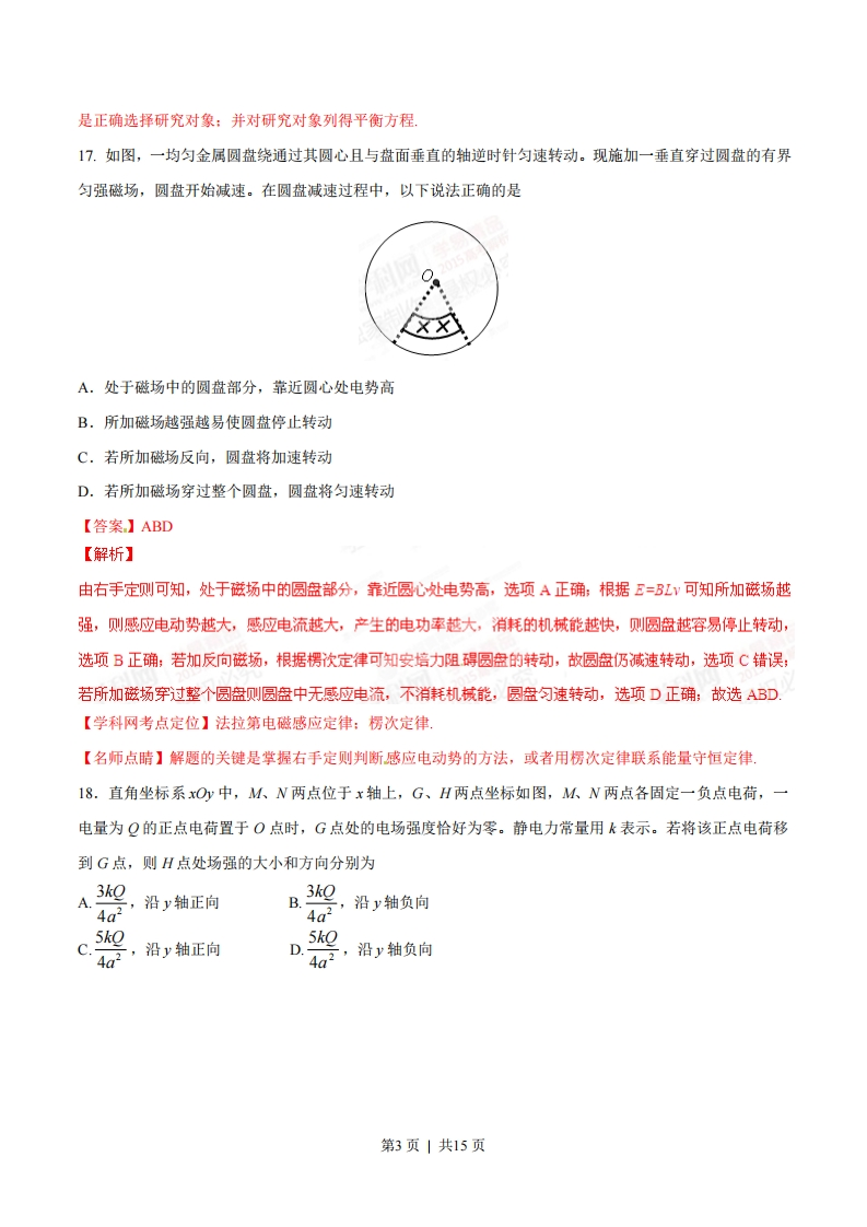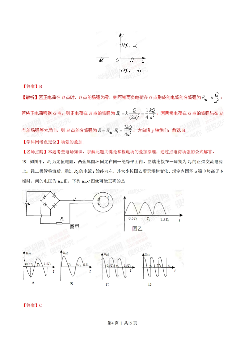 2015年普通高等学校招生全国统一考试(山东卷)理科综合物理部分试题二、选择题(共7小题,每小题6分,共42分:每小题给出的四个选项中,有的只有一个选项正确,有的有多个选项正确,全部选对的得6分,选对但不全的得3分,有选错的得0分)14.距地面高5m的水平直轨道A、B两点相距2m,在B点用细线悬挂一小球,离地高度为h,如图。小车始终以4m/s的速度沿轨道匀速运动,经过A点时将随车携带的小球由轨道高度自由卸下,小车运动至B点时细线被轧断,最后两球同时落地。不计空气阻力,取重力加速度的大小g=10m/s2。可求得h等于A.1.25m。B.2.25mC.3.75mD.4.75m【答案】A2H【解析】小车上的物体落地的时间5小车从A到B的时间5,=d,小球下落的时间飞根据题意可得时间关系为:1=+,即2H d解得=1.25m,选项A正确g v g【学科网考点定位】自由落体运动【名师点晴】本题考查自由落体运动,要求考生分段分析,难度较小。此题考查自由落体运动规律的应用,只要抓住时间相等的关系即可解题15.如图,拉格朗日点L1位于地球和月球连线上,处在该点的物体在地球和月球引力的共同作用下,可与月球一起以相同的周期绕地球运动。据此,科学家设想在拉格朗日点L建立空间站,使其与月球同周期绕地球运动。以,4、42分别表示该空间站和月球向心加速度的大小,4表示地球同步卫星向心加速度的大小。以下判断正确的是第1页|共15页月球地球A.a2>a3>a1B.a2>41>aC.a3>41>4D.a43>a2>a【答案】D【解析】因空间站建在拉格朗日点,故周期等于月球的周期,根据α=4π2了分可知,>a:对空间站和地GM可知球的同步卫星而言,因同步卫星周期小于空间站的周期则,同步卫星的轨道半径较小,根据α=,>2,故选项D正确。【学科网考点定位】万有引力定律的应用【名师点晴】此题考查了万有引力定律的应用,意在考查考生的理解能力和分析能力:关键是知道拉格朗日点与月球周期的关系以及地球同步卫星的特点,16.如图,滑块A置于水平地面上,滑块B在一水平力作用下紧靠滑块A(A、B接触面竖直),此时A恰好不滑动,B刚好不下滑。己知A与B间的动摩擦因数为山,A与地面间的动摩擦因数为山2,最大静摩擦力等于滑动摩擦力。A与B的质量之比为BAA.1B.1-442C1+4D.2+4424142412442442【答案】B【解析】物体AB整体在水平方向受力平衡,由平衡条件可得:F=巧(m县+m多)g;对物体B在竖直方向平衡有:4F=mg;联立解得:=1二4凸,选项B正确视8药马2【学科网考点定位】物体的平衡【名师点睛】本题考查手里分析、物体的平衡和摩擦力等知识点,意在考查考生的理解能力。解题的关键第2页|共15页是正确选择研究对象:并对研究对象列得平衡方程17.如图,一均匀金属圆盘绕通过其圆心且与盘面垂直的轴逆时针匀速转动。现施加一垂直穿过圆盘的有界匀强磁场,圆盘开始减速。在圆盘减速过程中,以下说法正确的是A.处于磁场中的圆盘部分,靠近圆心处电势高B.所加磁场越强越易使圆盘停止转动C.若所加磁场反向,圆盘将加速转动D.若所加磁场穿过整个圆盘,圆盘将匀速转动【答案】ABD【解析】由右手定则可知,处于磁场中的圆盘部分,靠近圆心处电势高,选项A正确:根据E=BLy可知所加磁场越强,则感应电动势越大,感应电流越大,产生的电功率越大,消耗的机械能越快,则圆盘越容易停止转动,选项B正确;若加反向磁场,根据楞次定律可知安培力阻碍圆盘的转动,故圆盘仍减速转动,选项C错误;若所加磁场穿过整个圆盘则圆盘中无感应电流,不消耗机械能,圆盘匀速转动,选项D正确;故选ABD【学科网考点定位】法拉第电磁感应定律:楞次定律【名师点睛】解题的关键是掌握右手定则判断感应电动势的方法,或者用楞次定律联系能量守恒定律18.直角坐标系xOy中,M、N两点位于x轴上,G、H两点坐标如图,M、N两点各固定一负点电荷,一电量为Q的正点电荷置于O点时,G点处的电场强度恰好为零。静电力常量用k表示。若将该正点电荷移到G点,则H点处场强的大小和方向分别为3kQA.沿y轴正向3koB.,沿y轴负向4a24a25kO5kOC4a产,沿y轴正向4a产,沿y轴负向D第3页|共15页