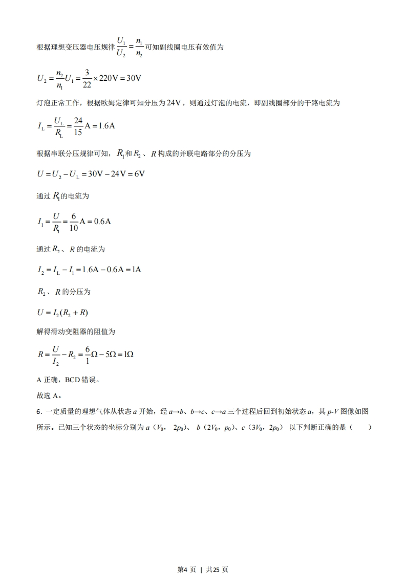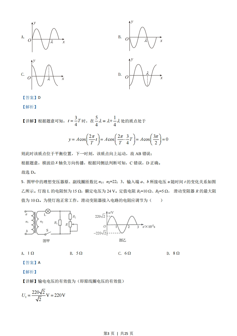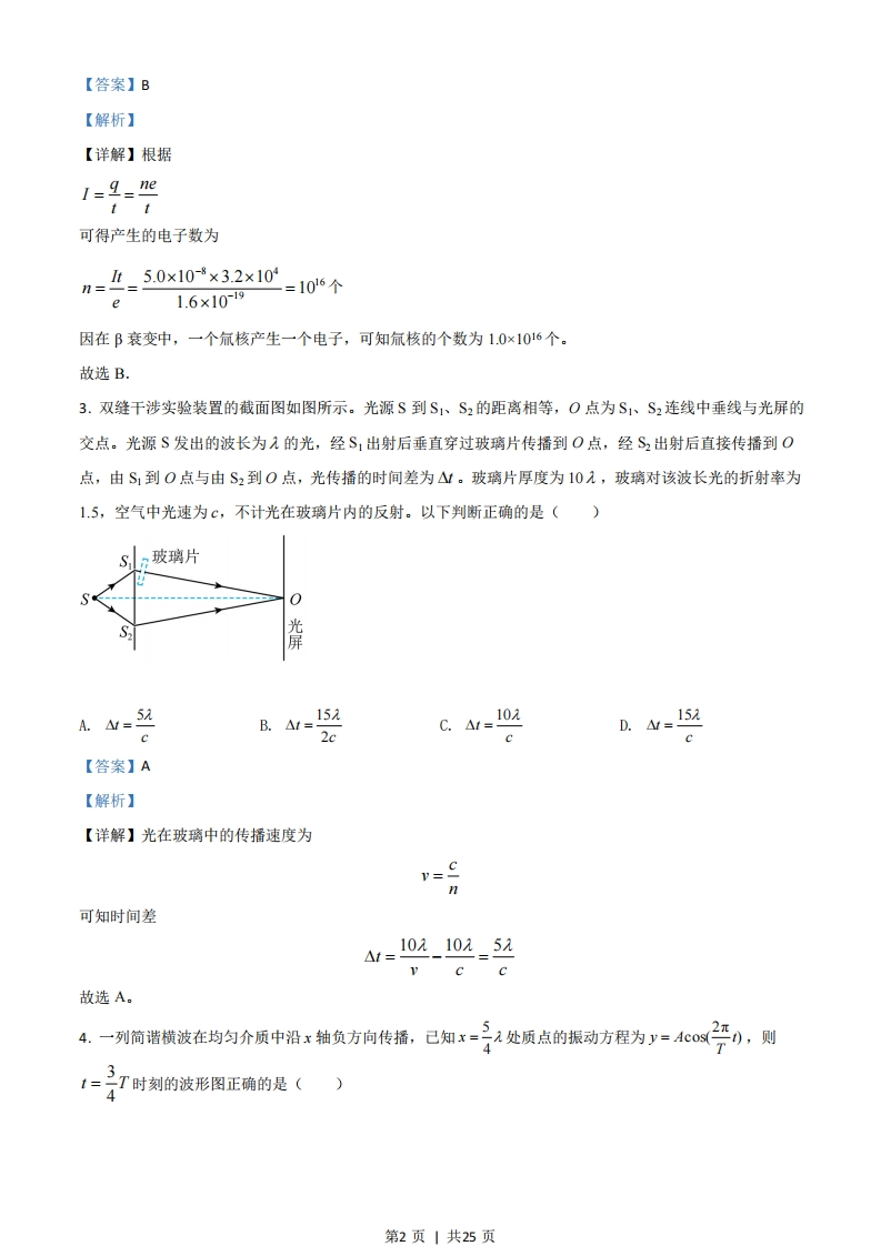 山东省2020年普通高中学业水平等级考试物理试题注意事项:1答卷前,考生务必将自已的姓名、考生号等填写在答题卡和试卷指定位置。2.回答选择题时,选出每小题答案后,用铅笔把答题卡上对应题目的答案标号涂黑。如需改动,用橡皮擦干净后,再选涂其他答案标号。回答非选择题时,将答案写在答题卡上。写在本试卷上无效。3.考试结束后,将本试卷和答题卡一并交回。一、单项选择题本题共8小题,每小题3分,共24分。每小题只有一个选项符合题目要求。1.一质量为m的乘客乘坐竖直电梯下楼,其位移s与时间t的关系图像如图所示。乘客所受支持力的大小用FN表示,速度大小用v表示。重力加速度大小为g。以下判断正确的是()○A.0-时间内,v增大,FN>mgB.t2时间内,v减小,FNmg【答案】D【解析】【详解】A.由于s-图像的斜率表示速度,可知在04时间内速度增加,即乘客的加速度向下,处于失重状态,则FNmg,选项C错误,D正确:故选D。2.氚核H发生B衰变成为氨核H。假设含氚材料中H发生B衰变产生的电子可以全部定向移动,在3.2×10s时间内形成的平均电流为5.0×108A。己知电子电荷量为1.6×10-19C,在这段时间内发生B衰变的氚核H的个数为()A.5.0×104B.1.0×106C.2.0×106D.1.0×108第1页1共25页【答案】B【解析】【详解】根据I=9_net 1可得产生的电子数为-h_5.0×10-8×3.2×10n=-=1016个1.6×10-19因在B衰变中,一个氚核产生一个电子,可知氚核的个数为1.0x1016个。故选B.3.双缝干涉实验装置的截面图如图所示。光源S到S1、S2的距离相等,O点为S1、S2连线中垂线与光屏的交点。光源S发出的波长为入的光,经S1出射后垂直穿过玻璃片传播到O点,经S2出射后直接传播到O点,由S,到O点与由S2到O点,光传播的时间差为△1。玻璃片厚度为10入,玻璃对该波长光的折射率为1.5,空气中光速为c,不计光在玻璃片内的反射。以下判断正确的是()S,玻璃片0S屏AM=52B.4r=15AC.41=102D.M=152【答案】A【解析】【详解】光在玻璃中的传播速度为v=9可知时间差△r=102-101=52故选A。横波在均匀介质中沿x轴负方向传播,已知x=二2处质点的振动方程为y=A©0s3时刻的波形图正确的是()第2页1共25页【答案】D【解析】据题意可知,口打时,在2三什九处的y=4om学4asg7)4om()-0则此时该质点位于平衡位置,下一时刻,该质点向上运动,故AB错误:根据题意,横波沿x轴负方向传播,根据同侧法判断可知,C错误,D正确。故选D。5.图甲中的理想变压器原、副线圈匝数比1:2=22:3,输入端a、b所接电压4随时间t的变化关系如图乙所示。灯泡L的电阻恒为152,额定电压为24V。定值电阻R1=102、R=52,滑动变阻器R的最大阻值为10Ω。为使灯泡正常工作,滑动变阻器接入电路的电阻应调节为()220W2-2202图甲图乙A.12B.52C.6D.82【答案】A【解析】【详解】输电电压的有效值为(即原线圈电压的有效值)U,=220a5y=220v第3页1共25页