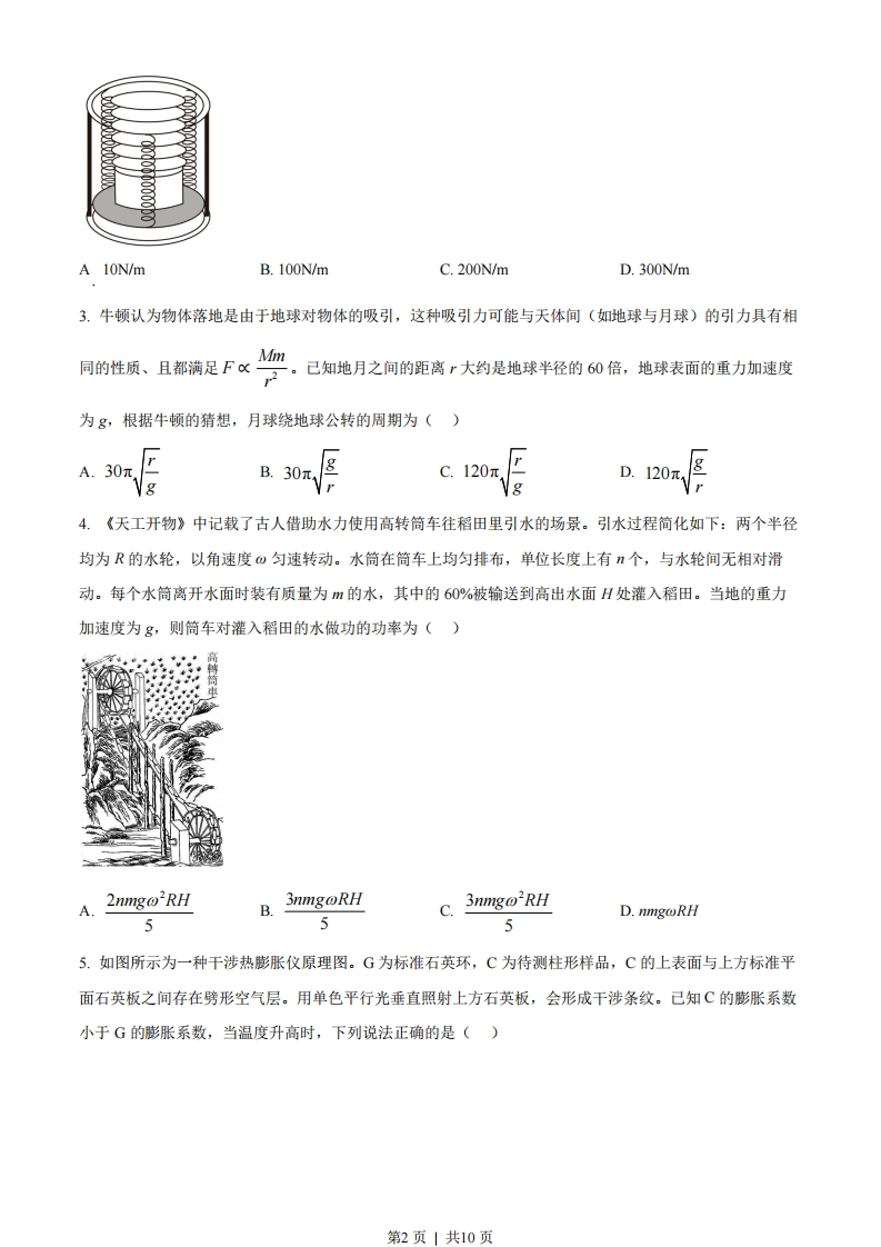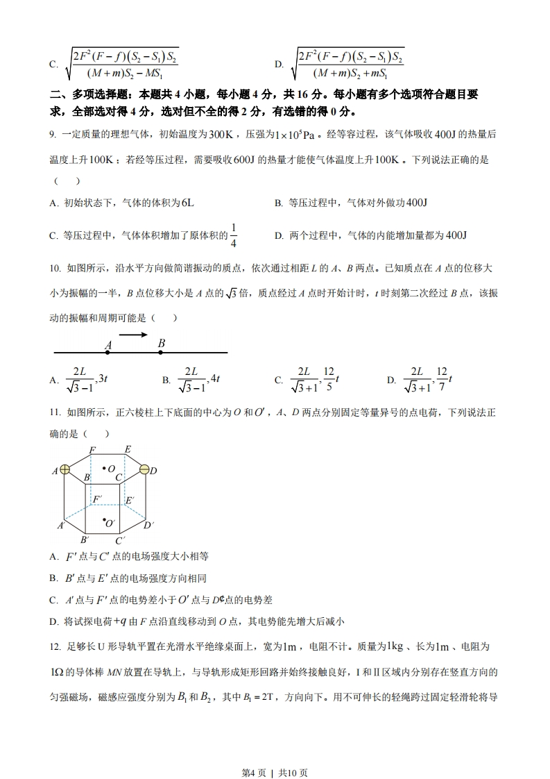 2023年全省普通高中学业水平等级考试物理注意事项:1.答卷前,考生务必将自己的姓名、考生号等填写在答题卡和试卷指定位置。2。回答选择题时,选出每小题答案后,用铅笔把答题卡上对应题目的答案标号涂黑。如需改动,用橡皮擦干净后,再选涂其他答案标号。回答非选择题时,将答案写在答题卡上写在本试卷上无效。3.考试结束后、将本试卷和答题卡一并交回。一、单项选释题:本题共8小题,每小题3分,共24分。每小题只有一个选项符合题目要求。1.“梦天号”实验舱携带世界首套可相互比对的冷原子钟组发射升空,对提升我国导航定位、深空探测等技术具有重要意义。如图所示为某原子钟工作的四能级体系,原子吸收频率为0的光子从基态能级I跃迁至激发态能级Ⅱ,然后自发辐射出频率为的光子,跃迁到钟跃迁的上能级2,并在一定条件下可跃迁到钟跃迁的下能级1,实现受激辐射,发出钟激光,最后辐射出频率为3的光子回到基态。该原子钟产生的钟激光的频率2为()钟激光1A.%++3B.Vo+V1-V3C.Vo-1+3D.o--32.餐厅暖盘车的储盘装置示意图如图所示,三根完全相同的弹簧等间距竖直悬挂在水平固定圆环上,下端连接托盘。托盘上叠放若干相同的盘子,取走一个盘子,稳定后余下的正好升高补平。己知单个盘子的质量为300g,相邻两盘间距1.0cm,重力加速度大小取10m/s2。弹簧始终在弹性限度内,每根弹簧的劲度系数为()第1页」共10页A 10N/mB.100N/mC.200N/mD.300N/m3.牛顿认为物体落地是由于地球对物体的吸引,这种吸引力可能与天体间(如地球与月球)的引力具有相同的性质、且都满足F∝Mm己知地月之间的距离大约是地球半径的60倍,地球表面的重力加速度为g,根据牛顿的猜想,月球绕地球公转的周期为()30元B.30πgC.120元D.120元4.《天工开物》中记载了古人借助水力使用高转筒车往稻田里引水的场景。引水过程简化如下:两个半径均为R的水轮,以角速度@匀速转动。水筒在筒车上均匀排布,单位长度上有”个,与水轮间无相对滑动。每个水筒离开水面时装有质量为m的水,其中的60%被输送到高出水面H处灌入稻田。当地的重力加速度为g,则筒车对灌入稻田的水做功的功率为()2nmgo'RH3nmgoRH3nmgo'RHD.nmgoRH5555.如图所示为一种干涉热膨胀仪原理图。G为标准石英环,C为待测柱形样品,C的上表面与上方标准平面石英板之间存在劈形空气层。用单色平行光垂直照射上方石英板,会形成干涉条纹。己知C的膨胀系数小于G的膨胀系数,当温度升高时,下列说法正确的是()第2页」共10页GA.劈形空气层的厚度变大,条纹向左移动B.劈形空气层的厚度变小,条纹向左移动C.劈形空气层的厚度变大,条纹向右移动D.劈形空气层的厚度变小,条纹向右移动6.如图所示,电动公交车做匀减速直线运动进站,连续经过R、S、T三点,己知ST间的距离是RS的两倍,RS段的平均速度是10m/s,ST段的平均速度是5ms,则公交车经过T点时的瞬时速度为()RT72777777777777777177777A.3m/sB.2m/sC.1m/sD.0.5m/s7.某节能储能输电网络如图所示,发电机的输出电压U1=250V,输出功率500kW。降压变压器的匝数比n:4=50:1,输电线总电阻R=62.52。其余线路电阻不计,用户端电压U4=220V,功率88kW,所有变压器均为理想变压器。下列说法正确的是()0用R0电U机储A.发电机的输出电流为368AB.输电线上损失的功率为4.8kWC.输送给储能站的功率为408kWD.升压变压器的匝数比m1:2=1:448.质量为M的玩具动力小车在水平面上运动时,牵引力F和受到的阻力∫均为恒力,如图所示,小车用一根不可伸长的轻绳拉着质量为m的物体由静止开始运动。当小车拖动物体行驶的位移为S时,小车达到额定功率,轻绳从物体上脱落。物体继续滑行一段时间后停下,其总位移为S,。物体与地面间的动摩擦因数不变,不计空气阻力。小车的额定功率P%为()77mM777777777777777777777777777772F2(F-f)(S2-S)S2F2(F-f)(S2-S)SB.(M+m)S2-MS(M+m)S2-mS第3页1共10页