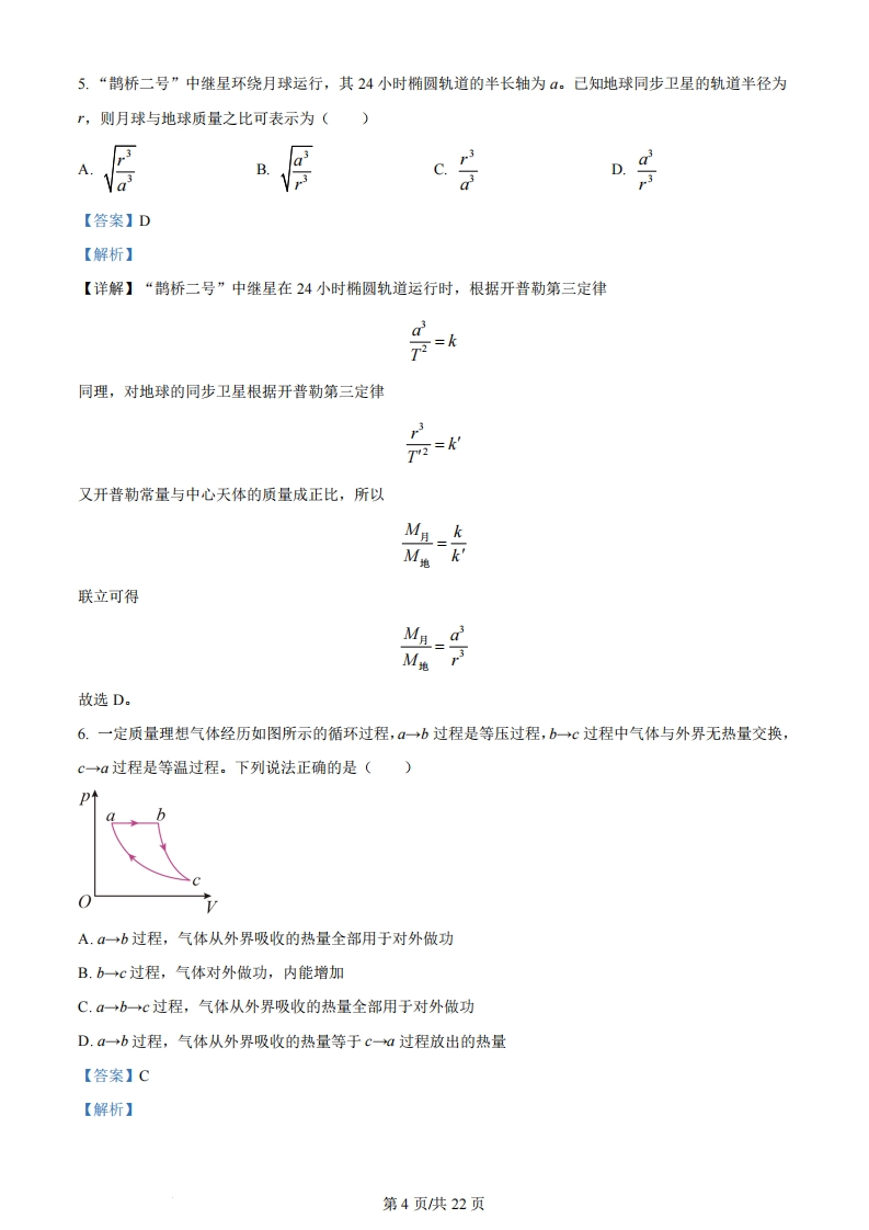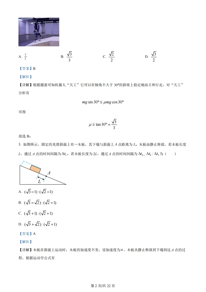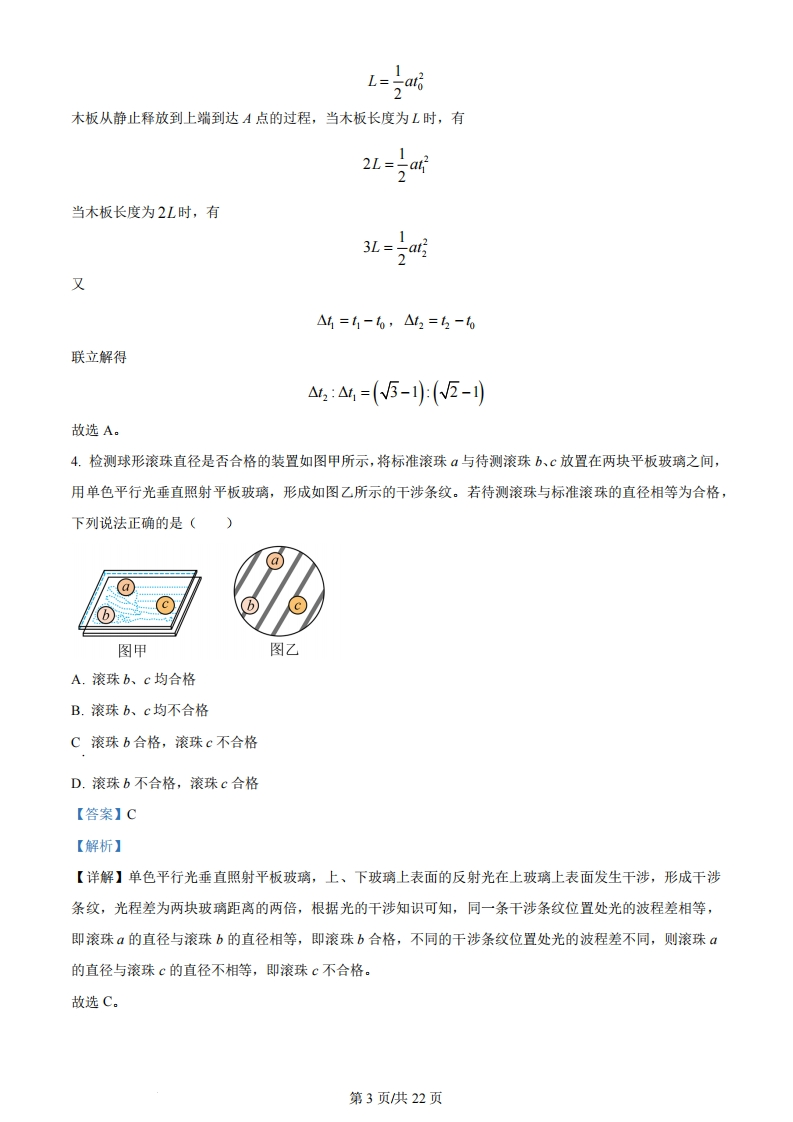 2024年全省普通高中学业水平等级考试物理注意事项:1.答卷前,考生务必将自己的姓名、考生号等填写在答题卡和试卷指定位置。2.回答选择题时,选出每小题答案后,用铅笔把答题卡上对应题目的答案标号涂黑。如需改动,用橡皮擦干净后,再选涂其他答案标号。回答非选择题时,将答案写在答题卡上。写在本试卷上无效。3.考试结束后,将本试卷和答题卡一并交回。一、单项选择题:本题共8小题,每小题3分,共24分。每小题只有一个选项符合题目要求。1.2024年是中国航天大年,神舟十八号、嫦娥六号等己陆续飞天,部分航天器装载了具有抗干扰性强的核电池.已知Sr衰变为Y的半衰期约为29年,Pu衰变为数U的半衰期约87年,现用相同数目的S:0和测Pu各做一块核电池,下列说法正确的是()A.8Sr衰变为Y时产生a粒子B.38Pu衰变为2U时产生B粒子C.50年后,剩余的8Sr数目大于28Pu的数目D.87年后,剩余的8Sr数目小于Pu的数目【答案】D【解析】【详解】A.根据质量数守恒和电荷数守恒可知S衰变为Y时产生电子,即B粒子,故A错误:B.根据质量数守恒和电荷数守恒可知2Pu衰变为U时产生He,,即a粒子,故B错误:CD.根据题意可知23Pu的半衰期大于8Sr的半衰期,现用相同数目的0Sr和238Pu各做一块核电池,经过相同的时间,Sr经过的半衰期的次数多,所以0Sr数目小于2Pu的数目,故D正确,C错误。故选D。2.如图所示,国产人形机器人“天工”能平稳通过斜坡。若它可以在倾角不大于30°的斜坡上稳定地站立和行走,且最大静摩擦力等于滑动摩擦力,则它的脚和斜面间的动摩擦因数不能小于()第1页供22页A.号B.3cD.5322【答案】B【解析】【详解】根据题意可知机器人“天工”它可以在倾角不大于30的斜坡上稳定地站立和行走,对“天工”分析有ng sin30°≤mg cos30°可得4≥tan30°=的3故选B。3.如图所示,固定的光滑斜面上有一木板,其下端与斜面上A点距离为L。木板由静止释放,若木板长度L,通过A点的时间间隔为△1:若木板长度为2L,通过A点的时间间隔为△2.△5:△1,为()A.(5-1):(2-1)B.(5-√5):(5-)C.(5+1):(2+1)D.(5+√2):(N2+1)【答案】A【解析】【详解】木板在斜面上运动时,木板的加速度不变,设加速度为,木板从静止释放到下端到达A点的过程,根据运动学公式有第2页供22页1=2a6木板从静止释放到上端到达A点的过程,当木板长度为L时,有2L=a21当木板长度为2L时,有3L=Tal2又△4=t1-6,△12=5-0联立解得△2:M=5-1(V5-1故选A。4.检测球形滚珠直径是否合格的装置如图甲所示,将标准滚珠α与待测滚珠b、c放置在两块平板玻璃之间,用单色平行光垂直照射平板玻璃,形成如图乙所示的干涉条纹。若待测滚珠与标准滚珠的直径相等为合格,下列说法正确的是()b图甲图乙A.滚珠b、c均合格B.滚珠b、c均不合格C滚珠b合格,滚珠c不合格D.滚珠b不合格,滚珠c合格【答案】C【解析】【详解】单色平行光垂直照射平板玻璃,上、下玻璃上表面的反射光在上玻璃上表面发生干涉,形成干涉条纹,光程差为两块玻璃距离的两倍,根据光的干涉知识可知,同一条干涉条纹位置处光的波程差相等,即滚珠α的直径与滚珠b的直径相等,即滚珠b合格,不同的干涉条纹位置处光的波程差不同,则滚珠α的直径与滚珠c的直径不相等,即滚珠c不合格。故选C。第3页供22页