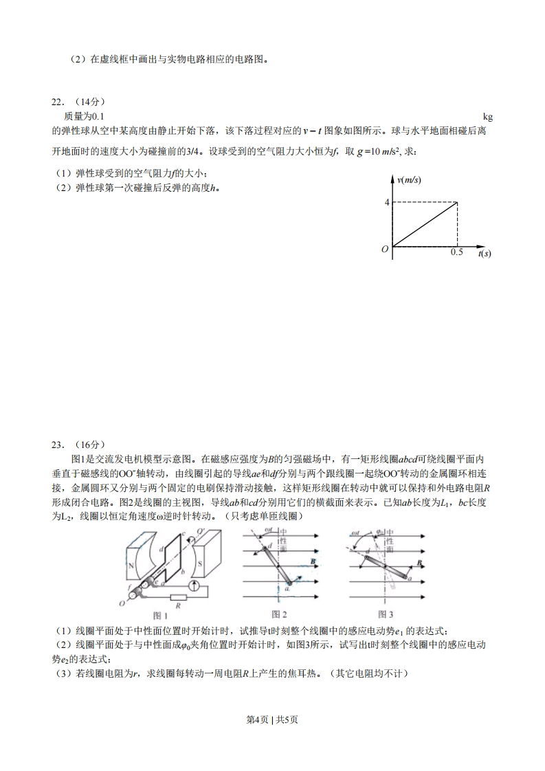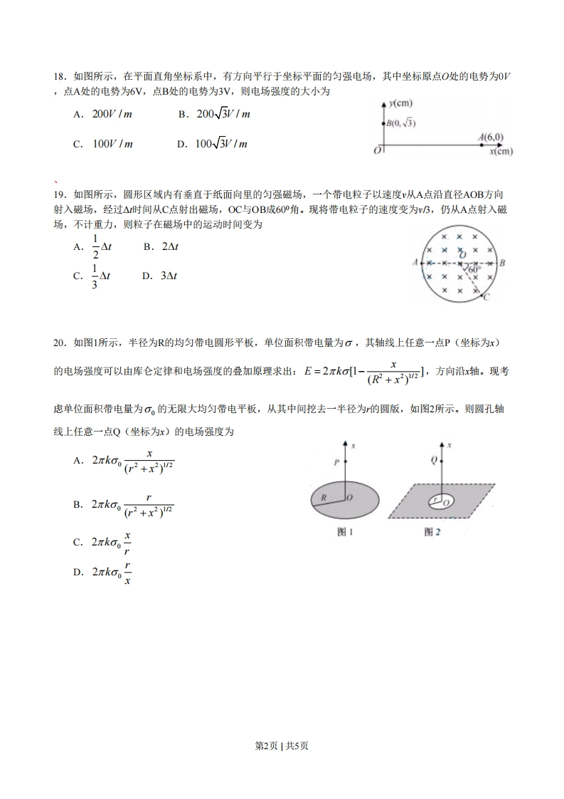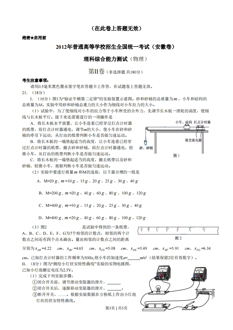 2012年普通高等学校招生全国统一考试(安徽卷)理科综合能力测试(物理)第I卷(选择题共120分)本卷共20小题,每小题6分,共120分。在每小题给出的四个选项中,只有一项是符合题目要求的。14.我国发射的“天宫一号”和“神州八号”在对接前,“天宫一号”的运行轨道高度为350km,“神州八号”的运行轨道高度为343km。它们的运行轨道均视为圆周,则A.“天宫一号”比“神州八号”速度大B.“天宫一号”比“神州八号”周期大C.“天宫一号”比“神州八号”角速度大D.“天宫一号”比“神州八号”加速度大4(m)15.一列简谐横波沿x轴正方向传播,在t=0s时波形如图1所示,己知波速为10ms,则t=0.1s时正确的波形是图2中的1.020.04.0x(m)图14m)4(m4m)4(m)02.03.40xm)0102.03.04.0xm1.02.304.003.04.0xmA.BC.D图216.如图所示,在竖直平面内有一个半径为R的圆弧轨道。半径OA水平、OB不竖直,一个质量为m的小球自A正上方P点由静止开始自由下落,小球沿轨道到达最高点B时恰好对轨道没有压力,己知AP=-2R,重力加速度为g,则小球从P到B的运动过程中BA.重力做功2mgRB.机械能减少mgRC.合外力做功mgRD.克服摩擦力做功二gR217.如图所示,放在固定斜面上的物块以加速度a沿斜面匀加速下滑,若在物块上再施加一个竖直向下的恒力F,则A.物块可能匀速下滑B.物块将以加速度a匀加速下滑C.物块将以大于a的加速度匀加速下滑D.物块将以小于a的加速度匀加速下滑7777777777777777777777777777第1页|共5页18.如图所示,在平面直角坐标系中,有方向平行于坐标平面的匀强电场,其中坐标原点O处的电势为0V,,点A处的电势为6V,点B处的电势为3V,则电场强度的大小为◆cm)A.200V/mB.200N3V/m1B0.v5)D.1003V/m4A6.0)c.100V/mx(cm)19.如图所示,圆形区域内有垂直于纸面向里的匀强磁场,一个带电粒子以速度v从A点沿直径AOB方向射入磁场,经过△时间从C点射出磁场,OC与OB成60角。现将带电粒子的速度变为v3,仍从A点射入磁场,不计重力,则粒子在磁场中的运动时间变为1XXXA.5△tB.2△t1C.-△tD.3△t320.如图1所示,半径为R的均匀带电圆形平板,单位面积带电量为σ,其轴线上任意一点P(坐标为x)的电场强度可以由库仑定律和电场强度的叠加原理求出:E=2πko[1(R+r],方向沿轴。现考虑单位面积带电量为O。的无限大均匀带电平板,从其中间挖去一半径为的圆版,如图2所示。则圆孔轴线上任意一点Q(坐标为x)的电场强度为A.2nkco(B.2πkoo2+x2)严C.2rkoX图1图2D.27koox第2页|共5页(在此卷上答题无效)绝密★启用前2012年普通高等学校招生全国统一考试(安徽卷)理科综合能力测试(物理)第Ⅱ卷(非选择题共180分)考生注意事项:请用0.5毫米黑色墨水签字笔在答题卡上作答,在试题卷上答题无效。21.(18分)I.(10分)图1为“验证牛顿第二定律”的实验装置示意图。砂和砂桶的总质量为m,小车和砝码的总质量为M。实验中用砂和砂桶总重力的大小作为细线对小车拉力的大小。(1)试验中,为了使细线对小车的拉力等于小车所受的合外力,先调节长木板一滑轮的高度,使细线与长木板平行。接下来还需要进行的一项操作是A.将长木板水平放置,让小车连着己经穿过打点计时器小车、砖码打点计时器的纸带,给打点计时器通电,调节m的大小,使小车在砂和砂桶的牵引下运动,从打出的纸带判断小车是否做匀速运动。B.将长木板的一端垫起适当的高度,让小车连着己经穿接交流电源过打点计时器的纸带,撤去砂和砂桶,给打点计时器通电,轻砂、砂桶推小车,从打出的纸带判断小车是否做匀速运动。图1C.将长木板的一端垫起适当的高度,撤去纸带以及砂和砂桶,轻推小车,观察判断小车是否做匀速运动。(2)实验中要进行质量m和M的选取,以下最合理的一组是A.M=20g,m=10g、15g、20g、25g、30g、40gB.M=200g,m=20g、40g、60g、80g、100g、120gC.M=400g,m=10g、15g、20g、25g、30g、40gD.M=400g,m=20g、40g、60g、80g、100g、120g(3)图2是试验中得到的一条纸带,D EA、B、C、D、E、F、G为7个相邻的计数点,相邻的两个计数点之间还有四个点未画出。量出相邻的计数点之间的距离图2分别为S4B=4.22cm、SBc=4.65cm、ScD=5.08cm、Sps=5.49cm、SBF=5.91c1、5rG-6.34cm。己知打点计时器的工作频率为50Hz,则小车的加速度」ms2(结果保留2位有效数字)。Ⅱ.(8分)图为“测绘小灯伏安特性曲线”实验的实物电路图,已知小灯泡额定电压为2.5V.(1)完成下列实验步骤:①闭合开关前,调节滑动变阻器的滑片,②闭合开关后,逐渐移动变阻器的滑片,③断开开关,…。根据实验数据在方格纸上作出小灯泡灯丝的伏安特性曲线。第3页|共5页