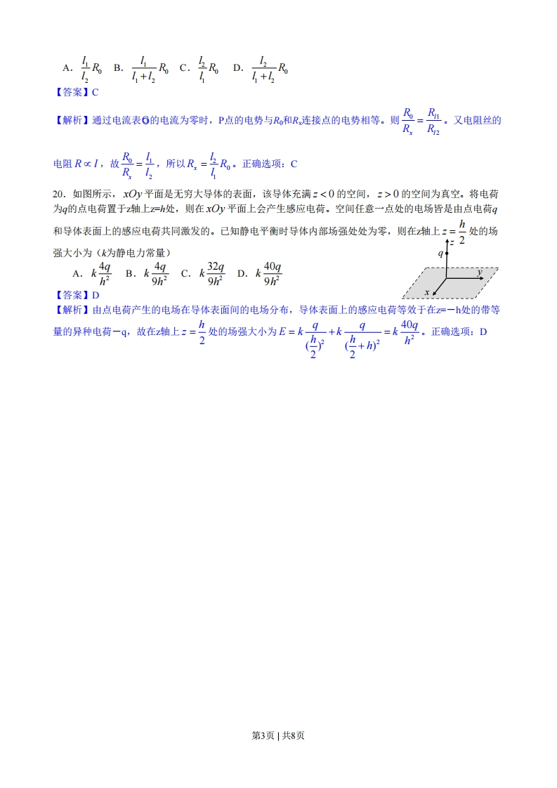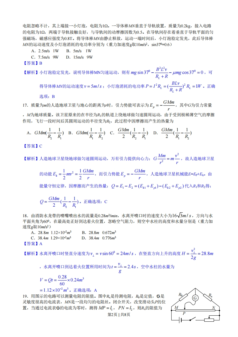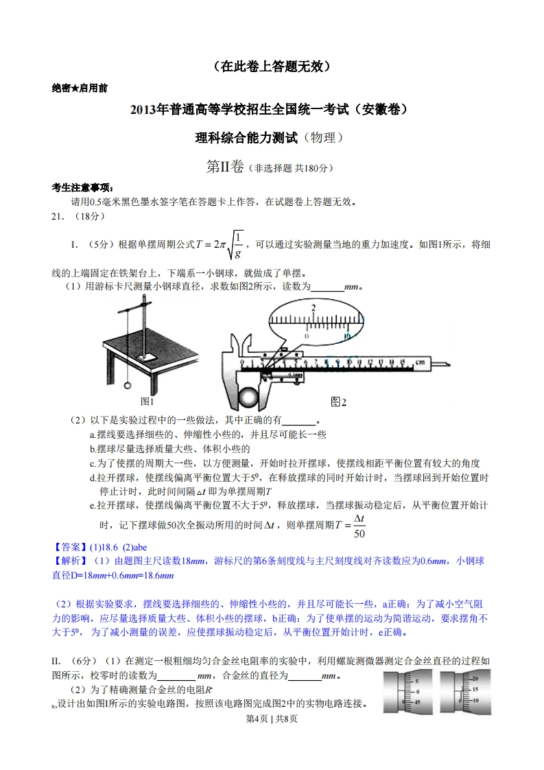 绝密★启用前2013年普通高等学校招生全国统一考试(安徽卷)理科综合能力测试(物理)本试卷分第I卷(选择题)和第Ⅱ卷(非选择题)两部分,第I卷第1页至第5页,第Ⅱ卷第6页至第12页。全卷满分300分,时间150分钟。考生注意事项:1、答题前,务必在试题卷,答题卡规定的地方填写自己的姓名、座位号,并认真核对答题卡上所粘贴的条形码中姓名、座位号与本人姓名、座位号是否一致。务必在答题卡背面规定的地方填写姓名和座位号后两位。2、答第I卷时,每小题选出答案后,用2B铅笔把答题卡上对应题目的答案标号涂黑。如需改动,用橡皮擦干净后,再选涂其他答案标号。3、答第Ⅱ卷时,必须使用0.5毫米的黑色墨水签字笔在答题卡上书写,要求字体工整、笔迹清晰。作图题可先用铅笔在答题卡规定的位置绘出,确认后再用0.5毫米的黑色墨水签字笔描清楚。必须在题号所指示的答题区域作答,超出答题区域书写的答案无效,在试题卷、草稿纸上答题无效。4、考试结束后,务必将试题卷和答题卡一并上交。第I卷(选择题共120分)本卷共20小题,每小题6分,共120分。在每小题给出的四个选项中,只有一项是符合题目要求的。14.如图所示,细线的一端系一质量为m的小球,另一端固定在倾角为的光滑斜面体项端,细线与斜面平行。在斜面体以加速度a水平向右做匀加速直线运动的过程中,小球始终静止在斜面上,小球受到细线的拉力T和斜面的支持力FN分别为(重力加速度为g)A.T=m(g sin0+acos)Fy =m(g cos-asin)B.T=m(g cos0+asin)Fy =m(gsin0-acos)C.T=m(a cos0-gsine)Fy =m(gcos0+asin)D.T=m(asin0-g cos)Fy =m(g sin0+acos0)7777777777【答案】A【解析】小球受力如图,根据牛顿第二定律:沿斜面方向有T-ng sin=macos0:垂直于斜面方向上有mg cos0-Fw=masin 0mg解得:T=m(gsin0+acos0):F=m(gcos0-asin)77777777777777777777③a正确选项:A15.图中a、b、c、d为四根与纸面垂直的长直导线,其横截面积位于正方形的四个顶点上,导线中通有大小相等的电流,方向如图所示。一带正电◆O0b的粒子从正方形中心O点沿垂直于纸面的方向向外运动,它所受洛伦兹力的方向是A.向上B.向下C.向左D.向右Oc【答案】B【解析】根据右手安培定则可判定O点磁感应强度的方向水平向左,根据左手定则可判定:一带正电的粒子从正方形中心O点沿垂直于纸M面的方向向外运动,它所受洛伦兹力的方向是向下。正确选项:小灯泡B16.如图所示,足够长平行金属导轨倾斜放置,倾角为37°,宽度为0.5m,1370第1页1共8页电阻忽略不计,其上端接一小灯泡,电阻为12。一导体棒MW垂直于导轨放置,质量为02kg,接入电路的电阻为1Ω,两端于导轨接触良好,与导轨间的动摩擦因数为0.5。在导轨间存在着垂直于导轨平面的匀强磁场,磁感应强度为0.8T。将导体棒W由静止释放,运动一端时间后,小灯泡稳定发光,此后导体棒MW的运动速度及小灯泡消耗的电功率分别为(重力加速度g取10ml/s2,sin37-0.6)A.2.5m/s 1W B.5m/s 1WC.7.5m/s 9W D.15m/s 9W【答案】B【解析】小灯泡稳定发光,说明导体棒MN匀速运动,则有mg sin37_B产-4m1gc0s370=0,可R,+R得导体棒的运动速度=5m1s:小灯泡消耗的电功率P=PR=(B》R,=1W,正确R+R选项:BGMm17.质量为m的人造地球卫星与地心的距离为时,引力势能可表示为E。=一,其中G为引力常量,M为地球质量。该卫星原来的在半径为R1的轨道上绕地球做匀速圆周运动,由于受到极稀薄空气的摩擦作用,飞行一段时间后其圆周运动的半径变为,此过程中因摩擦而产生的热量为A.GMm(-)B.Ghm11、R,R【答案】C【解析】人造地球卫星绕地球做匀速圆周运动,万有引力提供向心力:GM=,1v22=m一,故人造地球卫星的动能E=m2=11 GMm,人造地球卫星机械能E=En+Ek。由2,而引力势能E。=-G伽能量守恒定律,因摩擦而产生的热量:Q=E,-E2=(Ek1+Ep1)-(E2+E2)代入R和R2得:0=GMm 112R R)。正确选项:C18.由消防水龙带的喷嘴喷出水的流量是0.28m/mim,水离开喷口时的速度大小为16√3m/s,方向与水平面夹角为60°,在最高处正好到达着火位置,忽略空气阻力,则空中水柱的高度和水量分别是(重力加速度g取10mmls2)A.28.8m1.12×10-2m3B.28.8m0.672m3C.38.4m1.29×1023D.38.4m0.776m3【答案】A【解析】水离开喷口时竖直分速度为y,=vsin60°=24m/s,在竖直方向上升的高度H=足=28.8m2g,水离开喷口到达着火位置所用时间为1==2.45,空中水柱的水量为g0.28V=Ot=-×0.24m60=1.12×10-2m3。正确选项:A19.用图示的电路可以测量电阻的阻值。图中R是待测电阻,R是定值,6是Ro灵敏度很高的电流表,MW是一段均匀的电阻丝。闭合开关,改变滑动头P的位置,当通过电流表G的电流为零时,测得MP=I,PN=,则Rx的阻值为第2页|共8页A.Ro B.Rc.号12+12RD.1+1,【答案】C【解析】通过电流表6的电流为零时,P点的电势与R和R连接点的电势相等。则飞_B1。又电阻丝的RR2电阻RocI,故尽-上,所以几=兰R,正确选项:CR1220.如图所示,xOy平面是无穷大导体的表面,该导体充满z<0的空间,z>0的空间为真空。将电荷为q的点电荷置于z轴上=h处,则在xOy平面上会产生感应电荷。空间任意一点处的电场皆是由点电荷q和导体表面上的感应电荷共同激发的。已知静电平衡时导体内部场强处处为零,则在轴上:=处的场↑2强大小为(k为静电力常量)9A祭B骆CD.&40g9h29h2【答案】D【解析】由点电荷产生的电场在导体表面间的电场分布,导体表面上的感应电荷等效于在z=一处的带等量的异种电荷一4,故在2轴上:=么处的场强大小为E=k9+k9一=k404。正确选项:D2h22第3页|共8页