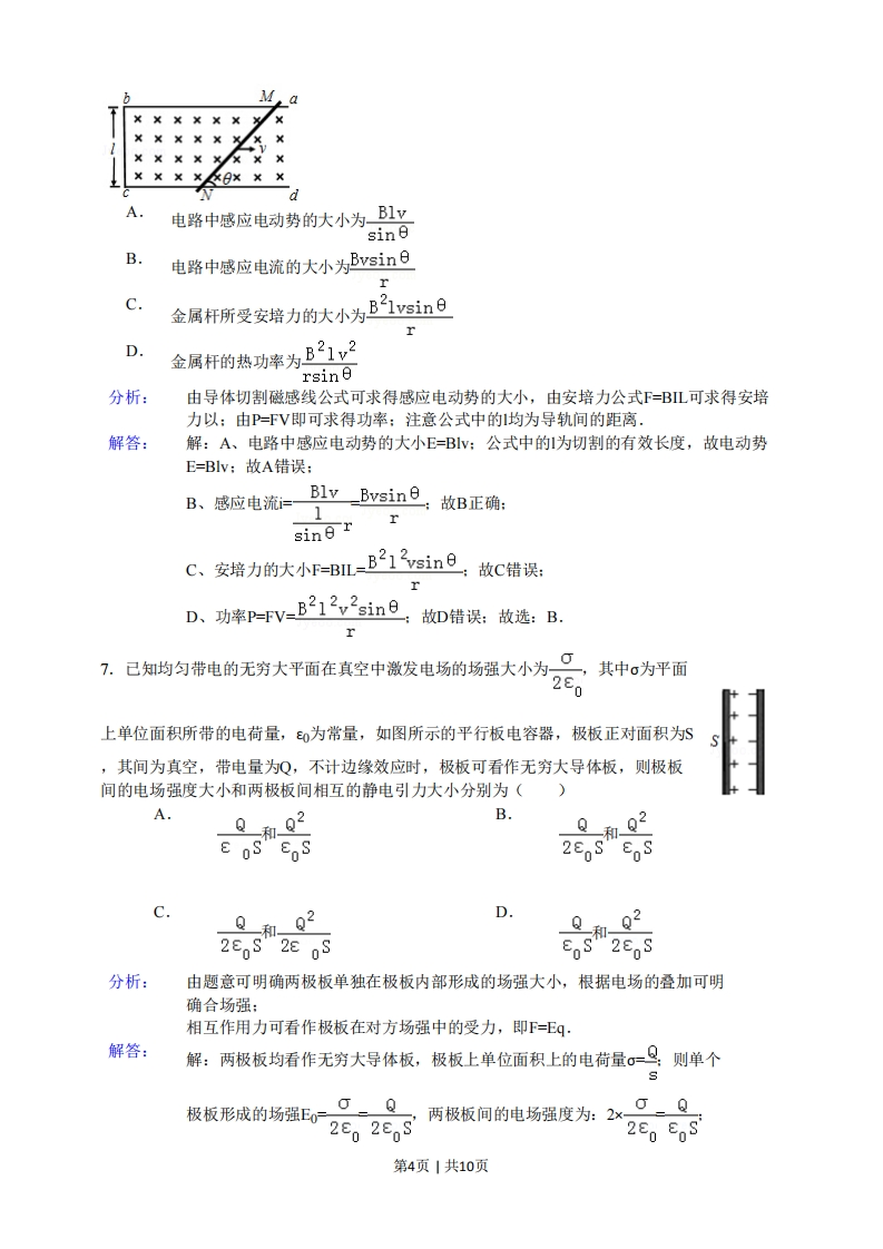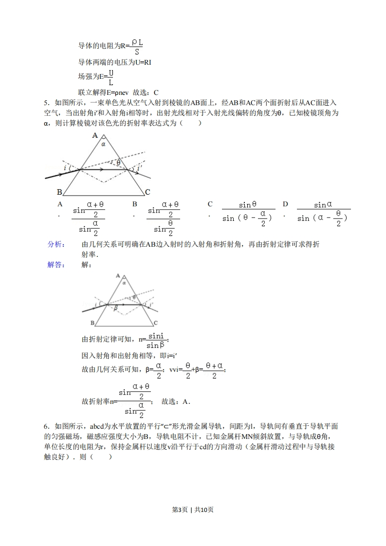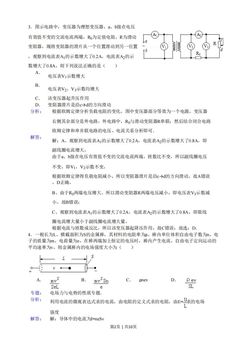 2015年安徽高考物理试卷参考容案与试题解析一.选择题(共7小题)1.如图示是a粒了(氨原子核)被重金属原子核散射的运动轨迹,M、N、P、Q是轨迹上的四点,在散射过程中可以认为重金属原子核静止不动.图中所标出的α粒子在各点处的加速度方向正确的是()a粒子VoM。重金属原子核A.M点B.N点C.P点D.Q点分析:根据粒子轨迹的弯曲方向,可以判定粒子受力的方向:再根据受力的方向,判定α粒子在电场中运动时,粒子的加速度的方向.解答:解:根据轨迹弯曲的方向,可以判定粒子受力的方向大体向上,与粒子和重金属原子核的点的连线的方向相反,故M、N、P、Q是轨迹上的四点的加速度的方向中,只有P点标出的方向是正确的.故选:C2.由库仑定律可知,真空中两个静止的点电荷,带电量分别为q1和q2,其间距离为时,它们之间相互作用力的大小为F=k9192,式中k为静电力常量.若用国际单位制的基本单位表示,k的单位应为()A.kg.A2.m3kg.A-2.m3.s-4C.Dkg*m2.C-2N.m2.A-2分析:力学单位制规定了物理量的单位,同时根据物理量间的公式也可以分析单位之间的关系解答:解:根据Fk91可得:k=Fr241q22由于F=ma,qt,所以k=ar12t2根据质量的单位是kg,加速度的单位/s2,距离的单位是m,电流的单位是A,时间的单位s,可得k的单位是kgA2m3s4故选:B第1页|共10页3.图示电路中,变压器为理想变压器,a、b接在电压有效值不变的交流电流两端,Ro为定值电阻,R为滑动变阻器,现将变阻器的滑片从一个位置滑动到另一位置R,观察到电流表A]的示数增大了02A,电流表A2的示数增大了0.8A,则下列说法正确的是()A·电压表V1示数增大B.电压表V2,V3示数均增大C.该变压器起升压作用D.变阻器滑片是沿c→d的方向滑动分析:根据欧姆定律分析负载电阻的变化,图中变压器部分等效为一个电源,变压器右侧其余部分是外电路,外电路中,R,与滑动变阻器R串联:然后结合闭合电路欧姆定律和串并联电路的电压、电流关系分析即可.解答:解:A、观察到电流表A]的示数增大了02A,电流表A2的示数增大了0.8A,即副线圈电流增大,由于a、b接在电压有效值不变的交流电流两端,匝数比不变,所以副线圈电压不变,即V1,V2示数不变,根据欧姆定律得负载电阻减小,所以变阻器滑片是沿C→d的方向滑动,故A错误,D正确B、由于Ro两端电压增大,所以滑动变阻器R两端电压减小,即电压表V3示数减小,故B错误:C、观察到电流表A]的示数增大了0.2A,电流表A2的示数增大了0.8A,即原线圈电流增大量小于副线圈电流增大量,根据电流与匝数成反比,所以该变压器起降压作用,故C错误:故选:D.4.一根长为L、横截面积为S的金属棒,其材料的电阻率为P,棒内单位体积自由电子数为,电子的质量为m,电荷量为e,在棒两端加上恒定的电压时,棒内产生电流,自由电子定向运动的平均速率为y,则金属棒内的电场强度大小为()A.mv2SnC.pnevD.pev2eLSL专题:电场力与电势的性质专题.分析:利用电流的微观表达式求的电流,由电阻的定义式求的电阻,由E=求的电场L强度解答:解:导体中的电流为=neSv第2页|共10页导体的电阻为R=PL导体两端的电压为U=RI肠强E联立解得E=pnev故选:C5,如图所示,一束单色光从空气入射到棱镜的AB面上,经AB和AC两个面折射后从AC面进入空气,当出射角'和入射角相等时,出射光线相对于入射光线偏转的角度为,己知棱镜顶角为α,则计算棱镜对该色光的折射率表达式为()AABAQ+日Ba+日Csin日Dsinasin 2sin (e-asin (a-sin 2sin 2分析:由几何关系可明确在AB边入射时的入射角和折射角,再由折射定律可求得折射率.解答:解:A由折射定律可知,n=sinisinB因入射角和出射角相等,即=故由几何关系可知,B=Ci=。B=日+a,22a+日故折射率n=sin 2a:故选:A.sin 26.如图所示,abcd为水平放置的平行"c”形光滑金属导轨,间距为l,导轨间有垂直于导轨平面的匀强磁场,磁感应强度大小为B,导轨电阻不计,己知金属杆N倾斜放置,与导轨成θ角,单位长度的电阻为,保持金属杆以速度v沿平行于cd的方向滑动(金属杆滑动过程中与导轨接触良好).则()第3页1共10页