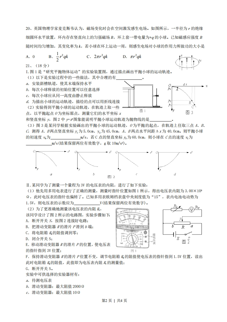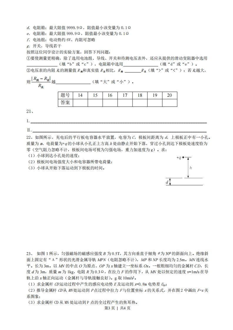 2014年高考安徽理综物理试题姓名学号14、在科学研究中,科学家常将未知现象同己知现象进行比较,找出其共同点,进一步推测未知现象的特性和规律。法国物理学家库仑在研究异种电荷的吸引问题时,曾将扭秤的振动周期与电荷间距离的关系类比单摆的振动周期与摆球到地心距离的关系。己知单摆摆长为1,引力常量为G。地球的质量为M。摆球到地心的距离为,则单摆振动周期T与距离r的关系式为A.T=2mGMB.T=2mVGMC.T=2z GMD.T=2alr 1GM15、如图,有一内壁光滑的闭合椭圆形管道,置于竖直平面内,MN是通过椭圆中心O点的水平线。己知一小球从M点出发,初速率为%,沿管道PW运动,到W点的速率为,所需的时间为t:若该小球仍由M点以初速率%出发,而沿管道MQW运动,到W点的速率为,所需时间为。则A.=2,t>t2B.K2,t〉2C.=,tKtD.V