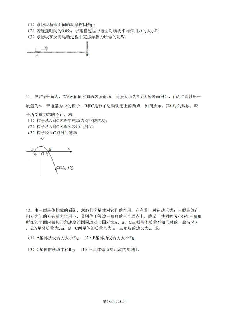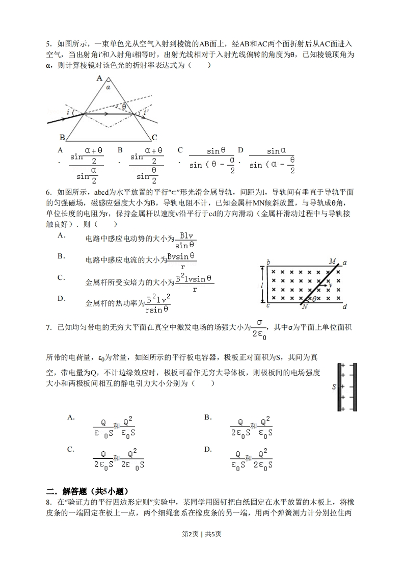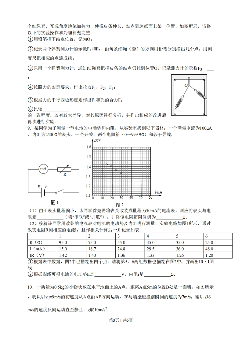 2015年安徽高考物理试卷一。选择题(共7小题)1.如图示是α粒了(氦原子核)被重金属原子核散射的运动轨迹,M、N、P、Q是轨迹上的四点,在散射过程中可以认为重金属原子核静止不动.图中所标出的α粒子在各点处的加速度方向正确的是()a粒子M。重金属原子核A.M点B.N点C.P点D.Q点2.由库仑定律可知,真空中两个静止的点电荷,带电量分别为q1和q2,其间距离为时,它们之间相互作用力的大小为F=k9142式中k为静电力常量.若用国际单位制的基本单位表示,k的单位应为()A.kg.A2.m3B.kgA-2.m3.s-4CDkg*m2.C-2N.m2.A.23.图示电路中,变压器为理想变压器,a、b接在电压有效值不变的交流电流两端,R0为定值电阻,R为滑动变阻器,现将变阻器的滑片从一个位置滑动到另一位置,观察到电流表A]的示数增大了0.2A,电流表A2的示数增大了0.8A,则下列说法正确的是()A.电压表V1示数增大B.电压表V2,V3示数均增大C.该变压器起升压作用D.变阻器滑片是沿c→d的方向滑动4.一根长为L、横截面积为$的金属棒,其材料的电阻率为p,棒内单位体积自由电子数为n,电子的质量为m,电荷量为,在棒两端加上恒定的电压时,棒内产生电流,自由电子定向运动的平均速率为,则金属棒内的电场强度大小为()AB.mv2SnpnevD.peveSL第1页1共5页5.如图所示,一束单色光从空气入射到棱镜的AB面上,经AB和AC两个面折射后从AC面进入空气,当出射角'和入射角相等时,出射光线相对于入射光线偏转的角度为θ,已知棱镜顶角为α,则计算棱镜对该色光的折射率表达式为()0BAQ+日80+日Csine Dsinasim2sim2sin (0-a.2sin(a-2sin 2sin 26.如图所示,abcd为水平放置的平行"c"形光滑金属导轨,间距为l,导轨间有垂直于导轨平面的匀强磁场,磁感应强度大小为B,导轨电阻不计,已知金属杆N倾斜放置,与导轨成角,单位长度的电阻为,保持金属杆以速度v沿平行于cd的方向滑动(金属杆滑动过程中与导轨接触良好),则()A.电路中感应电动势的大小为B1vsin日B.电路中感应电流的大小为Bvsin日C.金属杆所受安培力的大小为B1vsin日XxD金属杆的热功率为B21v2rsine7.已知均匀带电的无穷大平面在真空中激发电场的场强大小为口,其中0为平面上单位面积2e0所带的电荷量,0为常量,如图所示的平行板电容器,极板正对面积为$,其间为真空,带电量为Q,不计边缘效应时,极板可看作无穷大导体板,则极板间的电场强度大小和两极板间相互的静电引力大小分别为()A.。9和Q2B。和Q2E 0S EoS2E0S EoSc,Q和Q2DQ和Q22E0S 2E oS二.解答题(共5小题)8.在“验证力的平行四边形定则”实验中,某同学用图钉把白纸固定在水平放置的木板上,将橡皮条的一端固定在板上一点,两个细绳套系在橡皮条的另一端,用两个弹簧测力计分别拉住两第2页1共5页个细绳套,互成角度地施加拉力,使橡皮条伸长,结点到达纸面上某一位置,如图所示,请将以下的实验操作和处理补充完整:①用铅笔描下结点位置,记为O:②记录两个弹簧测力计的示数F,和F2,沿每条细绳(套)的方向用铅笔分别描出几个点,用刻度尺把相应的点连成线:③只用一个弹簧测力计,通过细绳套把橡皮条的结点仍拉到位置0,记录测力计的示数F3,④按照力的图示要求,作出拉力F1,F2,F3:⑤根据力的平行四边形定则作出F1和F2的合力F:⑥比较的一致程度,若有较大差异,对其原因进行分析,并作出相应的改进后再次进行实验.9.某同学为了测量一节电池的电动势和内阻,从实验室找到以下器材:一个满偏电流为100μA、内阻为25000的表头,一个开关,两个电阻箱(0~999.9Q)和若干导线.◆RW1.61.514131211102060图1图2(1)由于表头量程偏小,该同学首先需将表头改装成量程为50mA的电流表,则应将表头与电阻箱(填“串联”或“并联”),并将该电阻箱阻值调为(2)接着该同学用改装的电流表对电池的电动势及内阻进行测量,实验电路如图1所示,通过改变电阻R测相应的电流缸,且作相关计算后一并记录如表:12456R(Ω)95.075.055.045.035.025.0I (mA)15.018.724.829.536.048.0IR (V)1.421.401.361.331.261.20①根据表中数据,图2中已描绘出四个点,请将第5、6两组数据也描绘在图2中,并画出IR·I图线:②根据图线可得电池的电动势E是V,内阻r是Ω10.一质量为0.5kg的小物块放在水平地面上的A点,距离A点5m的位置B处是一面墙,如图所示,物块以vo=9m/s的初速度从A点沿AB方向运动,在与墙壁碰撞前瞬间的速度为7m/s,碰后以6m/s的速度反向运动直至静止.g取10m/s2,第3页1共5页