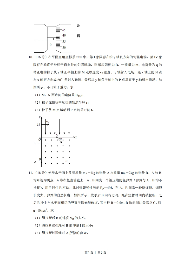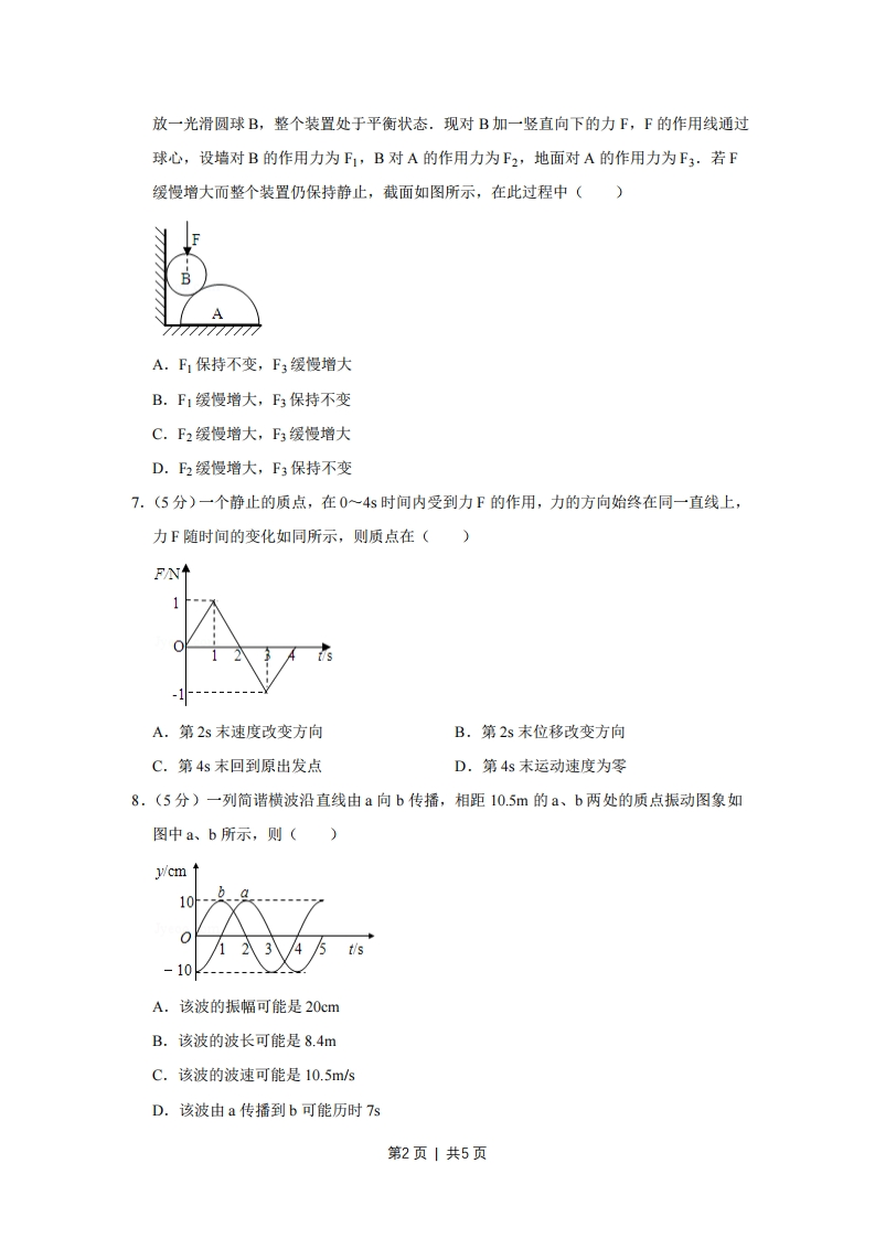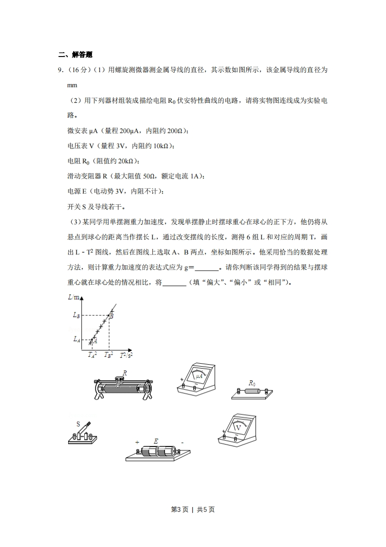 2008年天津市高考物理试卷一、选择题1.(4分)下列说法正确的是()A,布朗运动是悬浮在液体中固体颗粒内分子的无规则运动B.理想气体在等温膨胀过程中也没有把吸收的热量全部对外做功C.知道某物质的摩尔质量和密度可求出阿伏加德罗常数D.内能不同的物体,它们分子热运动的平均动能可能相同2.(4分)一个氢核6R衰变成钋核Po并放出一个粒子,其半衰期为3.8天.1g氢经过7.6天衰变掉的氨的质量,以及站R衰变成钋核即o的过程放出的粒子是()A.025g,a粒子B.0.75g,粒子C.0.25g,B粒子D.0.75g,B粒子3.(5分)下列有关光现象的说法正确的是()A.在光的双缝干涉实验中,若仅将入射光由紫光改为红光,则条纹间距一定变大B.以相同入射角从水中射向空气,紫光能发生全反射,红光也一定能发射全反射C.紫光照射某金属时有电子向外发射,红光照射该金属时也一定有电子向外发射D.拍摄玻璃橱窗内的物品时,往往在镜头前加装一个偏振片以增加透射光的强度4.(5分)一理想变压器的原线圈上接有正弦交变电压,其最大值保持不变,副线圈接有可调电阻R.设原线圈的电流为I1,输入功率为P1,副线圈的电流为I2,输出功率为P2.当R增大时()A.I减小,P1增大B.I减小,P1减小C.2增大,P2减小D.2增大,P2增大5.(5分)带负电的粒子在某电场中仅受电场力作用,能分别完成以下两种运动:①在电场线上运动②在等势面上做匀速圆周运动.该电场可能是()A.一个带正电的点电荷形成B.一个带负电的点电荷形成C.两个分立的带等量负电的点电荷形成D.一个带负电的点电荷与带正电的无限大平板形成6.(5分)在粗糙水平地面上与墙平行放着一个截面为半圆的柱状物体A,A与竖直墙之间第1页|共5页放一光滑圆球B,整个装置处于平衡状态.现对B加一竖直向下的力F,F的作用线通过球心,设墙对B的作用力为F1,B对A的作用力为F2,地面对A的作用力为F3.若F缓慢增大而整个装置仍保持静止,截面如图所示,在此过程中()77777777777A.F1保持不变,F3缓慢增大B.F1缓慢增大,F3保持不变C.F2缓慢增大,F3缓慢增大D.F2缓慢增大,F3保持不变7.(5分)一个静止的质点,在0~4s时间内受到力F的作用,力的方向始终在同一直线上,力F随时间的变化如同所示,则质点在()FAN-1A.第2s末速度改变方向B.第2s末位移改变方向C.第4s末回到原出发点D.第4s末运动速度为零8.(5分)一列简谐横波沿直线由a向b传播,相距10.5m的a、b两处的质点振动图象如图中a、b所示,则()y/cm100-10A.该波的振幅可能是20cmB.该波的波长可能是8.4mC.该波的波速可能是10.5m/sD.该波由a传播到b可能历时7s第2页|共5页二、解答题9.(16分)(1)用螺旋测微器测金属导线的直径,其示数如图所示,该金属导线的直径为mm(2)用下列器材组装成描绘电阻R0伏安特性曲线的电路,请将实物图连线成为实验电路。微安表μA(量程200μA,内阻约2002):电压表V(量程3V,内阻约10k2):电阻R0(阻值约20k2):滑动变阻器R(最大阻值502,额定电流1A):电源E(电动势3V,内阻不计):开关S及导线若干。(3)某同学用单摆测重力加速度,发现单摆静止时摆球重心在球心的正下方,他仍将从悬点到球心的距离当作摆长L,通过改变摆线的长度,测得6组L和对应的周期T,画出L-T2图线,然后在图线上选取A、B两点,坐标如图所示。他采用恰当的数据处理方法,则计算重力加速度的表达式应为g=一。请你判断该同学得到的结果与摆球重心就在球心处的情况相比,将(填“偏大”、“偏小”或“相同”)。LmLERo8008☑第3页|共5页