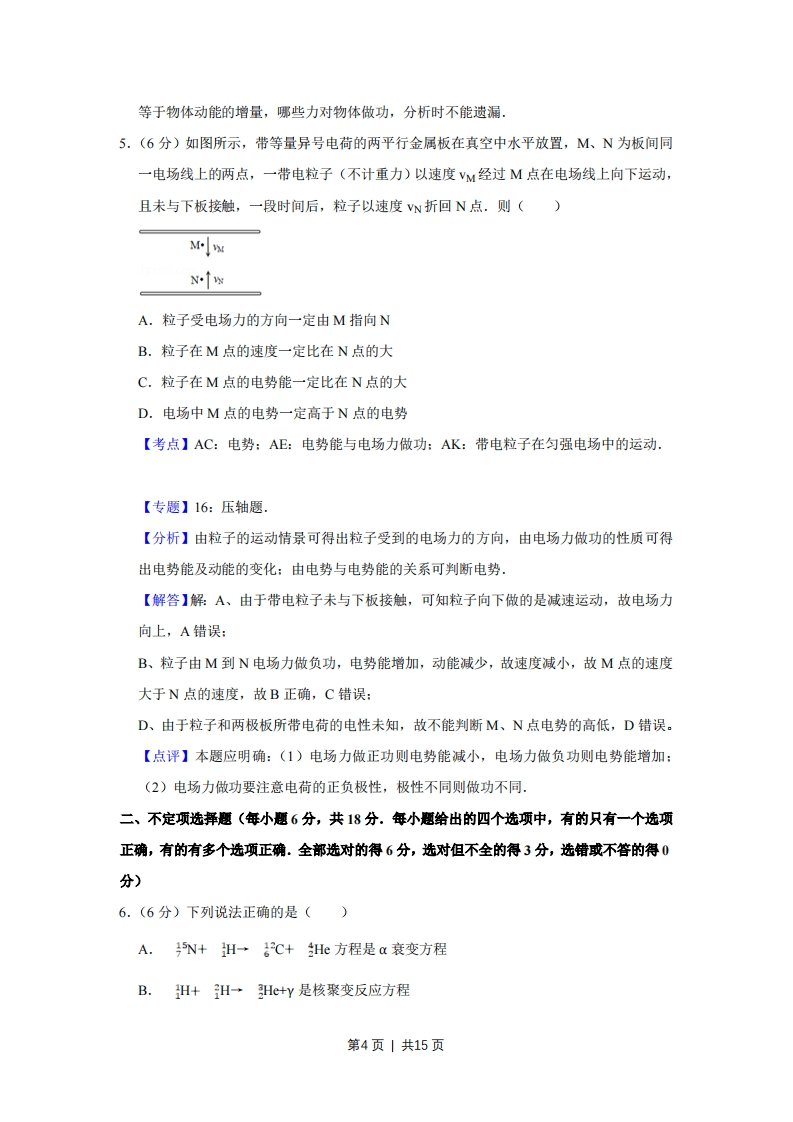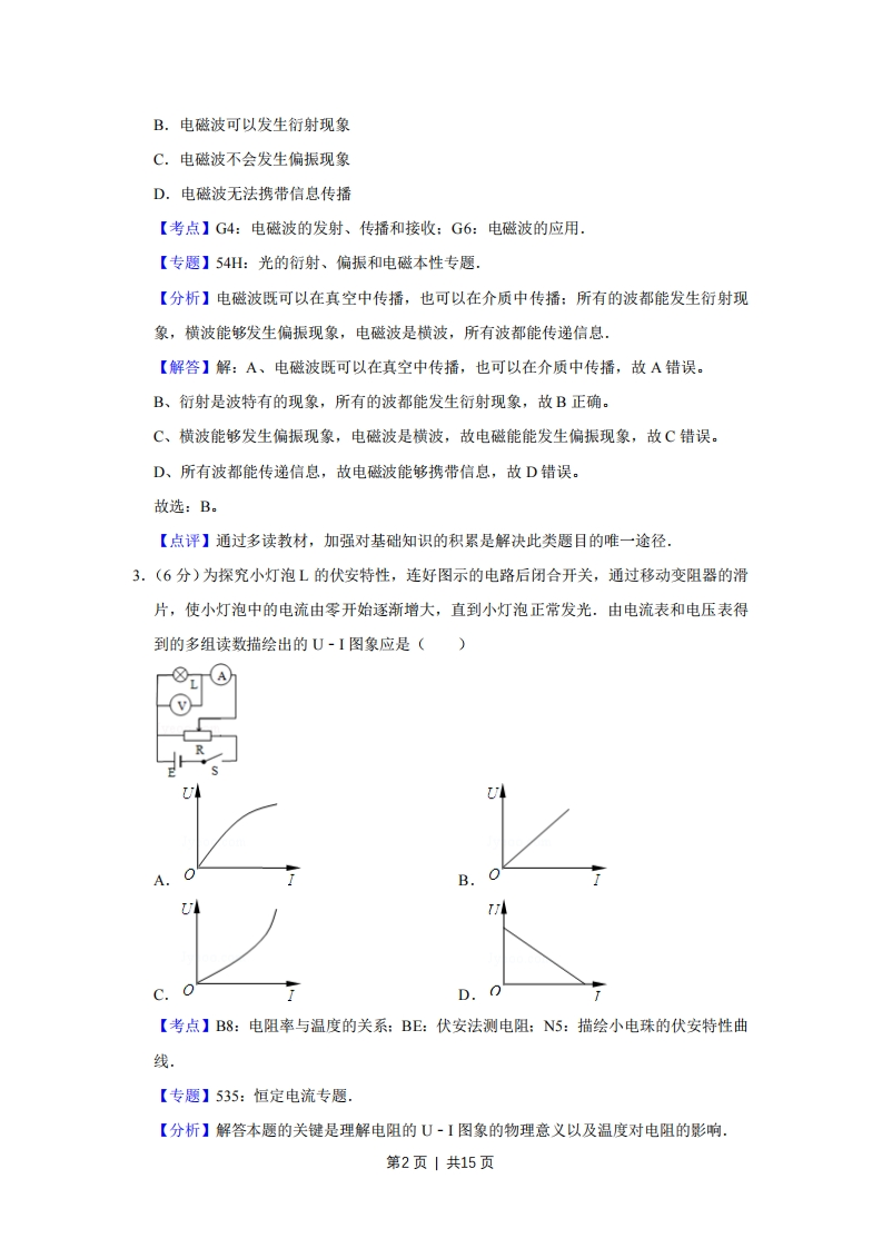 2009年天津市高考物理试卷解析版套考答案与试题解析一、单项选择题(每小题6分,共30分。每小题给出的四个选项中,只有一个选项是正确的)1.(6分)物块静止在固定的斜面上,分别按图示的方向对物块施加大小相等的力F,施力后物块仍然静止,则物块所受的静摩擦力增大的是()垂直于斜面向上B垂直于斜面向下竖直向上D竖直向下【考点】25:静摩擦力和最大静摩擦力:3C:共点力的平衡.【专题】11:计算题,【分析】物体施加力F前后都处于平衡状态,受的合外力为零,分析物体受到的力,然后沿斜面和垂直斜面正交分解力,在沿斜面方向上求静摩擦力,比较前后的大小变化来作出判断。【解答】解:分析四个图中的物体施加F后的受力如图:物体处于平衡状态,合外力为零,正交分解物体受到的力,可知沿斜面方向的合力为零。即A图中FA=Gsin:B图中FB=Gsin0:C图中Fc=(G-F)sin0:D图中FD=(G+F)sin0,而原来都为Gsin0,比较得知静摩擦力增大的为D,所以A、B、C、选项错误,D选项正确。故选:D【点评】知道物体的共点力平衡条件:合外力为零,会正交分解物体的受力,然后得知两互相垂直的方向上的合力为零2.(6分)下列关于电磁波的说法正确的是()A.电磁波必须依赖介质传播第1页|共15页B.电磁波可以发生衍射现象C.电磁波不会发生偏振现象D.电磁波无法携带信息传播【考点】G4:电磁波的发射、传播和接收:G6:电磁波的应用.【专题】54H:光的衍射、偏振和电磁本性专题【分析】电磁波既可以在真空中传播,也可以在介质中传播:所有的波都能发生衍射现象,横波能够发生偏振现象,电磁波是横波,所有波都能传递信息【解答】解:A、电磁波既可以在真空中传播,也可以在介质中传播,故A错误。B、衍射是波特有的现象,所有的波都能发生衍射现象,故B正确。C、横波能够发生偏振现象,电磁波是横波,故电磁能能发生偏振现象,故C错误。D、所有波都能传递信总,故电磁波能够携带信总,故D错误。故选:B。【点评】通过多读教材,加强对基础知识的积累是解决此类题目的唯一途径。3.(6分)为探究小灯泡L的伏安特性,连好图示的电路后闭合开关,通过移动变阻器的滑片,使小灯泡中的电流由零开始逐渐增大,直到小灯泡正常发光.由电流表和电压表得到的多组读数描绘出的U-I图象应是()C.D.0【考点】B8:电阻率与温度的关系:BE:伏安法测电阻:N5:描绘小电珠的伏安特性曲线【专题】535:恒定电流专题【分析】解答本题的关键是理解电阻的U-I图象的物理意义以及温度对电阻的影响第2页1共15页【解答】解:灯丝电阻随电压的增大而增大,在图象上某点到原点连线的斜率应越来越大,故ABD错误,C正确。故选:C。【点评】本题考查的恒定电流中的基础知识:U-I图象含义以及温度对电阻的影响.对于这些基本知识要加强理解和应用.4.(6分)如图所示,竖直放置的两根平行金属导轨之间接有定值电阻R,质量不能忽略的金属棒与两导轨始终保持垂直并良好接触且无摩擦,棒与导轨的电阻均不计,整个装置放在匀强磁场中,磁场方向与导轨平面垂直,棒在竖直向上的恒力F作用下加速上升的一段时间内,力F做的功与安培力做的功的代数和等于()A.棒的机械能增加量B.棒的动能增加量C.棒的重力势能增加量D.电阻R上放出的热量【考点】65:动能定理:D9:导体切割磁感线时的感应电动势:DD:电磁感应中的能量转化,【专题】16:压轴题.【分析】棒在竖直向上的恒力F作用下加速上升的一段时间内,F做正功,安培力做负功,重力做负功,动能增大.根据动能定理分析力F做的功与安培力做的功的代数和.【解答】解A、棒受重力G、拉力F和安培力FA的作用。由动能定理W+WG+W安=△Ek得W+W安=△EK+mgh即力F做的功与安培力做功的代数和等于机械能的增加量。故A正确。B、由动能定理,动能增量等于合力的功。合力的功等于力F做的功、安培力的功与重力的功代数和。故B错误。C、棒克服重力做功等于棒的重力势能增加量。故C错误。D、棒克服安培力做功等于电阻R上放出的热量。故D错误故选:A。【点评】本题运用功能关系分析实际问题.对于动能定理理解要到位:合力对物体做功第3页1共15页