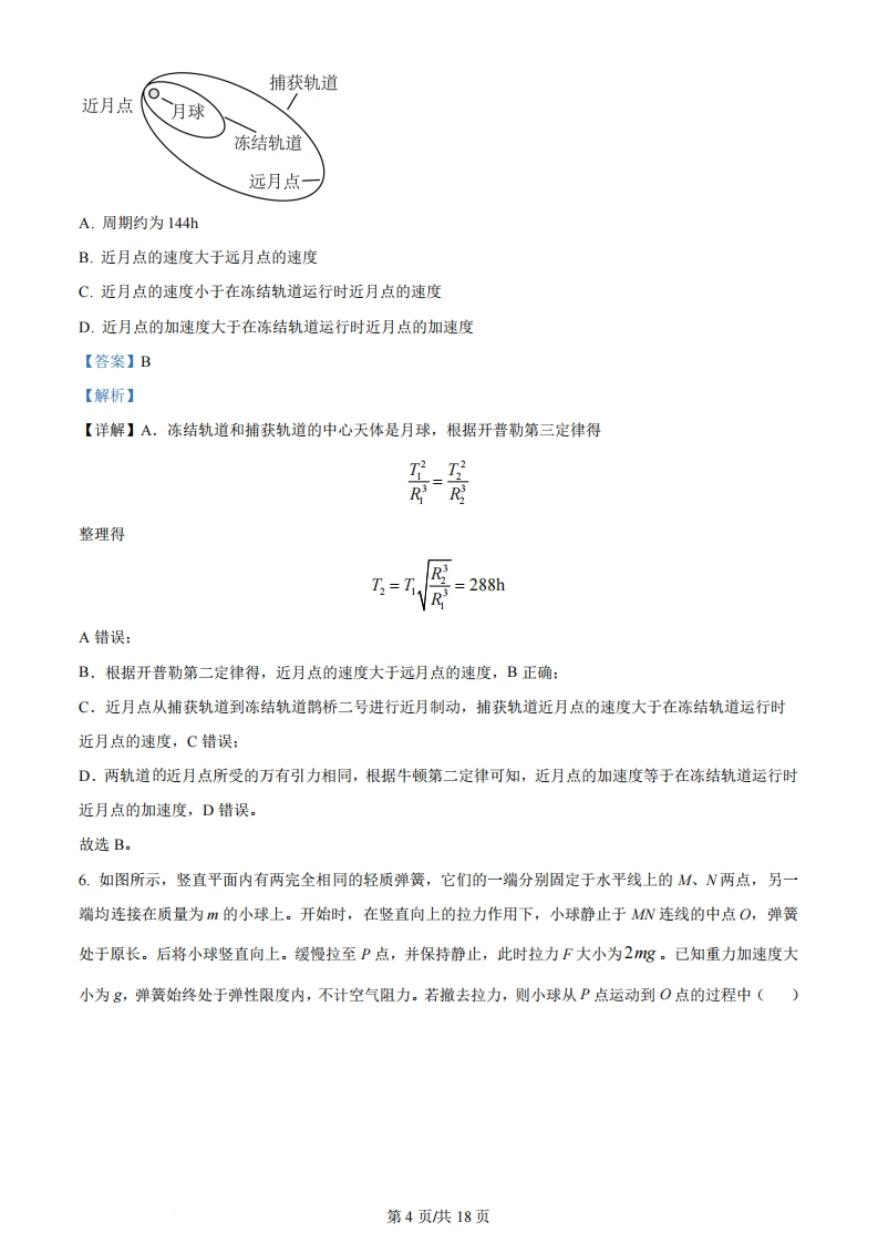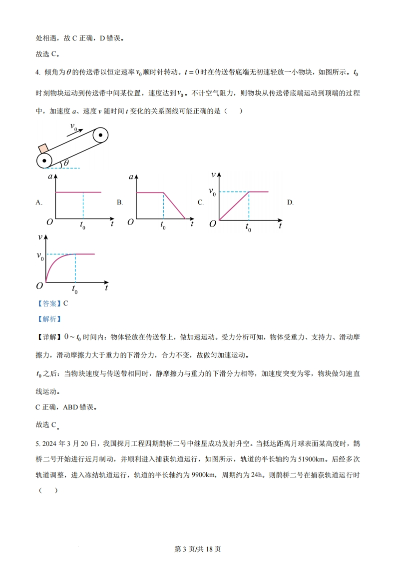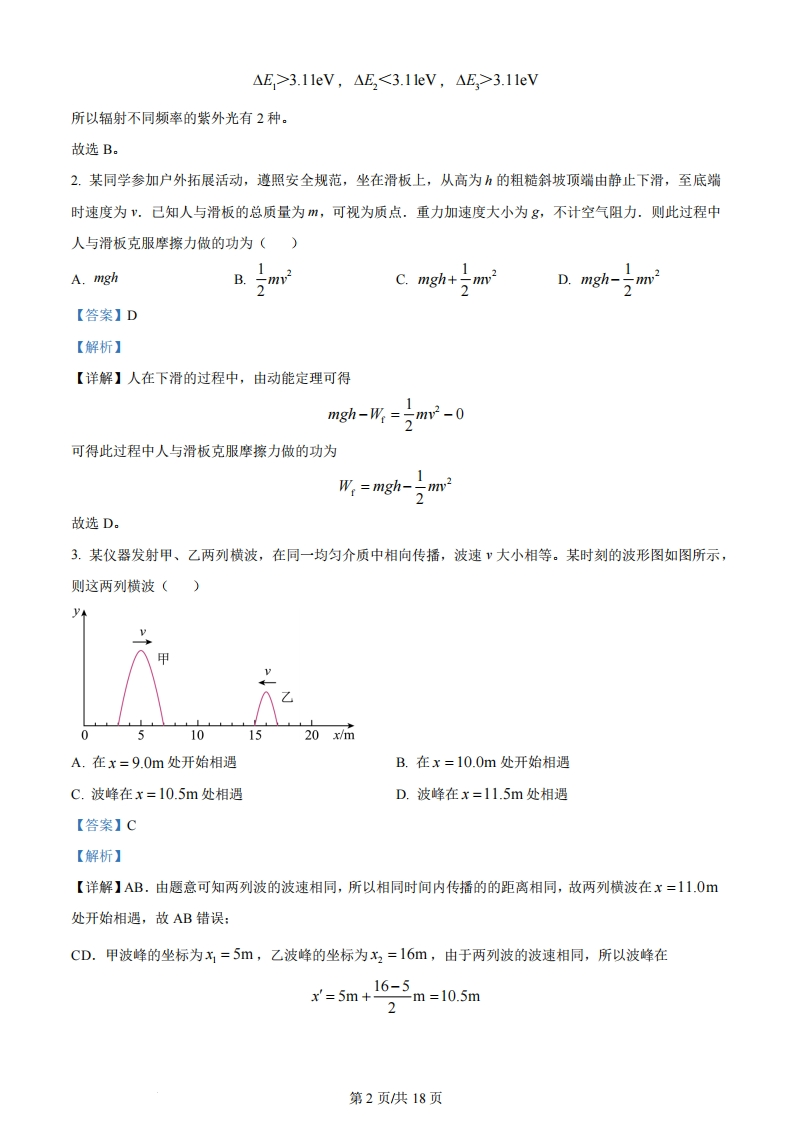 2024年安徽省普通高中学业水平选择性考试物理注意事项:1.答题前,考生务必将自己的姓名和座位号填写在答题卡和试卷上.2,作答选择题时,选出每小题答案后,用铅笔将答题卡上对应题目的答案选项涂黑。如需改动,用橡皮擦干净后,再选涂其它答案选项。作答非选择题时,将答案写在答题卡上对应区域.写在木试卷上无效。3,考试结束后,将本试卷和答题卡一并交回.一、选择题:本题共8小题,每小题4分,共32分.在每小题给出的四个选项中,只有一项是符合要求的.1.大连相干光源是我国第一台高增益自由电子激光用户装置,其激光辐射所应用的玻尔原子理论很好地解释了氢原子的光谱特征。图为氢原子的能级示意图,己知紫外光的光子能量大于3.1l®V,当大量处于n=3能级的氢原子向低能级跃迁时,辐射不同频率的紫外光有()nE/eV.0-0.853-1.512-3.4-13.6A.1种B.2种C.3种D.4种【答案】B【解析】【详解】大量处于=3能级的氢原子向低能级跃迁时,能够辐射出不同频率的种类为C3=3种辐射出光子的能量分别为△E,=E3-E,=-1.51eV-(-13.6eV)=12.09eV△E2=E3-E=-1.51eV-(-3.4eV)=1.89eV△E3=E2-E,=-3.4eV-(-13.6eV)=10.2eV其中第1页供18页△E,>3.11eV,△E,<3.1leV,△E,>3.11eV所以辐射不同频率的紫外光有2种。故选B。2.某同学参加户外拓展活动,遵照安全规范,坐在滑板上,从高为h的粗糙斜坡顶端由静止下滑,至底端时速度为”.己知人与滑板的总质量为m,可视为质点.重力加速度大小为g,不计空气阻力.则此过程中人与滑板克服摩擦力做的功为()11A.mgh3B.C.mgh+mv2D.mgh-zm【答案】D【解析】【详解】人在下滑的过程中,由动能定理可得1mgh-形=mr-0可得此过程中人与滑板克服摩擦力做的功为1W:=mgh--my2故选D。3.某仪器发射甲、乙两列横波,在同一均匀介质中相向传播,波速v大小相等。某时刻的波形图如图所示,则这两列横波()4甲01020x/mA.在x=9.0m处开始相遇B.在x=10.0m处开始相遇C.波峰在x=10.5m处相遇D.波峰在x=11.5m处相遇【答案】C【解析】【详解】AB.由题意可知两列波的波速相同,所以相同时间内传播的的距离相同,故两列横波在x=11.0m处开始相遇,故AB错误:CD.甲波峰的坐标为x=5m,乙波峰的坐标为x2=16m,由于两列波的波速相同,所以波峰在x'=5m+16-5二m=10.5m2第2页供18页处相遇,故C正确,D错误。故选C。4.倾角为日的传送带以恒定速率'。顺时针转动。1=0时在传送带底端无初速轻放一小物块,如图所示。6时刻物块运动到传送带中间某位置,速度达到。。不计空气阻力,则物块从传送带底端运动到顶端的过程中,加速度a、速度v随时间t变化的关系图线可能正确的是()【答案】C【解析】【详解】0~时间内:物体轻放在传送带上,做加速运动。受力分析可知,物体受重力、支持力、滑动摩擦力,滑动摩擦力大于重力的下滑分力,合力不变,故做匀加速运动。之后:当物块速度与传送带相同时,静摩擦力与重力的下滑分力相等,加速度突变为零,物块做匀速直线运动。C正确,ABD错误。故选C」5.2024年3月20日,我国探月工程四期鹊桥二号中继星成功发射升空。当抵达距离月球表面某高度时,鹊桥二号开始进行近月制动,并顺利进入捕获轨道运行,如图所示,轨道的半长轴约为51900km。后经多次轨道调整,进入冻结轨道运行,轨道的半长轴约为9900km,周期约为24h。则鹊桥二号在捕获轨道运行时()第3页供18页