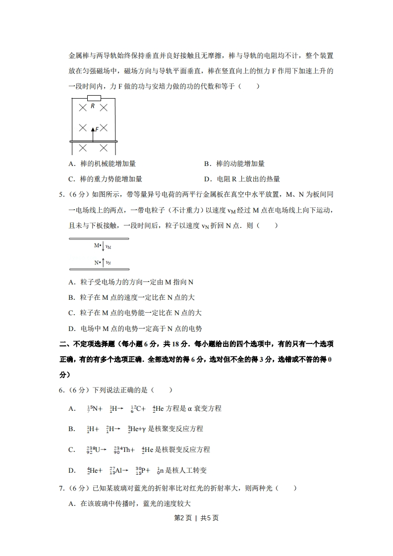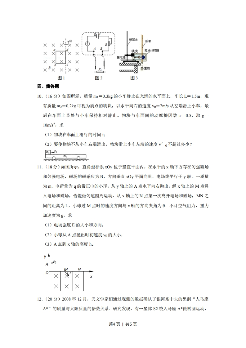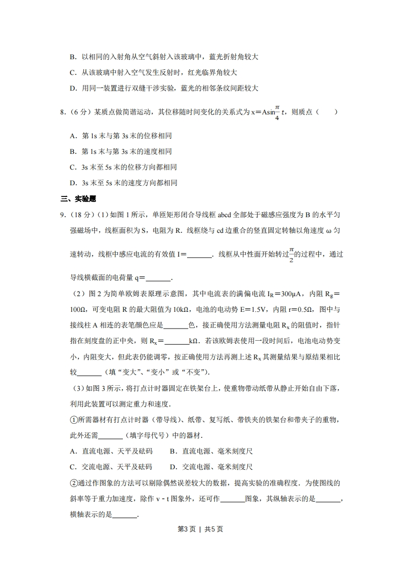2009年天津市高考物理试卷一、单项选择题(每小题6分,共30分。每小题给出的四个选项中,只有一个选项是正确的)1.(6分)物块静止在固定的斜面上,分别按图示的方向对物块施加大小相等的力F,施力后物块仍然静止,则物块所受的静摩擦力增大的是()垂直于斜面向上B.垂直于斜面向下竖直向上D竖直向下2.(6分)下列关于电磁波的说法正确的是(A.电磁波必须依赖介质传播B.电磁波可以发生行射现象C.电磁波不会发生偏振现象D.电磁波无法携带信息传播3.(6分)为探究小灯泡L的伏安特性,连好图示的电路后闭合开关,通过移动变阻器的滑片,使小灯泡中的电流由零开始逐渐增大,直到小灯泡正常发光.由电流表和电压表得到的多组读数描绘出的U-I图象应是()AC.D.04.(6分)如图所示,竖直放置的两根平行金属导轨之间接有定值电阻R,质量不能忽略的第1页|共5页金属棒与两导轨始终保持垂直并良好接触且无摩擦,棒与导轨的电阻均不计,整个装置放在匀强磁场中,磁场方向与导轨平面垂直,棒在竖直向上的恒力F作用下加速上升的段时间内,力F做的功与安培力做的功的代数和等于()XRXXA.棒的机械能增加量B.棒的动能增加量C.棒的重力势能增加量D.电阻R上放出的热量5.(6分)如图所示,带等量异号电荷的两平行金属板在真空中水平放置,M、N为板间同一电场线上的两点,一带电粒子(不计重力)以速度VM经过M点在电场线上向下运动,且未与下板接触,一段时间后,粒子以速度N折回N点.则()M.vN…fwA.粒子受电场力的方向一定由M指向NB.粒子在M点的速度一定比在N点的大C.粒子在M点的电势能一定比在N点的大D.电场中M点的电势一定高于N点的电势二、不定项选择题(每小题6分,共18分。每小题给出的四个选项中,有的只有一个选项正确,有的有多个选项正确.全部选对的得6分,选对但不全的得3分,选错或不答的得0分)6.(6分)下列说法正确的是()A.N+H→℃+He方程是a衰变方程B.H+H→He+y是核聚变反应方程C.U一Th+He是核裂变反应方程D.He+Al→P+n是核人工转变7.(6分)己知某玻璃对蓝光的折射率比对红光的折射率大,则两种光()A.在该玻璃中传播时,蓝光的速度较大第2页1共5页B.以相同的入射角从空气斜射入该玻璃中,蓝光折射角较大C.从该玻璃中射入空气发生反射时,红光临界角较大D.用同一装置进行双缝干涉实验,蓝光的相邻条纹间距较大8.(6分)某质点做简谐运动,其位移随时间变化的关系式为x=Asi二t,则质点()A.第1s末与第3s末的位移相同B.第1s末与第3s末的速度相同C.3s末至5s末的位移方向都相同D.3s末至5s末的速度方向都相同三、实验题9.(18分)(1)如图1所示,单匝矩形闭合导线框bcd全部处于磁感应强度为B的水平匀强磁场中,线框面积为S,电阻为R.线框绕与cd边重合的竖直固定转轴以角速度ω匀速转动,线框中感应电流的有效值I=线框从中性面开始转过的过程中,通过导线横截面的电荷量q=(2)图2为简单欧姆表原理示意图,其中电流表的满偏电流R=300μA,内阻Rg=1002,可变电阻R的最大阻值为10k2,电池的电动势E=1.5V,内阻r=0.52,图中与接线柱A相连的表笔颜色应是」色,接正确使用方法测量电阻Rx的阻值时,指针指在刻度盘的正中央,则R=k.若该欧姆表使用一段时间后,电池电动势变小,内阻变大,但此表仍能调零,按正确使用方法再测上述Rx其测量结果与原结果相比较(填“变大”、“变小”或“不变”).(3)如图3所示,将打点计时器固定在铁架台上,使重物带动纸带从静止开始自由下落,利用此装置可以测定重力和速度。①所需器材有打点计时器(带导线)、纸带、复写纸、带铁夹的铁架台和带夹子的重物,此外还需一(填字母代号)中的器材A.直流电源、天平及砝码B.直流电源、毫米刻度尺C.交流电源、天平及砝码D.交流电源、毫米刻度尺②通过作图象的方法可以剔除偶然误差较大的数据,提高实验的准确程度.为使图线的斜率等于重力加速度,除作V-t图象外,还可作图象,其纵轴表示的是」横轴表示的是第3页|共5页