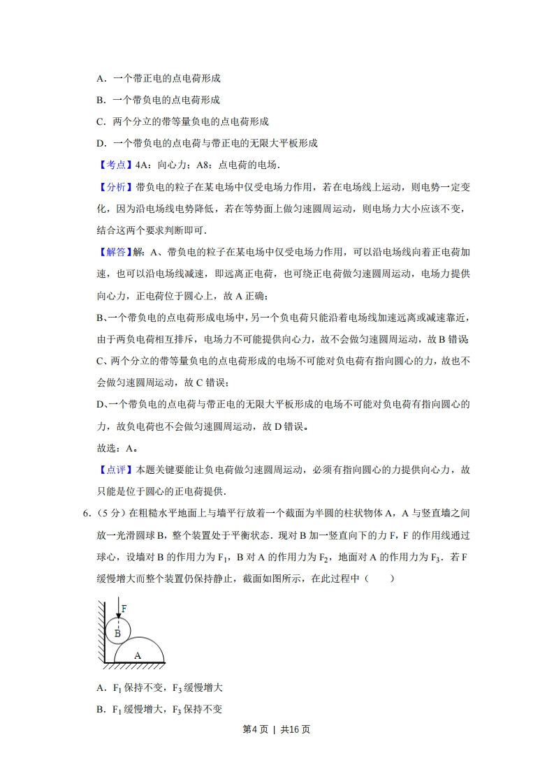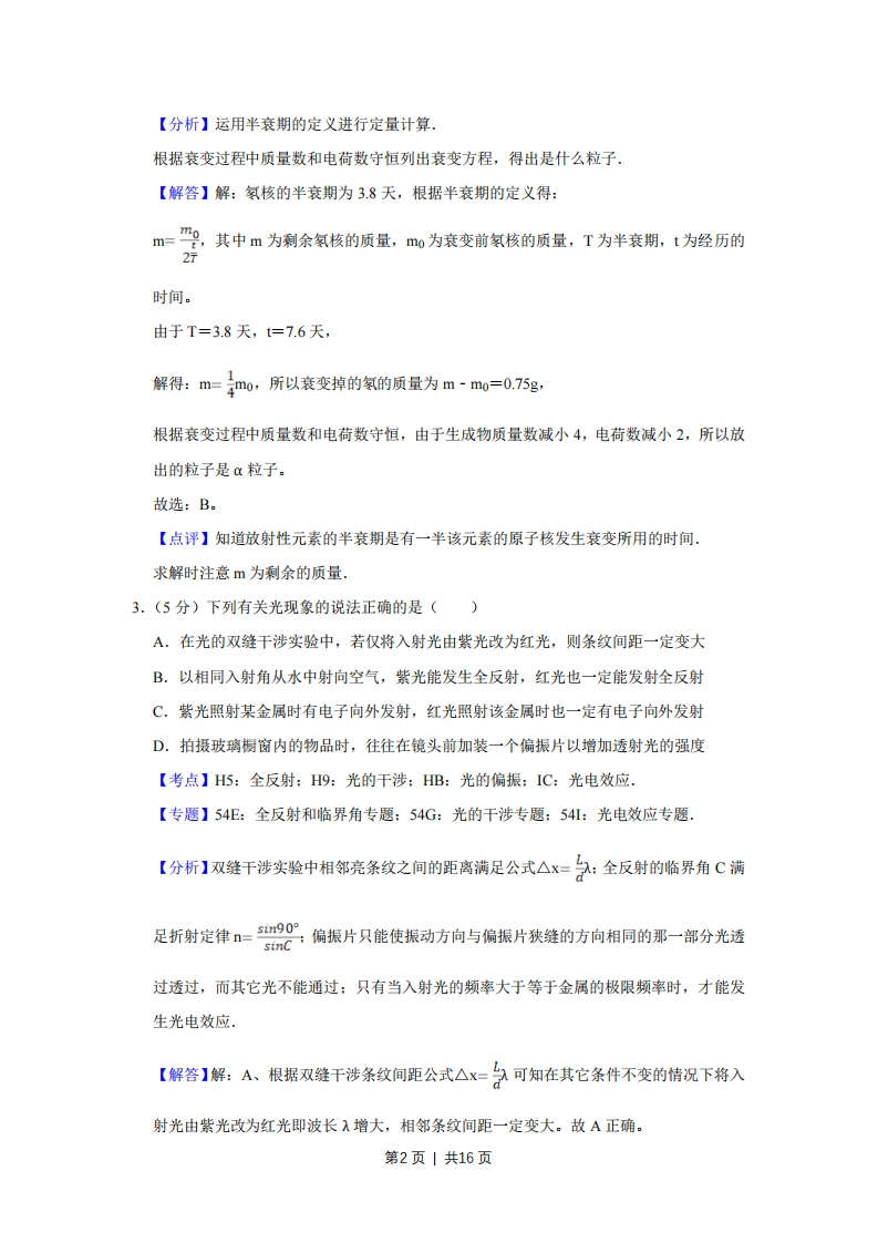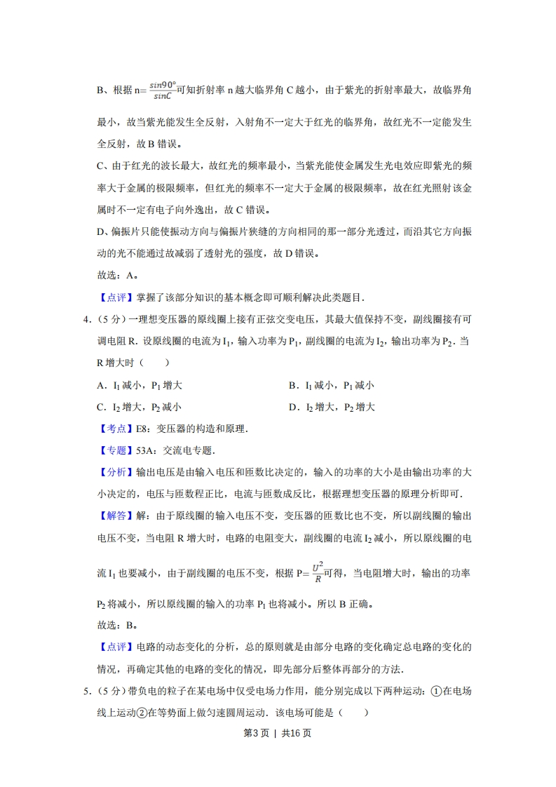 2008年天津市高考物理试卷解析版事考答案与试题佩析一、选择题1.(4分)下列说法正确的是()A.布朗运动是悬浮在液体中固体颗粒内分子的无规则运动B.理想气体在等温膨胀过程中也没有把吸收的热量全部对外做功C.知道某物质的摩尔质量和密度可求出阿伏加德罗常数D.内能不同的物体,它们分子热运动的平均动能可能相同【考点】83:分子的热运动:8A:物体的内能.【专题】12:应用题【分析】布朗运动是悬浮在液体中固体微粒的无规则运动.理想气体在等温膨胀过程中气体的内能没有变,所以把吸收的热量全部对外做功.知道某物质的摩尔质量和密度可求摩尔体积,内能不同的物体,可能是由于物质的量不同引起的,而温度可能相等,所以分子热运动的平均动能就可能相同.【解答】解:A、布朗运动是悬浮在液体中固体微粒的无规则运动,故A错。B、理想气体在等温膨胀过程中气体的内能没有变,所以把吸收的热量全部对外做功,故B错。C、知道某物质的摩尔质量和密度可求摩尔体积,故C错。D、内能不同的物体,可能是由于物质的量不同引起的,而温度可能相等,所以分子热运动的平均动能就可能相同,故D对。故选:D【点评】本题主要考查基本知识点,平时要注意基本知识的积累并加以灵活应用.2.(4分)一个氢核6Rm衰变成钋核Po并放出一个粒子,其半衰期为3.8天.1g氨经过7.6天衰变掉的氨的质量,以及站R衰变成钋核Po的过程放出的粒子是()A.0.25g,a粒子B.0.75g,粒子C.0.25g,阝粒子D.0.75g,B粒子【考点】JA:原子核衰变及半衰期、衰变速度,第1页|共16页【分析】运用半衰期的定义进行定量计算,根据衰变过程中质量数和电荷数守恒列出衰变方程,得出是什么粒子.【解答】解:氨核的半衰期为3.8天,根据半衰期的定义得:m="mg,其中m为剩余氧核的质量,m0为衰变前氢核的质量,T为半衰期,t为经历的27时间。由于T=3.8天,=7.6天,解得:m=4m0,所以衰变掉的氢的质量为m-mo=0.75g,根据衰变过程中质量数和电荷数守恒,由于生成物质量数减小4,电荷数减小2,所以放出的粒子是α粒子。故选:B。【点评】知道放射性元素的半衰期是有一半该元素的原子核发生衰变所用的时间.求解时注意m为剩余的质量.3.(5分)下列有关光现象的说法正确的是()A.在光的双缝干涉实验中,若仅将入射光由紫光改为红光,则条纹间距一定变大B.以相同入射角从水中射向空气,紫光能发生全反射,红光也一定能发射全反射C.紫光照射某金属时有电子向外发射,红光照射该金属时也一定有电子向外发射D.拍摄玻璃橱窗内的物品时,往往在镜头前加装一个偏振片以增加透射光的强度【考点】H5:全反射:H9:光的干涉:HB:光的偏振:IC:光电效应,【专题】54E:全反射和临界角专题:54G:光的干涉专题:54:光电效应专题.【分析】双缝干涉实验中相邻亮条纹之间的距离满足公式△x=入:全反射的临界角C满足折射定律=C偏振片只能使振动方向与偏振片狭缝的方向相同的鄂一部分光透过透过,而其它光不能通过:只有当入射光的频率大于等于金属的极限频率时,才能发生光电效应【解答】解:A、根据双缝干涉条纹间距公式△x=之可知在其它条件不变的情况下将入射光由紫光改为红光即波长入增大,相邻条纹间距一定变大。故A正确。第2页1共16页B、根据n=sm90可知折射率n越大临界角C越小,由于紫光的折射率最大,故临界角sinc最小,故当紫光能发生全反射,入射角不一定大于红光的临界角,故红光不一定能发生全反射,故B错误。C、由于红光的波长最大,故红光的频率最小,当紫光能使金属发生光电效应即紫光的频率大于金属的极限频率,但红光的频率不一定大于金属的极限频率,故在红光照射该金属时不一定有电子向外逸出,故C错误。D、偏振片只能使振动方向与偏振片狭缝的方向相同的那一部分光透过,而沿其它方向振动的光不能通过故减弱了透射光的强度,故D错误。故选:A。【点评】掌握了该部分知识的基本概念即可顺利解决此类题目.4.(5分)一理想变压器的原线圈上接有正弦交变电压,其最大值保持不变,副线圈接有可调电阻R.设原线圈的电流为I,输入功率为P,副线圈的电流为2,输出功率为P2,当R增大时()A.1减小,P1增大B.I减小,P1减小C.2增大,P2减小D.2增大,P2增大【考点】E8:变压器的构造和原理,【专题】53A:交流电专题.【分析】输出电压是由输入电压和匝数比决定的,输入的功率的大小是由输出功率的大小决定的,电压与匝数程正比,电流与匝数成反比,根据理想变压器的原理分析即可.【解答】解:由于原线圈的输入电压不变,变压器的匝数比也不变,所以副线圈的输出电压不变,当电阻R增大时,电路的电阻变大,副线圈的电流2减小,所以原线圈的电流!也要减小,由于副线圈的电压不变,根据P=受可得,当电阻增大时,输出的功率P2将减小,所以原线圈的输入的功率P1也将减小。所以B正确。故选:B。【点评】电路的动态变化的分析,总的原则就是由部分电路的变化确定总电路的变化的情况,再确定其他的电路的变化的情况,即先部分后整体再部分的方法,5.(5分)带负电的粒子在某电场中仅受电场力作用,能分别完成以下两种运动:①在电场线上运动②在等势面上做匀速圆周运动.该电场可能是()第3页|共16页