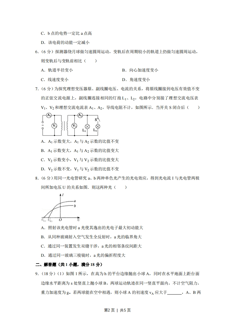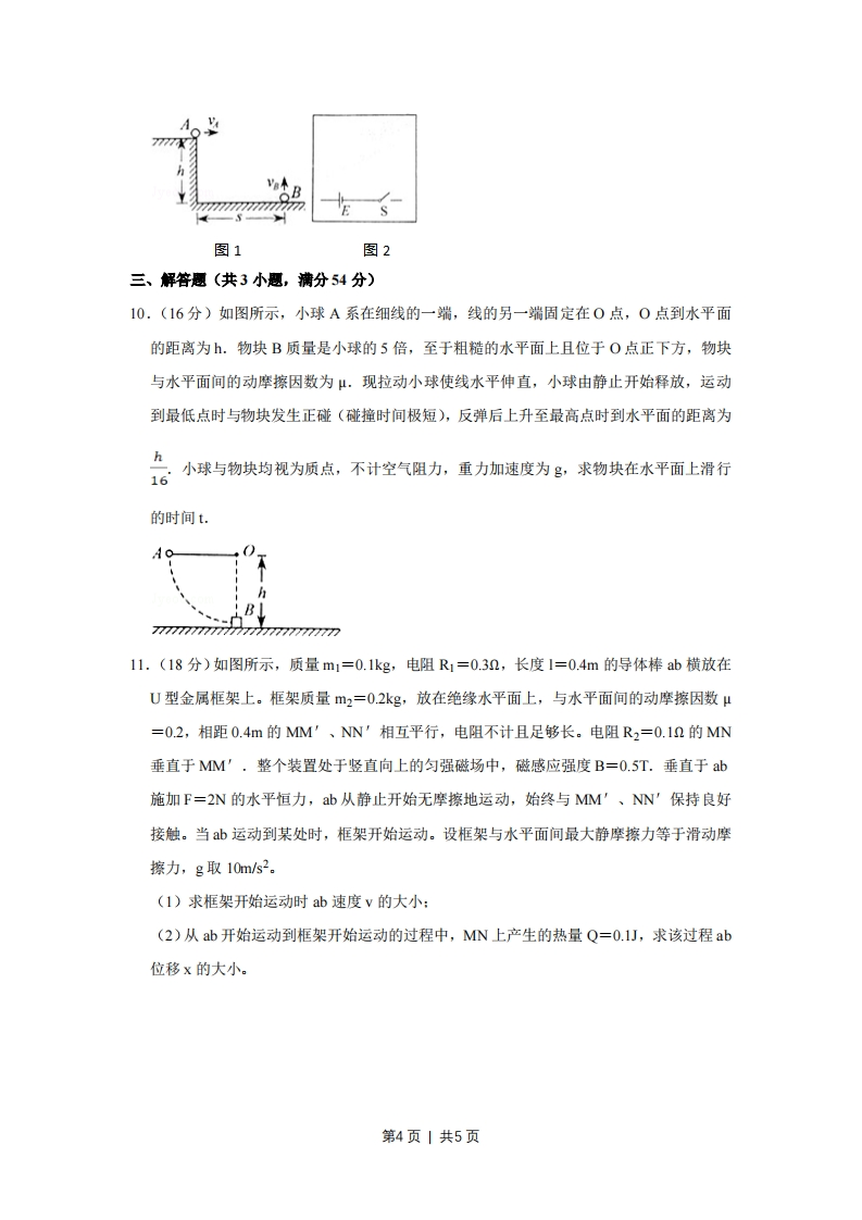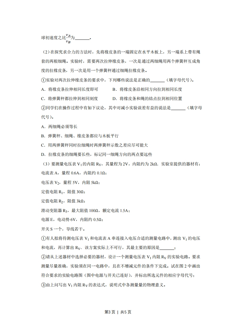 2010年天津市高考物理试卷一、选择题(每小题6分,共48分,每小题给出的四个选项中,只有一个选项是正确的)1.(6分)下列关于电磁波的说法正确的是()A.均匀变化的磁场能够在空间产生电场B.电磁波在真空和介质中传播速度相同C.只要有电场和磁场,就能产生电磁波D.电磁波在同种介质中只能沿直线传播2.(6分)下列关于原子和原子核的说法正确的是()A.B衰变现象说明电子是原子核的组成部分B.玻尔理论的假设之一是原子能量的量子化C.放射性元素的半衰期随温度的升高而变短D.比结合能越小表示原子核中的核子结合得越牢固3.(6分)质点做直线运动的V-t图象如图所示,规定向右为正方向,则该质点在前8s内平均速度的大小和方向分别为()'wms"8A.0.25m/s向右B.0.25m/s向左C.1m/s向右D.1ms向左4.(6分)一列简谐横波沿x轴正向传播,传到M点时波形如图所示,再经0.6s,N点开始振动,则该波的振幅A和频率f为()0.50245678901立.0.5--mA.A=1m,f=5HzB.A=0.5m,f=5HzC.A=1m,f=2.5HzD.A=0.5m,f=2.5Hz5.(6分)在静电场中,将一正电荷从a移动到b点,电场力做了负功,则()A.b点的电场强度一定比a点大B.电场线方向一定从b指向a第1页1共5页C.b点的电势一定比a点高D.该电荷的动能一定减小6.(6分)探测器绕月球做匀速圆周运动,变轨后在周期较小的轨道上仍做匀速圆周运动,则变轨后与变轨前相比()A.轨道半径变小B.向心加速度变小C.线速度变小D.角速度变小7.(6分)为探究理想变压器原、副线圈电压、电流的关系,将原线圈接到电压有效值不变的正弦交流电源上,副线圈连接相同的灯泡L1、L2,电路中分别接了理想交流电压表V1、V2和理想交流电流表A1、A2,导线电阻不计,如图所示.当开关S闭合后()A.A1示数变大,A1与A2示数的比值不变B.A1示数变大,A1与A2示数的比值变大C.V2示数变小,V,与V2示数的比值变大D.V2示数不变,V1与V2示数的比值不变8.(6分)用同一光电管研究a、b两种单色光产生的光电效应,得到光电流I与光电管两极间所加电压U的关系如图.则这两种光()0A.照射该光电管时a光使其逸出的光电子最大初动能大B.从同种玻璃射入空气发生全反射时,a光的临界角大C.通过同一装置发生双缝干涉,a光的相邻条纹间距大D.通过同一玻璃三棱镜时,a光的偏折程度大二、解答愿(共1小题,满分18分)9.(18分)(1)如图1所示,在高为h的平台边缘抛出小球A,同时在水平地面上距台面边缘水平距离为s处竖直上抛小球B,两球运动轨迹在同一竖直平面内,不计空气阻力,重力加速度为g。若两球能在空中相遇,则小球A的初速度VA应大于一,A、B两第2页1共5页球初速度之比A为VB(2)在探究求合力的方法时,先将橡皮条的一端固定在水平木板上,另一端系上带有绳套的两根细绳。实验时,需要两次拉伸橡皮条,一次是通过两细绳用两个弹簧秤互成角度的拉橡皮条,另一次是用一个弹簧秤通过细绳拉橡皮条。①实验对两次拉伸橡皮条的要求中,下列哪些说法是正确的(填字母代号)。A,将橡皮条拉伸相同长度即可B,将橡皮条沿相同方向拉到相同长度C.将弹簧秤都拉伸到相同刻度D.将橡皮条和绳的结点拉到相同位置②同学们在操作过程中有如下议论,其中对减小实验误差有益的说法是(填字母代号)。A.两细绳必须等长B.弹簧秤、细绳、橡皮条都应与木板平行C.用两弹簧秤同时拉细绳时两弹簧秤示数之差应尽可能大D.拉橡皮条的细绳要长些,标记同一细绳方向的两点要远些(3)要测量电压表V1的内阻Ry,其量程为2V,内阻约为2k2.实验室提供的器材有:电流表A,量程0.6A,内阻约0.12:电压表V2,量程5V,内阻5k2:定值电阻R1,阻值302:定值电阻R2,阻值3k2:滑动变阻器R3,最大阻值100,额定电流1.5A:电源E,电动势6V,内阻约0.52:开关S一个,导线若干。①有人拟将待测电压表V1和电流表A串连接入电压合适的测量电路中,测出V1的电压和电流,再计算出Ry·该方案实际上不可行,其最主要的原因是②请从上述器材中选择必要的器材,设计一个测量电压表V1内阻Ry的实验电路。要求测量尽量准确,实验须在同一电路中,且在不增减元件的条件下完成。试在图2中画出符合要求的实验电路图(图中电源与开关己连好),并标出所选元件的相应字母代号:③油上问写出V1内阻RV的表达式,说明式中各测量量的物理意义。第3页1共5页