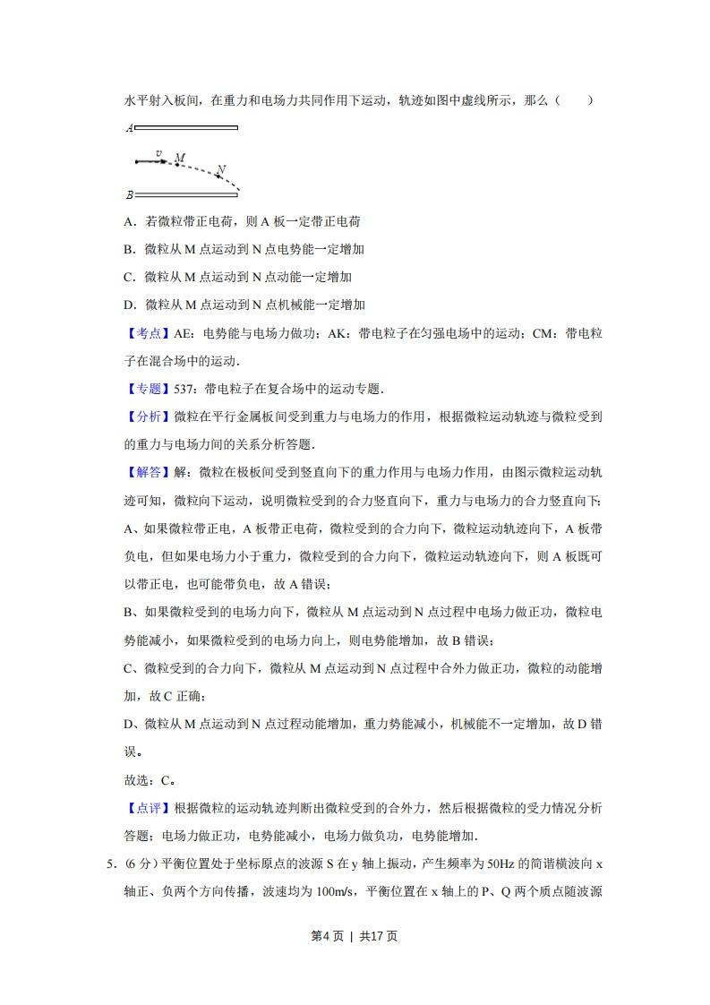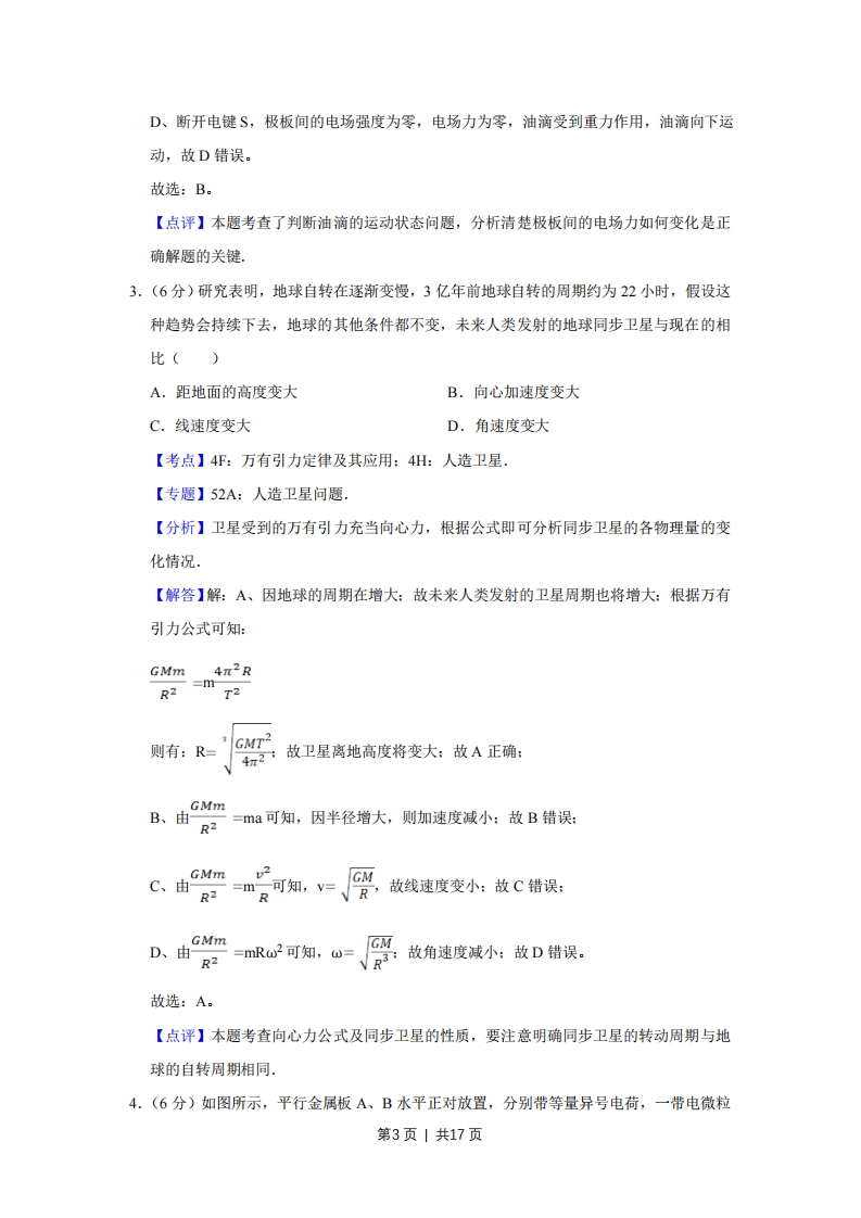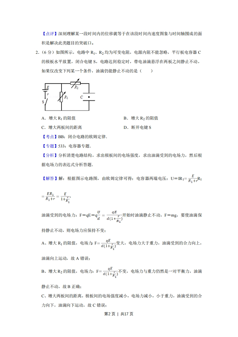 2014年天津市高考物理试卷解析版事考答案与试题佩析一、单项选择题(每小题6分,共30分)1.(6分)质点做直线运动的速度-时间图象如图所示,该质点()个/ms12056t/s2A.在第1秒末速度方向发生了改变B.在第2秒末加速度方向发生了改变C.在前2秒内发生的位移为零D.第3秒末和第5秒末的位置相同【考点】1:匀变速直线运动的图像。【专题】512:运动学中的图像专题.【分析】速度图象与时间轴围成的面积等于物体在该段时间内通过的位移,速度的正负表示速度的方向,只要图象在时间轴同一侧物体运动的方向就没有改变:只要总面积仍大于0,位移方向就仍沿正方向:【解答】解:A、0-2s内速度图象在时间轴的上方,都为正,速度方向没有改变。故A错误:B、速度时间图象的斜率表示加速度,由图可知1-3s图象斜率不变,加速度不变,方向没有发生改变,故B错误:C、根据“面积”表示位移可知,0-2s内的位移为:x1=号2×2m=2m。故C错误:D、根据“面积”表示位移可知,0-3s内的位移为:X=×2×2-×1×2m=1m,10-5s内的位移为:2=22×1m=1m,所以第3秒末和第5秒末的位置相同。故D正确。故选:D。第1页|共17页【点评】深刻理解某一段时间内的位移就等于在该段时间内速度图象与时间轴围成的面积是解决此类题目的突破口。2.(6分)如图所示,电路中R1、R2均为可变电阻,电源内阻不能忽略,平行板电容器C的极板水平放置,闭合电键S,电路达到稳定时,带电油滴悬浮在两板之间静止不动,如果仅改变下列某一个条件,油滴仍能静止不动的是()A.增大R1的阻值B.增大R2的阻值C.增大两板间的距离D.断开电键S【考点】BB:闭合电路的欧姆定律【专题】533:电容器专题.【分析】分析清楚电路结构,求出极板间的电场强度,求出油滴受到的电场力,然后根据电场力的表达式分析答题,E【解答】解:根据图示电路图,由欧姆定律可得:电容器两端电压:U=R1=R1+,RER洁黄受到的电场力=q啡=号产开始道清静止不动。=心买位流清保U持静止不动,则电场力应保持不变:A、增大R的阻值,电场办F=,9E变大,电场力大于重力,油滴受到的合力向上,a(1+油滴向上运动,故A错误:B、增大R2的阻值,电场力:F=a+原E,一不变,电场力与重力仍然是一对平衡力,油滴静止不动,故B正确:C、增大两板间的距离,极板间的电场强度减小,电场力减小,小于重力,油滴受到的合力向下,油滴向下运动,故C错误:第2页1共17页D、断开电键S,极板间的电场强度为零,电场力为零,油滴受到重力作用,油滴向下运动,故D错误。故选:B。【点评】本题考查了判断油滴的运动状态问题,分析清楚极板间的电场力如何变化是正确解题的关键,3.(6分)研究表明,地球自转在逐渐变慢,3亿年前地球自转的周期约为22小时,假设这种趋势会持续下去,地球的其他条件都不变,未来人类发射的地球同步卫星与现在的相比()A.距地面的高度变大B.向心加速度变大C.线速度变大D.角速度变大【考点】4F:万有引力定律及其应用:4H:人造卫星.【专题】52A:人造卫星问题【分析】卫星受到的万有引力充当向心力,根据公式即可分析同步卫星的各物理量的变化情况.【解答】解:A、因地球的周期在增大:故未来人类发射的卫星周期也将增大:根据万有引力公式可知:GMm4π2R=mR2T2则有:R=GMT24n2故卫星离地高度将变大:故A正确:GMmB、由=ma可知,因半径增大,则加速度减小:故B错误:R2GMmv2GMC、由=m一可知,vR故线速度变小:故C错误:R2RD、由CMm=mRw2可知,ω=GM故角速度减小:故D错误。R2故选:A【点评】本题考查向心力公式及同步卫星的性质,要注意明确同步卫星的转动周期与地球的自转周期相同,4.(6分)如图所示,平行金属板A、B水平正对放置,分别带等量异号电荷,一带电微粒第3页|共17页