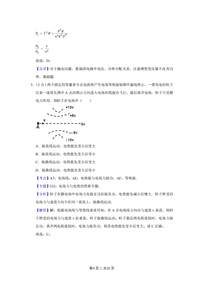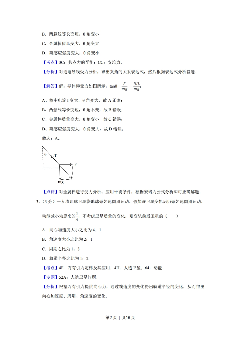 2012年天津市高考物理试卷解析版事考答案与试题佩析一、选择题1.(3分)下列说法正确的是()A.采用物理或化学方法可以有效地改变放射性元素的半衰期B.由玻尔理论知道氢原子从激发态跃迁到基态时会放出光子C.从高空对地面进行遥感摄影是利用紫外线良好的穿透能力D.原子核所含核子单独存在时的总质量小于该原子核的质量【考点】I4:红外线的热效应和红外线遥控:J3:玻尔模型和氢原子的能级结构:JA:原子核衰变及半衰期、衰变速度【专题】54N:原子的能级结构专题.【分析】元素的半衰期是由元素本身决定的与外部环境无关,由玻尔理论知道氢原子从激发态跃迁到基态时会放出光子,卫星遥感的工作原理与红外线夜视仪的工作原理是相同的是利用红外线良好的穿透能力,核子结合为原子核时能量增加必然存在质量亏损.【解答】解:A、元素的半衰期是由元素本身决定的与外部环境无关,故A错误B、由玻尔理论知道氢原子从激发态跃迁到基态时会放出光子,故B正确C、卫星遥感的工作原理与红外线夜视仪的工作原理是相同的。从高空对地面进行遥感摄影是利用红外线良好的穿透能力,故C错误D、由于核子结合为原子核时能量增加必然存在质量亏损,故D错误故选:B。【点评】本题考查了近代物理中的基本知识,对于这部分基本知识要注意加强理解和应用。2.(3分)如图所示,金属棒MN两端由等长的轻质细线水平悬挂,处于竖直向上的匀强磁场中,棒中通以由M向N的电流,平衡时两悬线与竖直方向夹角均为.如果仅改变下列某一个条件,日角的相应变化情况是()A.棒中的电流变大,日角变大第1页|共16页B.两悬线等长变短,日角变小C.金属棒质量变大,日角变大D.磁感应强度变大,日角变小【考点】3C:共点力的平衡:CC:安培力.【分析】对通电导线受力分析,求出夹角的关系表达式,然后根据表达式分析答题.【解答】解:导体棒受力如图所示,tan8=mg=mgF BILA、棒中电流I变大,0角变大,故A正确:B、两悬线等长变短,日角不变,故B错误:C、金属棒质量变大,日角变小,故C错误:D、磁感应强度变大,日角变大,故D错误:故选:A。mg【点评】对金属棒进行受力分析、应用平衡条件,根据安培力公式分析即可正确解题.3.(3分)一人造地球卫星绕地球做匀速圆周运动,假如该卫星变轨后仍做匀速圆周运动,动能减小为原来的片,不考虑卫星质量的变化,则变轨前后卫星的()A.向心加速度大小之比为4:1B.角速度大小之比为2:1C.周期之比为1:8D.轨道半径之比为1:2【考点】4F:万有引力定律及其应用:4H:人造卫星:64:动能.【专题】52A:人造卫星问题.【分析】根据万有引力提供向心力,通过线速度的变化得出轨道半径的变化,从而得出向心加速度、周期、角速度的变化.第2页1共16页【解答】解:根据6=m二得,VGM动能减小为原来的,。则线速度减为原来的则轨道半径变为原来的4倍。则轨道半径之比为1:4。根据G=ma=mrw2=mr(停)解得a=以,w=V3 T=.GM4m2r3则向心加速度变为原来的品角速度变为原来的。周期变为原来的8倍。故C正确,A、B、D错16误。故选:C。【点评】解决本题的关键掌握万有引力提供向心力,知道线速度、角速度、周期、向心加速度与轨道半径的关系.4.(3分)通过一理想变压器,经同一线路输送相同的电功率P,原线圈的电压U保持不变,输电线路的总电阻为R.当副线圈与原线圈的匝数比为k时,线路损耗的电功率为P,若将剧线圈与原线圈的匝数比提高到k,线路损耗的电功率为P2,则P,和2分别为PPR 11A.B.kU nC.PR 1PD.()2R,1kU n2kUn2【考点】E8:变压器的构造和原理,【专题】53A:交流电专题.【分析】根据理想变压器原副线圈两端的电压与匝数成正比,变压器不改变功率,由P=UI求出输电线中电流,由功率公式求解输电线上损耗的电功率.【解答】解:当副线圈与原线圈的匝数比为k时,输电电压为KU,输送功率P=KUI,所以R=1PR=P2RR2U2当副线圈与原线圈的匝数比为nk时,输电电压为nKU,输送功率P=nKUI',所以第3页|共16页