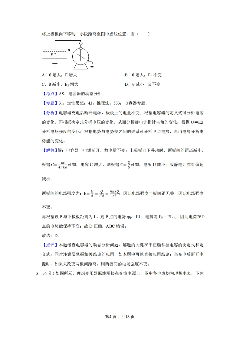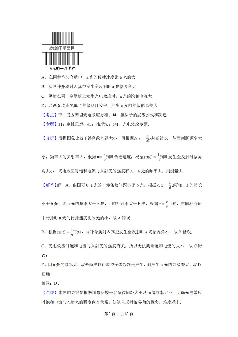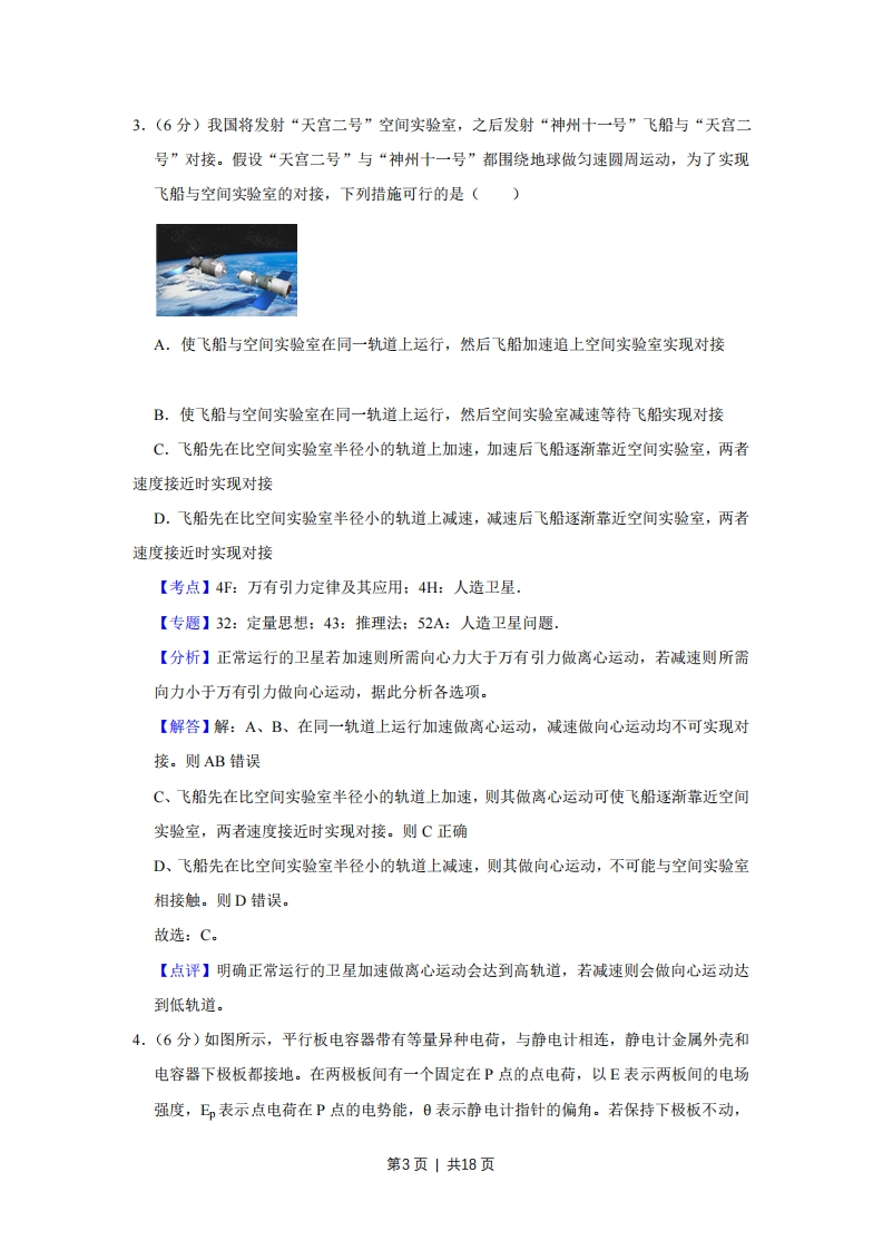 2016年天津市高考物理试卷解析版套考答案与试题解析一、单项选择题(每小题6分,共30分,每小题给出的四个选项中,只有一个选项是正确的)1.(6分)我国成功研发的反隐身先进米波雷达堪称隐身飞机的克星,它标志着我国雷达研究又创新的里程碑。米波雷达发射无线电波的波长在1~10m范围内,对该无线电波的判断正确的是()A.米波的频率比厘米波频率高B.和机械波一样须靠介质传播C.同光波一样会发生反射现象D.不可能产生干涉和衍射现象【考点】F2:机械波:G4:电磁波的发射、传播和接收.【专题】31:定性思想:43:推理法:54R:电磁场理论和电磁波.【分析】电磁波能在真空中传播,机械波不能在真空中传播,干涉和衍射是波特有的现象,光可以发生反射现象。【解答】解:根据=可知,波长越长,频率越低,故米波的频率比厘米频率低,故A错误:B、无线电波不需要介质传播,故B错误:C、无线电波同光波一样会发生反射现象,故C正确:D、干涉和衍射是波特有的现象,所以无线电波能产生干涉和衍射现象,故D错误。故选:C。【点评】本题要注意机械波和电磁波都能发生反射、折射、干涉和衍射等现象,但是机械波不能在真空中传播,电磁波能在真空中传播。2.(6分)如图是a、b两光分别经过同一双缝干涉装置后在屏上形成的干涉图样,则()第1页1共18页a光的干涉图样光的干涉图样A.在同种均匀介质中,a光的传播速度比b光的大B.从同种介质射入真空发生全反射时a光临界角大C.照射在同一金属板上发生光电效应时,a光的饱和电流大D.若两光均由氢原子能级跃迁发生,产生a光的能级能量差大【考点】E:爱因斯坦光电效应方程:J4:氢原子的能级公式和跃迁.【专题】31:定性思想:43:推理法:54:光电效应专题,【分析】根据图象比较干涉条纹间距大小,再根据△x=台判断波长,从而判断频率大小,频率大的折射率大,根据=判断传播速度,根据smC=判断发生全反射时临界角大小,光电效应时饱和电流与入射光的强度有关,a光的频率大,则能量大.【解答】解:A、由图可知a光的干涉条纹间距小于b光,根据△x=二河知,a的波长小于b光,则a光的频率大于b光,a的折射率大于b光,根据n=S可知,在同种介质17中传播时a光的传播速度比b光的小,故A错误:B、根据smC=可知,同种介质射入真空发生全反射时a光临界角小,故B错误:1C、光电效应时饱和电流与入射光的强度有关,所以无法判断饱和电流的大小,故C错误:D、因a光的频率大,故若两光均由氢原子能级跃迁产生,则产生a光的能级差大,故D正确。故选:D。【点评】本题的关键是根据图象比较干涉条纹间距大小从而得频率大小,明确光电效应时饱和电流与入射光的强度也有关系,知道全反射临界角的概念,难度适中,第2页|共18页3.(6分)我国将发射“天宫二号”空间实验室,之后发射“神州十一号”飞船与“天宫二号”对接。假设“天宫二号”与“神州十一号”都围绕地球做匀速圆周运动,为了实现飞船与空间实验室的对接,下列措施可行的是()A.使飞船与空间实验室在同一轨道上运行,然后飞船加速追上空间实验室实现对接B.使飞船与空间实验室在同一轨道上运行,然后空间实验室减速等待飞船实现对接C.飞船先在比空间实验室半径小的轨道上加速,加速后飞船逐渐靠近空间实验室,两者速度接近时实现对接D.飞船先在比空间实验室半径小的轨道上减速,减速后飞船逐渐靠近空间实验室,两者速度接近时实现对接【考点】4F:万有引力定律及其应用:4H:人造卫星.【专题】32:定量思想:43:推理法:52A:人造卫星问题【分析】正常运行的卫星若加速则所需向心力大于万有引力做离心运动,若减速则所需向力小于万有引力做向心运动,据此分析各选项。【解答】解:A、B、在同一轨道上运行加速做离心运动,减速做向心运动均不可实现对接。则AB错误C、飞船先在比空间实验室半径小的轨道上加速,则其做离心运动可使飞船逐渐靠近空间实验室,两者速度接近时实现对接。则C正确D、飞船先在比空间实验室半径小的轨道上减速,则其做向心运动,不可能与空间实验室相接触。则D错误。故选:C。【点评】明确正常运行的卫星加速做离心运动会达到高轨道,若减速则会做向心运动达到低轨道。4.(6分)如图所示,平行板电容器带有等量异种电荷,与静电计相连,静电计金属外壳和电容器下极板都接地。在两极板间有一个固定在P点的点电荷,以E表示两板间的电场强度,E,表示点电荷在P点的电势能,日表示静电计指针的偏角。若保持下极板不动,第3页1共18页