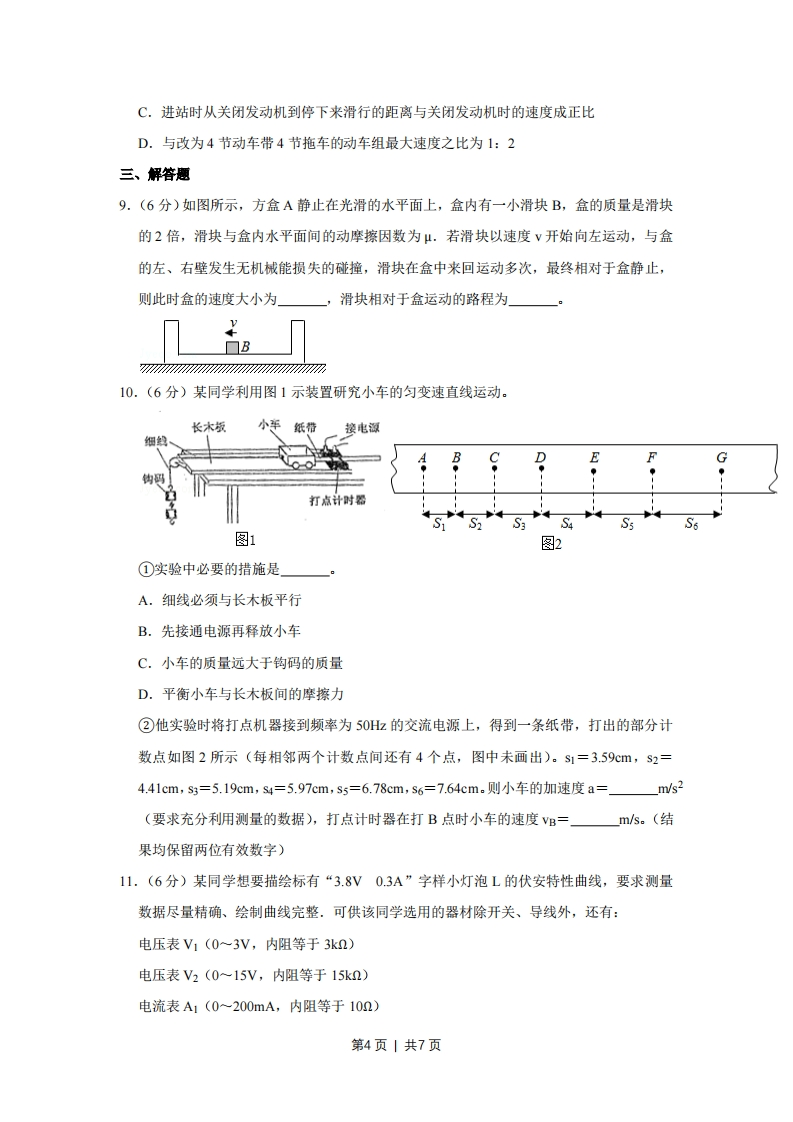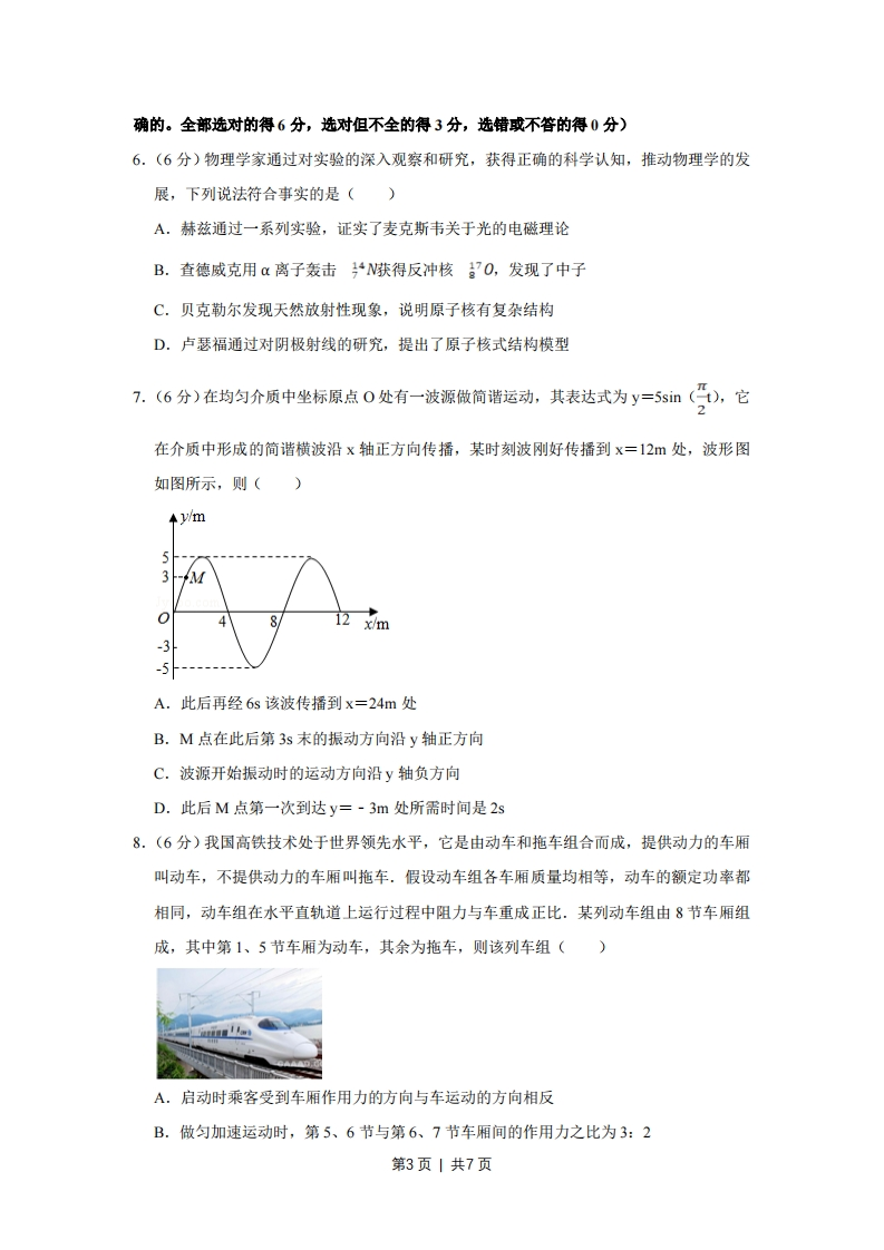 2016年天津市高考物理试卷一、单项选释题(每小思6分,共30分,每小题给出的四个选项中,只有一个选项是正确的)1.(6分)我国成功研发的反隐身先进米波雷达堪称隐身飞机的克星,它标志着我国雷达研究又创新的里程碑。米波雷达发射无线电波的波长在1~10m范围内,对该无线电波的判断正确的是()A.米波的频率比厘米波频率高B.和机械波一样须靠介质传播C.同光波一样会发生反射现象D.不可能产生干涉和衍射现象2.6分)如图是、b两光分别经过同一双缝干涉装置后在屏上形成的干涉图样,则()a光的干涉图样b光的干涉图样A.在同种均匀介质中,a光的传播速度比b光的大B.从同种介质射入真空发生全反射时a光临界角大C.照射在同一金属板上发生光电效应时,a光的饱和电流大D.若两光均由氢原子能级跃迁发生,产生a光的能级能量差大3.(6分)我国将发射“天宫二号”空间实验室,之后发射“神州十一号”飞船与“天宫二号”对接。假设“天宫二号”与“神州十一号”都围绕地球做匀速圆周运动,为了实现飞船与空间实验室的对接,下列措施可行的是()第1页1共7页A.使飞船与空间实验室在同一轨道上运行,然后飞船加速追上空间实验室实现对接B.使飞船与空间实验室在同一轨道上运行,然后空间实验室减速等待飞船实现对接C.飞船先在比空间实验室半径小的轨道上加速,加速后飞船逐渐靠近空间实验室,两者速度接近时实现对接D.飞船先在比空间实验室半径小的轨道上减速,减速后飞船逐渐靠近空间实验室,两者速度接近时实现对接4.(6分)如图所示,平行板电容器带有等量异种电荷,与静电计相连,静电计金属外壳和电容器下极板都接地。在两极板间有一个固定在P点的点电荷,以E表示两板间的电场强度,E表示点电荷在P点的电势能,日表示静电计指针的偏角。若保持下极板不动,将上极板向下移动一小段距离至图中虚线位置,则()A.0增大,E增大B.0增大,Ep不变C.日减小,Ep增大D.日减小,E不变5.(6分)如图所示,理想变压器原线圈接在交流电源上,图中各电表均为理想电表,下列R说法正确的是()A.当滑动变阻器的滑动触头P向上滑动时,R,消耗的功率变大B.当滑动变阻器的滑动触头P向上滑动时,电压表V示数变大C.当滑动变阻器的滑动触头P向上滑动时,电流表A1示数变大D.若闭合开关S,则电流表A1示数变大,A2示数变大二、不定向选择题(年小题6分,共18分。每小题给出的四个选项中,都有多个选项是正第2页丨共7页确的。全部选对的得6分,选对但不全的得3分,选错或不答的得0分)6.(6分)物理学家通过对实验的深入观察和研究,获得正确的科学认知,推动物理学的发展,下列说法符合事实的是()A.赫兹通过一系列实验,证实了麦克斯韦关于光的电磁理论B.查德威克用α离子轰击4获得反冲核:7O,发现了中子C.贝克勒尔发现天然放射性现象,说明原子核有复杂结构D.卢瑟福通过对阴极射线的研究,提出了原子核式结构模型7.(6分)在均匀介质中坐标原点0处有一波源做简谐运动,其表达式为y=5si(),它在介质中形成的简谐横波沿x轴正方向传播,某时刻波刚好传播到x=12m处,波形图如图所示,则()y/m382x/m-5-------A.此后再经6s该波传播到x=24m处B.M点在此后第3s末的振动方向沿y轴正方向C.波源开始振动时的运动方向沿y轴负方向D.此后M点第一次到达y=-3m处所需时间是2s8.(6分)我国高铁技术处于世界领先水平,它是由动车和拖车组合而成,提供动力的车厢叫动车,不提供动力的车厢叫拖车,假设动车组各车厢质量均相等,动车的额定功率都相同,动车组在水平直轨道上运行过程中阻力与车重成正比.某列动车组由8节车厢组成,其中第1、5节车厢为动车,其余为拖车,则该列车组()A.启动时乘客受到车厢作用力的方向与车运动的方向相反B.做匀加速运动时,第5、6节与第6、7节车厢间的作用力之比为3:2第3页丨共7页