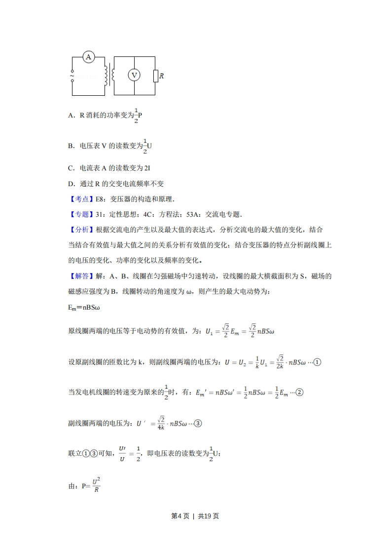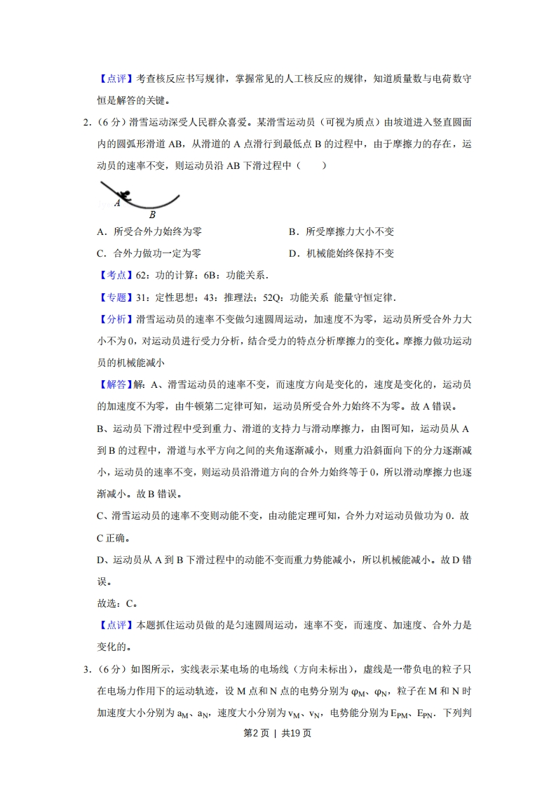 2018年天津市高考物理试卷解析版◆考答案与试题解折一、单项选择题(每小题6分,共30分。每小题给出的四个选项中,只有一个选项是正确的)1.(6分)国家大科学工程--中国散裂中子源(CSNS)于2017年8月28日首次打靶成功,获得中子束流,可以为诸多领域的研究和工业应用提供先进的研究平台。下列核反应中放出的粒子为中子的是()A.N俘获一个α粒子,产生!0并放出一个粒子B.A1俘获一个α粒子,产生P并放出一个粒子C.B俘获一个质子,产生Be并放出一个粒子D.Li俘获一个质子,产生He并放出一个粒子【考点】:裂变反应和聚变反应.【专题】31:定性思想:43:推理法:54O:衰变和半衰期专题.【分析】依据质量数与电荷数守恒:裂变是较重的原子核分裂成较轻的原子核的反应。【解答】解:A、N俘获一个α粒子,产生70后,新粒子的质量数为14+4-17=1,电荷数为:7+2-8=1,所以粒子为质子。故A错误:B、A1俘获一个α粒子,产生P后,粒子的质量数为27+4-30=1,电荷数为:13+2-15=0,所以粒子为中子。故B正确:C、B俘获一个质子,产生B后,粒子的质量数为11+1-8=4,电荷数为5+1-4=2,所以粒子为α粒子。故C错误:D、Li俘获一个质子,产生He后,粒子的质量数为6+1-3=4,电荷数为:3+1-2=2,所以粒子为《粒子。故D错误故选:B。第1页1共19页【点评】考查核反应书写规律,掌握常见的人工核反应的规律,知道质量数与电荷数守恒是解答的关键。2.(6分)滑雪运动深受人民群众喜爱。某滑雪运动员(可视为质点)由坡道进入竖直圆面内的圆弧形滑道AB,从滑道的A点滑行到最低点B的过程中,由于摩擦力的存在,运动员的速率不变,则运动员沿AB下滑过程中()BA.所受合外力始终为零B.所受摩擦力大小不变C.合外力做功一定为零D.机械能始终保持不变【考点】62:功的计算:6B:功能关系【专题】31:定性思想:43:推理法:52Q:功能关系能量守恒定律【分析】滑雪运动员的速率不变做匀速圆周运动,加速度不为零,运动员所受合外力大小不为0,对运动员进行受力分析,结合受力的特点分析摩擦力的变化。摩擦力做功运动员的机械能减小【解答】解:A、滑雪运动员的速率不变,而速度方向是变化的,速度是变化的,运动员的加速度不为零,由牛顿第二定律可知,运动员所受合外力始终不为零。故A错误。B、运动员下滑过程中受到重力、滑道的支持力与滑动摩擦力,由图可知,运动员从A到B的过程中,滑道与水平方向之间的夹角逐渐减小,则重力沿斜面向下的分力逐渐减小,运动员的速率不变,则运动员沿滑道方向的合外力始终等于0,所以滑动摩擦力也逐渐减小。故B错误。C、滑雪运动员的速率不变则动能不变,由动能定理可知,合外力对运动员做功为0.故C正确。D、运动员从A到B下滑过程中的动能不变而重力势能减小,所以机械能减小。故D错误。故选:C。【点评】本题抓住运动员做的是匀速圆周运动,速率不变,而速度、加速度、合外力是变化的。3.(6分)如图所示,实线表示某电场的电场线(方向未标出),虚线是一带负电的粒子只在电场力作用下的运动轨迹,设M点和N点的电势分别为pM~pN,粒子在M和N时加速度大小分别为aM、aN,速度大小分别为VM、N,电势能分别为EPM EPN·下列判第2页1共19页断正确的是(NMA.VM