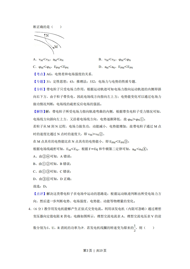 p①:若粒子从M到N过程,电场力做负功,动能减小,电势能增加,故带电粒子通过M点时的速度比通过N点时的速度大,即VM>V②,在M点具有的电势能比在N点具有的电势能小,即EPM