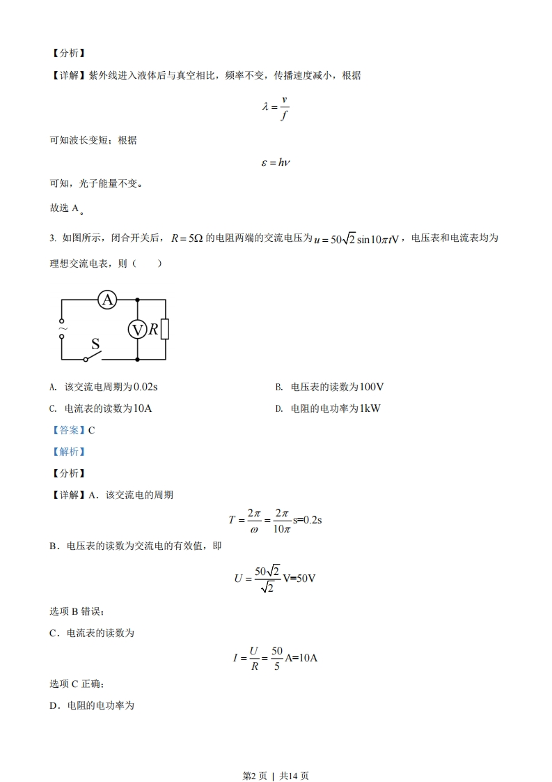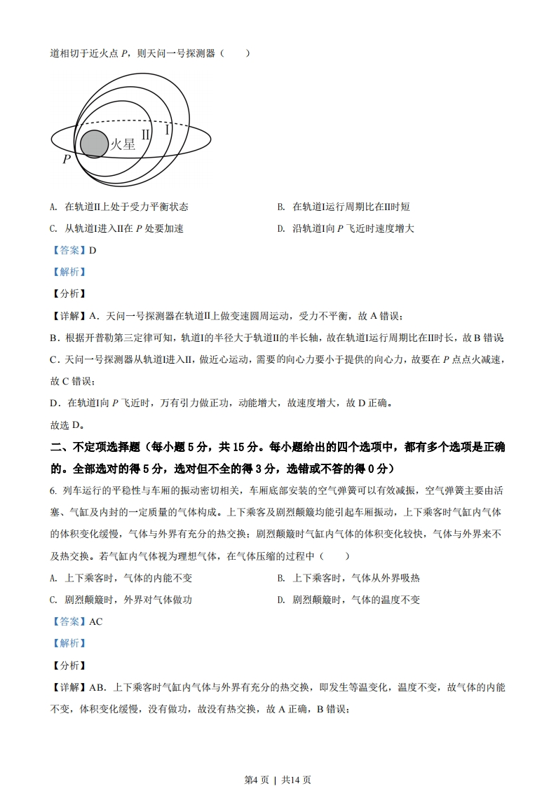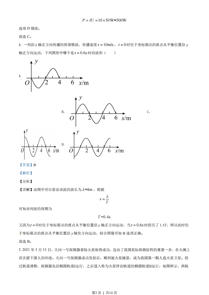 2021年天津市普通高中学业水平等级性考试物理本试卷分为第I卷(选择题)和第Ⅱ卷(非选择题)两部分,共100分,考试用时60分钟。第I卷1至3页,第Ⅱ卷4至7页。答卷前,考生务必将自山的姓名、考生号、考场号和座位号填写在答题卡上,并在规定位置粘贴考试用条形码。答卷时,考生务必将答案涂写在答题卡上,答在试卷上的无效。考试结束后,将本试卷和答题卡一并交回。祝各位考生考试顺利!第I卷注意事项:1.每题选出答案后,用铅笔将答题卡上对应题目的答案标号涂黑。如需改动,用橡皮擦干净后,再选涂其他答案标号。2.本卷共8题,每题5分,共40分。一、单项选择题(每小题5分,共25分。每小题给出的四个选项中,只有一个选项是正确的)1.科学研究方法对物理学的发展意义深远,实验法、归纳法、演绎法、类比法、理想实验法等对揭示物理现象的本质十分重要。下列哪个成果是运用理想实验法得到的()A牛顿发现“万有引力定律”B.库仑发现“库仑定律”C.法拉第发现“电磁感应现象”D.伽利略发现“力不是维持物体运动的原因”【答案】D【解析】【分析】【详解】牛顿发现“万有引力定律”:库伦发现“库仑定律”:法拉第发现“电磁感应现象”,这些都是建立在大量的实验的基础上直接得出的结论而伽利略发现“力不是维持物体运动的原因”,是在实验的基础上经过抽象推理得出的结论,即运用了理想实验法。故选D。2.光刻机是制造芯片的核心装备,利用光源发出的紫外线,将精细图投影在硅片上,再经技术处理制成芯片。为提高光刻机清晰投影最小图像的能力,在透镜组和硅片之间充有液体。紫外线进入液体后与其在真空中相比()A.波长变短B.光子能量增加C.频率降低D.传播速度增大【答案】A【解析】第1页」共14页【分析】【详解】紫外线进入液体后与真空相比,频率不变,传播速度减小,根据可知波长变短:根据s=hy可知,光子能量不变。故选A。3.如图所示,闭合开关后,R=52的电阻两端的交流电压为u=50√2si10πV,电压表和电流表均为理想交流电表,则()A.该交流电周期为0.02sB.电压表的读数为100VC.电流表的读数为10AD.电阻的电功率为1kW【答案】C【解析】【分析】【详解】A.该交流电的周期T=2=2π-0.2s010πB.电压表的读数为交流电的有效值,即U=50V2V=50V选项B错误:C.电流表的读数为1=-50=A=10AR选项C正确:D.电阻的电功率为第2页」共14页P=IU=10×50W=500W选项D错误。故选C。4.一列沿x轴正方向传播的简谐横波,传播速度v=10/S,t=0时位于坐标原点的质点从平衡位置沿y轴正方向运动,下列图形中哪个是1=0.6s时的波形()x/mC.6 x/m6 x/m【答案】B【解析】【分析】【详解】由图中可以看出该波的波长为入=4m,根据V-T可知该列波的周期为T=0.4s又因为1=0时位于坐标原点的质点从平衡位置沿y轴正方向运动,当1=0.6s时经历了1.5T,所以此时位于坐标原点的质点从平衡位置沿y轴负方向运动,结合图像可知B选项正确。故选B。5.2021年5月15日,天问一号探测器着陆火星取得成功,迈出了我国星际探测征程的重要一步,在火属上首次留下国人的印迹。天问一号探测器成功发射后,顺利被火星捕获,成为我国第一颗人造火星卫星。经过轨道调整,探测器先沿椭圆轨道运行,之后进入称为火星停泊轨道的椭圆轨道运行,如图所示,两轨第3页|共14页