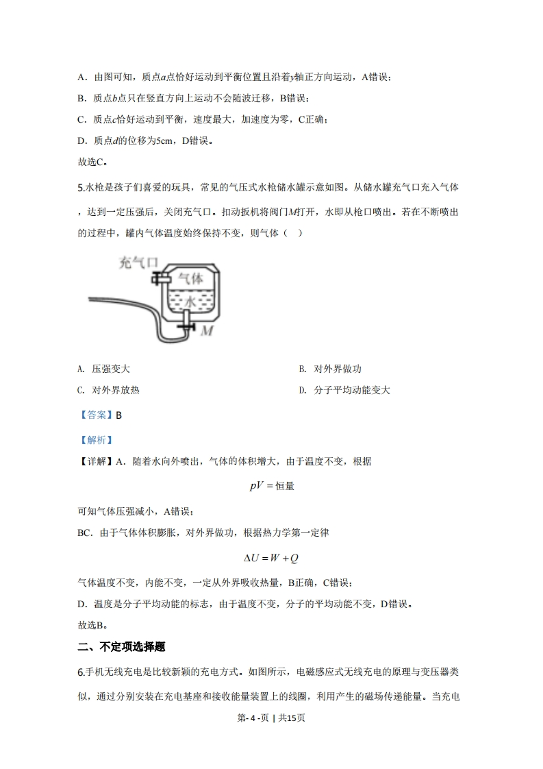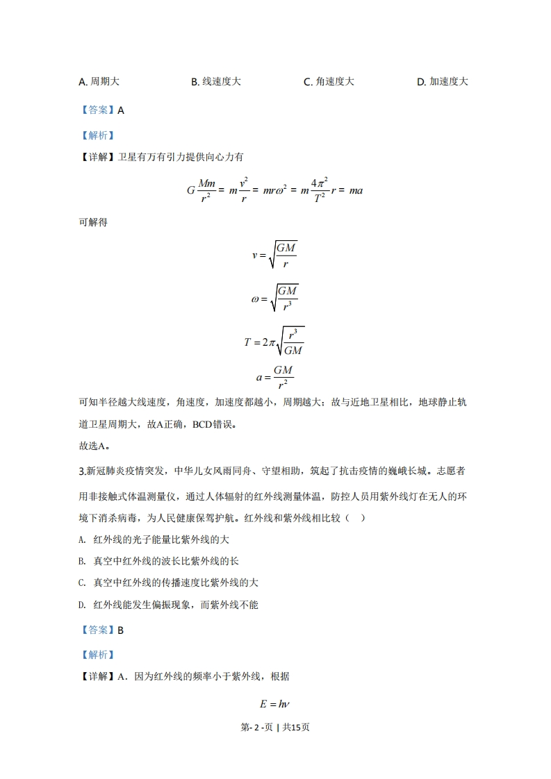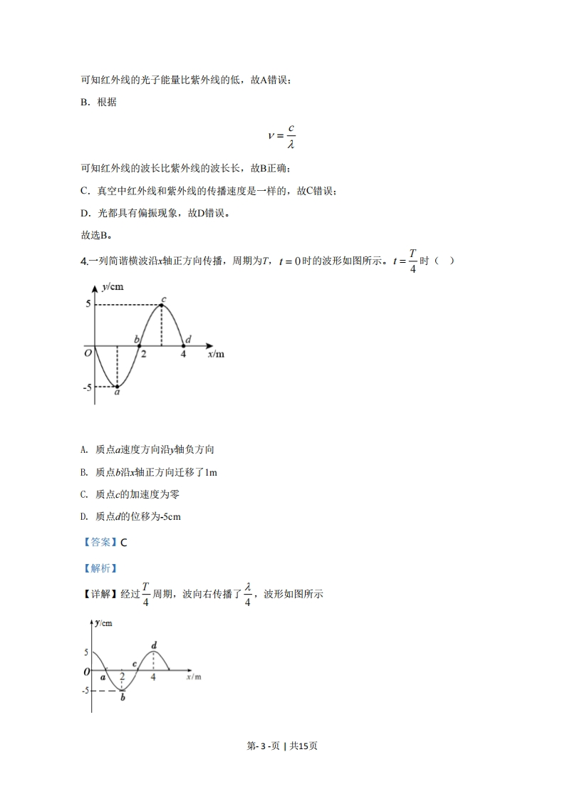2020年天津市普通高中学业水平等级性考试物理一、单项选择题1.在物理学发展的进程中,人们通过对某些重要物理实验的深入观察和研究,获得正确的理论认识。下列图示的实验中导致发现原子具有核式结构的是()验电器锌板紫外线灯粒子薄茂光线园电路【答案】D【解析】【详解】A.双缝干涉实验说明了光具有波动性,故A错误:B.光电效应实验,说明了光具有粒子性,故B错误:C.实验是有关电磁波的发射与接收,与原子核无关,故C错误:D.卢瑟福的α粒子散射实验导致发现了原子具有核式结构,故D正确:故选D。2北斗问天,国之夙愿。我国北斗三号系统的收官之星是地球静止轨道卫星,其轨道半径约为地球半径的7倍。与近地轨道卫星相比,地球静止轨道卫星()第-1-页1共15页A.周期大B.线速度大C.角速度大D.加速度大【答案】A【解析】【详解】卫星有万有引力提供向心力有4x2GMm=m=nwo=mT产r=ma可解得GMV=GMT=2πGMGMa=可知半径越大线速度,角速度,加速度都越小,周期越大:故与近地卫星相比,地球静止轨道卫星周期大,故A正确,BCD错误。故选A。3新冠肺炎疫情突发,中华儿女风雨同舟、守望相助,筑起了抗击疫情的巍峨长城。志愿者用非接触式体温测量仪,通过人体辐射的红外线测量体温,防控人员用紫外线灯在无人的环境下消杀病毒,为人民健康保驾护航。红外线和紫外线相比较()A.红外线的光子能量比紫外线的大B.真空中红外线的波长比紫外线的长C.真空中红外线的传播速度比紫外线的大D.红外线能发生偏振现象,而紫外线不能【答案】B【解析】【详解】A.因为红外线的频率小于紫外线,根据E=hv第-2-页1共15页可知红外线的光子能量比紫外线的低,故A错误:B.根据V=c可知红外线的波长比紫外线的波长长,故B正确:C.真空中红外线和紫外线的传播速度是一样的,故C错误:D.光都具有偏振现象,故D错误。故选B。T4.一列简谐横波沿x轴正方向传播,周期为T,1=0时的波形如图所示。1=一时()4◆/cmx/mA.质点a速度方向沿轴负方向B.质点b沿x轴正方向迁移了1mC.质点c的加速度为零D.质点d的位移为-5cm【答案】C【解析】T【详解】经过二周期,波向右传播了4,波形如图所示y/cmx/m第-3-页1共15页