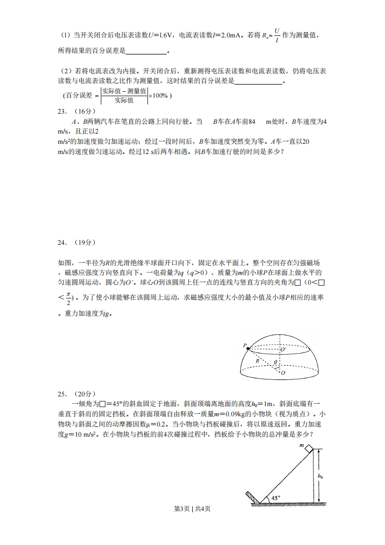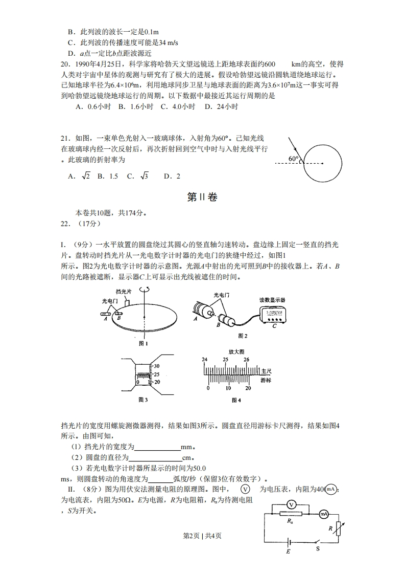 绝密★启用前2008年普通高等学校招生全国统一考试(四川卷)理科综合能力测试第I卷二、选择题(本题共8小题。在每小题给出的四个选项中,有的只有一个选项正确,有的有多个选项正确,全部选对的得6分,选对但不全的得3分,有选错的得0分)14.下列说法正确的是A.物体吸收热量,其温度一定升高B.热量只能从高温物体向低温物体传递C.遵守热力学第一定律的过程一定能实现D.做功和热传递是改变物体内能的两种方式15.下列说法正确的是A.口射线在电场和磁场中都不会发生偏转B.口射线比口射线更容易使气体电离C.太阳辐射的能量主要来源于重核裂变D.核反应堆产生的能量来自轻核聚变16.如图,一理想变压器原线圈接入一交流电源,副线圈电路中R1、R、R和R均为固定电阻,开关S是闭合○和为理想电压表,读数分别为U和U2:@g和为理想电流表,读数分别为山1、2和3。现断开S,U1数值不变,下列推断中正确的是A.U2变小、3变小B.U2不变、I变大C.变小、2变小D.变大、I2变大17.在沿水平方向的匀强磁场中,有一圆形金属线圈可绕沿其直径的竖直轴自由转动。开始时线圈静止,线圈平面与磁场方向既不平行也不垂直,所成的锐角为口。在磁场开始增强后的一个极短时间内,线圈平面A.维持不动B.将向使口减小的方向转动C.将向使口增大的方向转动D.将转动,因不知磁场方向,不能确定口会增大还是会减小18.一物体沿固定斜面从静止开始向下运动,经过时间滑至斜面底端。己知在物体运动过程中物体所受的摩擦力恒定。若用F、、s和E分别表示该物体所受的合力、物体的速度、位移和机械能,则下列图象中可能正确的是19.一列简谐横波沿直线传播,该直线上的a、b两点相距4.42m。图中实、虚两条曲线分别表示平衡位置在a、b两点处质点的振动曲线。从图示可知0.03A.此列波的频率一定是10Hz第1页|共4页B.此列波的波长一定是0.1mC.此列波的传播速度可能是34m/sD.a点一定比b点距波源近20.1990年4月25日,科学家将哈勃天文望远镜送上距地球表面约600km的高空,使得人类对宇宙中星体的观测与研究有了极大的进展。假设哈勃望远镜沿圆轨道绕地球运行。己知地球半径为6.4×10m,利用地球同步卫星与地球表面的距离为3.6×107m这一事实可得到哈勃望远镜绕地球运行的周期。以下数据中最接近其运行周期的是A.0.6小时B.1.6小时C.4.0小时D.24小时21.如图,一束单色光射入一玻璃球体,入射角为60°。己知光线在玻璃球内经一次反射后,再次折射回到空气中时与入射光线平行。此玻璃的折射率为60°A.√5B.1.5C.√5D.2第川卷本卷共10题,共174分。22.(17分)I.(9分)一水平放置的圆盘绕过其圆心的竖直轴匀速转动。盘边缘上固定一竖直的挡光片。盘转动时挡光片从一光电数字计时器的光电门的狭缝中经过,如图1所示。图2为光电数字计时器的示意图。光源A中射出的光可照到B中的接收器上。若A、B间的光路被遮断,显示器C上可显示出光线被遮住的时间。挡光片光电门光电门门读数显示器图2图1放大图242526¥3025Wi主尽20游标01020图4挡光片的宽度用螺旋测微器测得,结果如图3所示。圆盘直径用游标卡尺测得,结果如图4所示。由图可知,(1)挡光片的宽度为mm。(2)圆盘的直径为(3)若光电数字计时器所显示的时间为50.0ms,则圆盘转动的角速度为弧度/秒(保留3位有效数字)。Ⅱ.(8分)图为用伏安法测量电阻的原理图。图中,)为电压表,内阻为40m为电流表,内阻为502。E为电源,R为电阻箱,R为待测电阻,S为开关。第2页|共4页()当开关闭合后电压表读数U=16V,电流表读数=20mA.若将R=号作为测量值,所得结果的百分误差是(2)若将电流表改为内接。开关闭合后,重新测得屯压表读数和电流表读数,仍将电压表读数与电流表读数之比作为测量值,这时结果的百分误差是(百分误差=实际值-测量值×100%)实际值23.(16分)A、B两辆汽车在笔直的公路上同向行驶。当B车在A车前84m处时,B车速度为4m/s,且正以2m/s的加速度做匀加速运动:经过一段时间后,B车加速度突然变为零。A车一直以20m/s的速度做匀速运动。经过12s后两车相遇。问B车加速行驶的时间是多少?24.(19分)如图,一半径为R的光滑绝缘半球面开口向下,固定在水平面上。整个空间存在匀强磁场,磁感应强度方向竖直向下。一电荷量为g(q>0)、质量为m的小球P在球面上做水平的匀速圆周运动,圆心为O'。球心O到该圆周上任一点的连线与竖直方向的夹角为口(0<口<)。为了使小球能够在该圆周上运动,求磁感应强度大小的最小值及小球P相应的速率。重力加速度为g。R025.(20分)一倾角为口=45°的斜血固定于地面,斜面项端离地面的高度o=1m,斜面底端有一垂直于斜而的固定挡板。在斜面顶端自由释放一质量m=0.09纵g的小物块(视为质点)。小物块与斜面之间的动摩擦因数μ=02。当小物块与挡板碰撞后,将以原速返回。重力加速度g=10m/s2。在小物块与挡板的前4次碰撞过程中,挡板给予小物块的总冲量是多少?45第3页|共4页