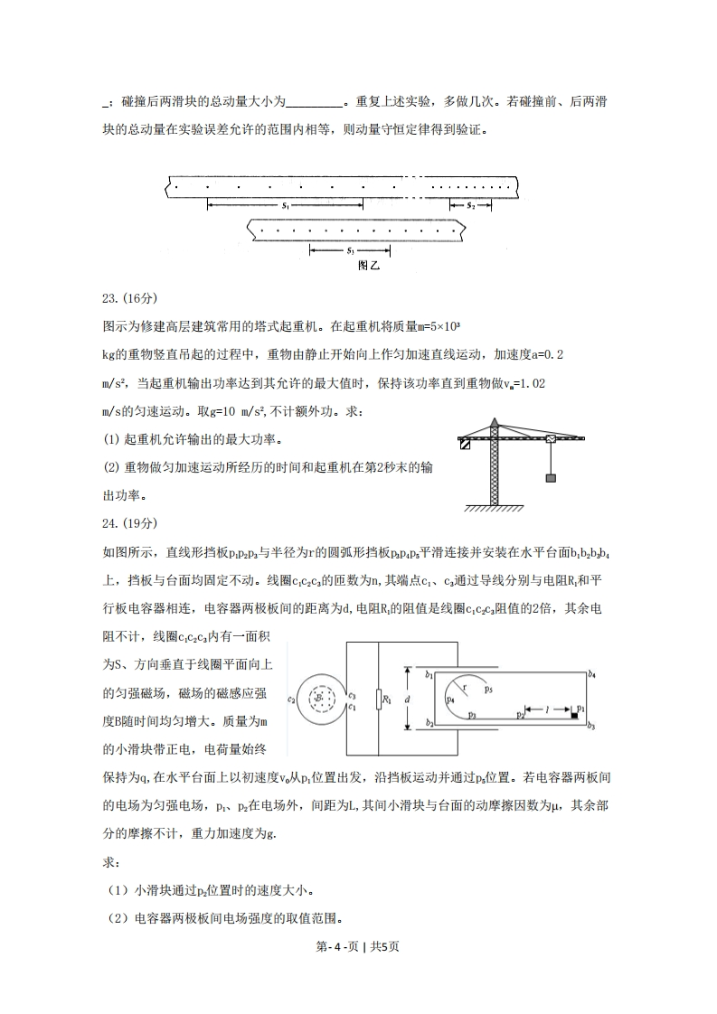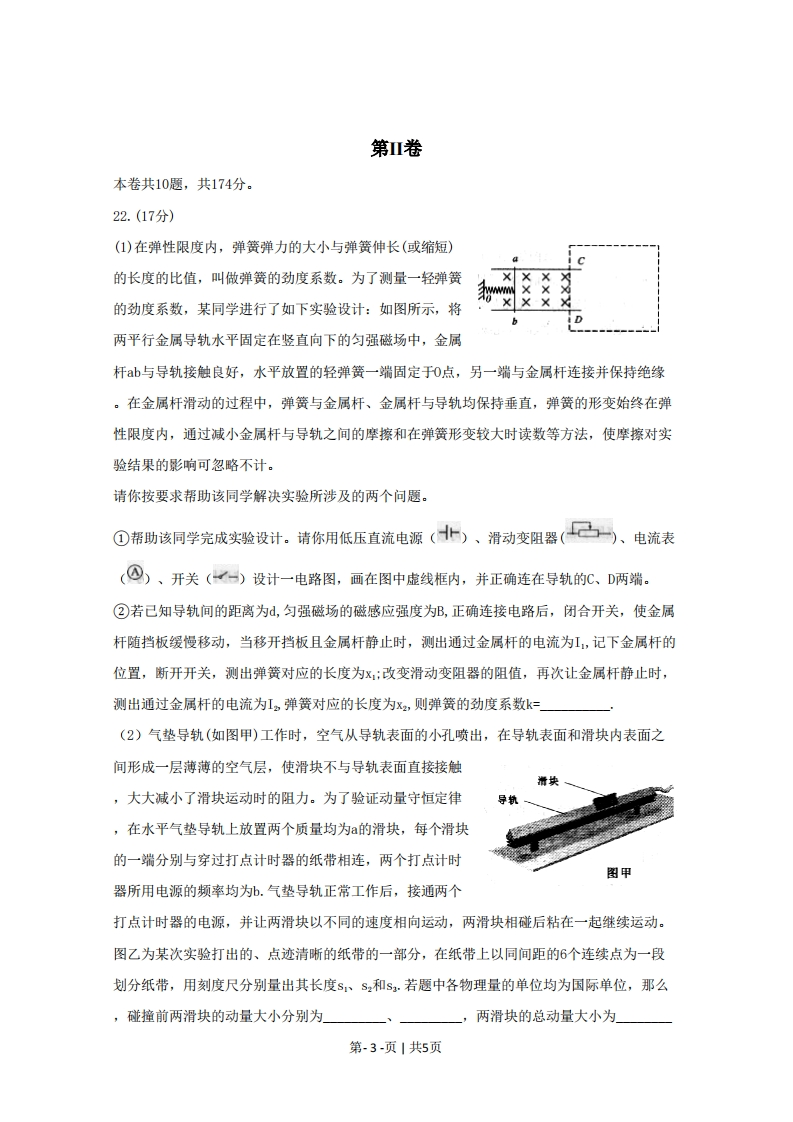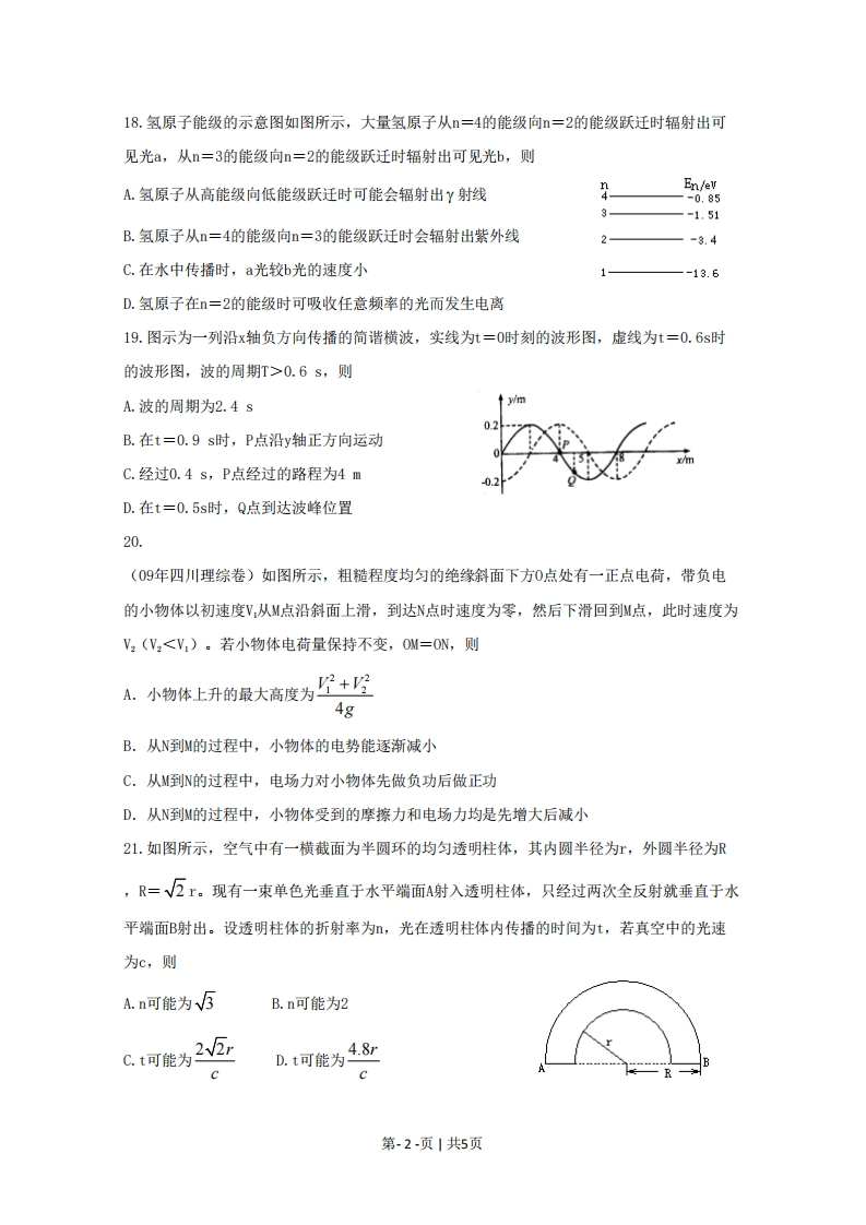 2009年普通高等学校招生全国统一考试(四川卷)理科综合物理部分二、选择题(本题包括8小题。每小题给出的四个选项中,有的只有一个选项正确,有的有多个选项正确,全部选对的得6分,选对但不全的得3分,有选错的得0分)14.关于电磁波,下列说法正确的是A.雷达是用X光来测定物体位置的设备B.使电磁波随各种信号而改变的技术叫做解调C.用红外线照射时,大额钞票上用荧光物质印刷的文字会发出可见光D.变化的电场可以产生变化的磁场15.据报道,2009年4月29日,美国亚利桑那州一天文观测机构发现一颗与太阳系其它行星逆向运行的小行星,代号为2009HC82。该小行星绕太阳一周的时间为3.39年,直径2~3千米,其轨道平面与地球轨道平面呈155的倾斜。假定该小行星与地球均以太阳为中心做匀速圆周运动,则小行星和地球绕太阳运动的速度大小的比值为A.3.39jB.3.392C.3.392033916.关于热力学定律,下列说法正确的是A.在一定条件下物体的温度可以降到0KB.物体从单一热源吸收的热量可全部用于做功C.吸收了热量的物体,其内能一定增加D.压缩气体总能使气体的温度升高17.如图甲所示,理想变压器原、副线圈的匝数比为10:1,R,=202,R2=302,C为电容器。己知通过R的正弦交流电如图乙所示,则A.交流电的频率为0.02HzB.原线圈输入电压的最大值为200√2V(图甲)C.电阻Rz的电功率约为6.67WD.通过R的电流始终为零0.011〔图乙)第-1-页1共5页18.氢原子能级的示意图如图所示,大量氢原子从n=4的能级向n=2的能级跃迁时辐射出可见光a,从n=3的能级向n=2的能级跃迁时辐射出可见光b,则A.氢原子从高能级向低能级跃迁时可能会辐射出Y射线En/ev-0.85-1.51B.氢原子从n=4的能级向n=3的能级跃迁时会辐射出紫外线-3.4C.在水中传播时,a光较b光的速度小-13.6D.氢原子在=2的能级时可吸收任意频率的光而发生电离19.图示为一列沿x轴负方向传播的简谐横波,实线为t=0时刻的波形图,虚线为t=0.6s时的波形图,波的周期T>0.6s,则A.波的周期为2.4s03B.在t=0.9s时,P点沿y轴正方向运动C.经过0.4s,P点经过的路程为4mD.在t=0.5s时,Q点到达波峰位置20(09年四川理综卷)如图所示,粗糙程度均匀的绝缘斜面下方0点处有一正点电荷,带负电的小物体以初速度V,从M点沿斜面上滑,到达N点时速度为零,然后下滑回到M点,此时速度为V2(V2