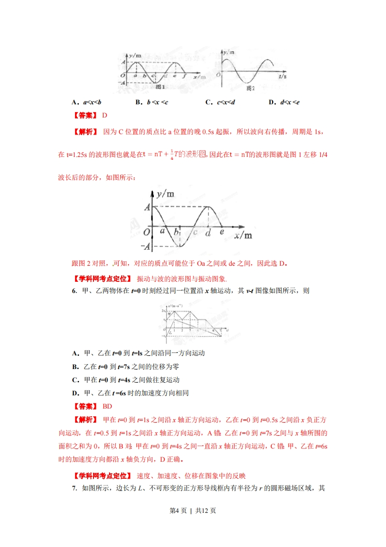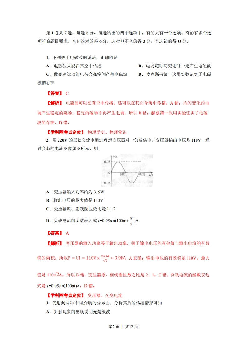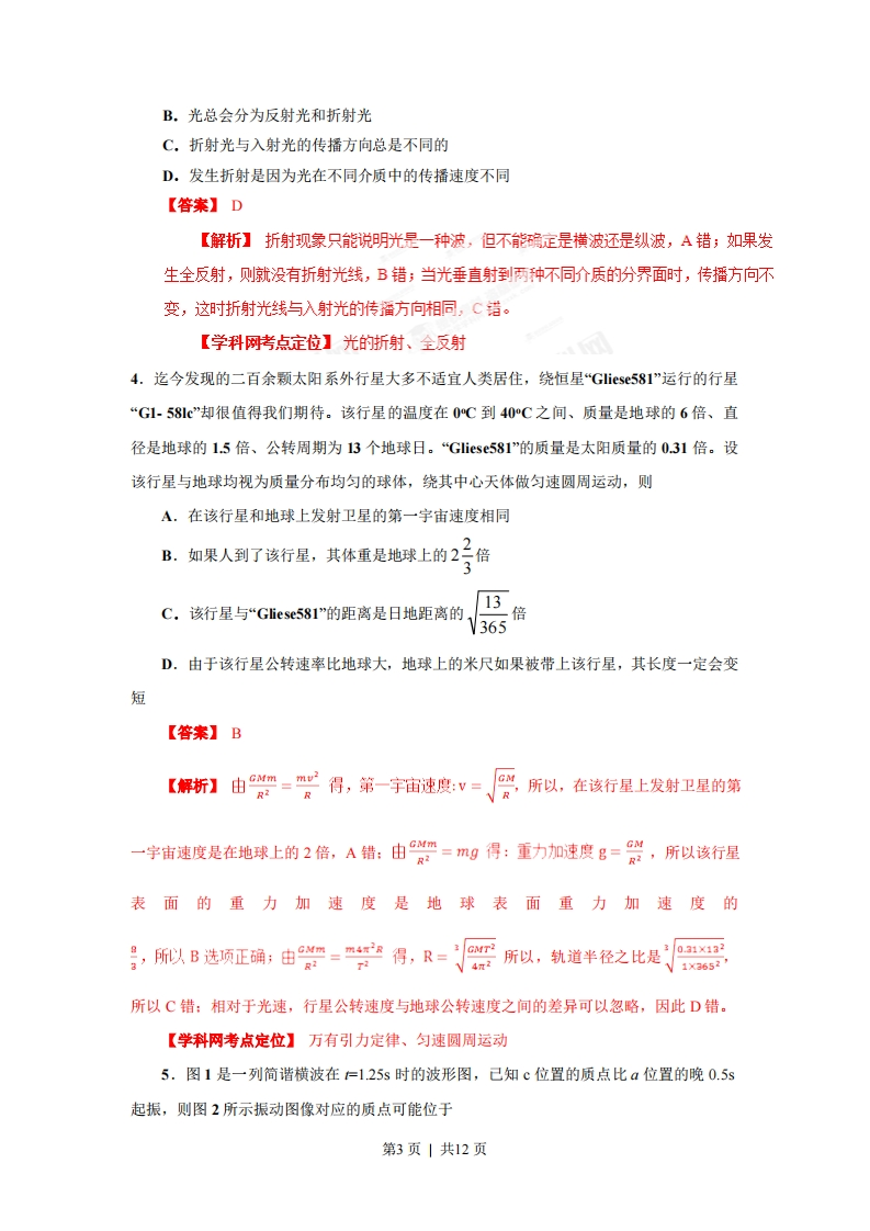 绝密★启用前2013年普通高等学校招生全国统一考试(四川卷)理科综合物理理科综合考试时间共150分钟,满分300分,其中,物理110分,化学100分,生物90分.物理试题卷分第1卷(选择题)和第Ⅱ卷(非选择题)。第1卷1至2页,第Ⅱ卷3至4页,共4页。考生作答时,须将答案答在答题卡上,在本试题卷、草稿纸上答题无效。考试结束后,将本试题卷和答题卡一并交回。【学科网试卷总评】:今年的四川理综卷物理部分试题,共有11个题目,其中前7题为选择题,后4题是非选择题。从选择题来看:第1题考查物理学史以及一些物理基本常识,第2题考察变压器及交变电流的最大值及有效值,第3题考察光的浙射相关知识,第4题考察万有引力定律及匀速圆周运动相关知识,第5题考察振动与波的波形图与振动图像之间的联系,第6题考察运动学中速度、位移及加速度在图像中的反映,第7题考察电磁感应和楞茨定律以及欧姆学律的掌握,知识跨度大,综合性较强。四个非选择题试题:第8题考察实验的掌握,涉及到的知识面很广,最后3个计算题,第9题紧跟实际生活,材料选自社会热点,难度不大。第10、11题综合性较强,有一定难度,以能力考查为主。综合分析本套卷优点较多。优点一:总体上来讲,试题覆盖面较广,分数的分布也较为合理。紧密结合中学物理教学实际,各题的考查要求均能与新课程的教学相勿合,有效地实现人才的选拔,试卷风格特色鲜明,在坚持能力立意的基础上,注重联系实际,注重选材的多样性和公平性;优点二:较好地体现了课程标准所要求的考生应具备的各种能力。优点三:创设新情景、运用新材料进行命题。比如9题,以“中国式过马路引出本题的内容。当然,本套题也有一些细节不够完善。从试题内容来说,有的和识点没有涉及到。【本解析为学科网名师解析团队原创,授权学科网独家使用,如有盗用,依法追责!】第1卷(选择题共42分)注意事项:必须使用2B铅笔在答题卡上将所选答案对应的标号涂黑。第1页|共12页第1卷共7题,每题6分。每题给出的四个选项中,有的只有一个选项、有的有多个选项符合题目要求,全部选对的得6分,选对但不全的得3分,有选错的得0分。1.下列关于电磁波的说法,正确的是A.电磁波只能在真空中传播B。电场随时间变化时一定产生电磁波C.做变速运动的电荷会在空间产生电磁波D,麦克斯韦第一次用实验证实了电磁波的存在【答案】C【解析】电磁波可以在真空中传播,还可以在其它介质中传播,A错:均匀变化的电场产生稳定的磁场,稳定的磁场不再产生电场,所以B错:赫兹第一次用实验证实了电磁波的存在,D错。【学科网考点定位】物理学史、物理常识2.用220V的正弦交流电通过理想变压器对一负载供电,变压器输出电压是110V,通过负载的电流图像如图所示,则0.05002t/30.05A.变压器输入功率约为3.9WB.输出电压的最大值是110VC,变压器原、副线圈匝数比是1:2D.负载电流的函数表达式i=0.05sin(100mt+T)A2【答案】A【解析】变压器的输入功率等于输出功率,等于输出电压的有效值与输出电流的有效值的乘积,所以P=U=110V×o4≈3.9W,A正确:输出电压的有效值是110V,最大值是110N2A,所以B错:变压器原、副线圈匝数之比是2:1,C错:负载电流的函数表达式是i=0.05sin(100t)A,D错.【学科网考点定位】变压器、交变电流3.光射到两种不同介质的分界面,分析其后的传播情形可知A,折射现象的出现说明光是纵波第2页|共12页B.光总会分为反射光和折射光C.折射光与入射光的传播方向总是不同的D。发生折射是因为光在不同介质中的传播速度不同【答案】D【解析】折射现象只能说明光是一种波,但不能确定是横波还是纵波,A错;如果发生全反射,则就没有折射光线,B错;当光垂直射到两种不同阶质的分界面时,传播方向不变,这时折射光线与入射光的传潘方向相同,C诺。【学科网转点定位】光的折射、全反射4.迄今发现的二百余颗太阳系外行星大多不适宜人类居住,绕恒星“Gliese581”运行的行星“G1-58lc却很值得我们期待。该行星的温度在0℃到40C之间、质量是地球的6倍、直径是地球的1.5倍、公转周期为13个地球日。“Gliese581的质量是太阳质量的031倍。设该行星与地球均视为质量分布均匀的球体,绕其中心天体做匀速圆周运动,则A.在该行星和地球上发射卫星的第一宇宙速度相同B.如果人到了该行星,其体重是地球上的2二倍313C,该行星与“Gliese581”的距离是日地距离的倍365D.由于该行星公转速率比地球大,地球上的米尺如果被带上该行星,其长度一定会变短【答案】B【解折】由微=得,第一宇宙速度:v=GMR所以,在该行星上发射卫星的第一字宙速度是在地球上的2倍,A错:由=mg得:重力加速度g=,所以该行星表面的重力加速度是地球表面重力加速度的,所似B选项正确;由警=产得,R=T所以,轨道半径之比是0.31×13221×3652?所以C错:相对于光速,行星公转速度与地球公转速度之间的差异可以忽略,因此D错。【学科网考点定位】万有引力定律、匀速圆周运动5.图1是一列简谐横波在=125s时的波形图,己知c位置的质点比a位置的晚0.5s起振,则图2所示振动图像对应的质点可能位于第3页|共12页
