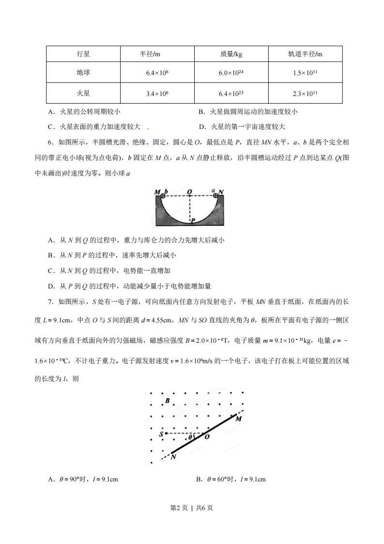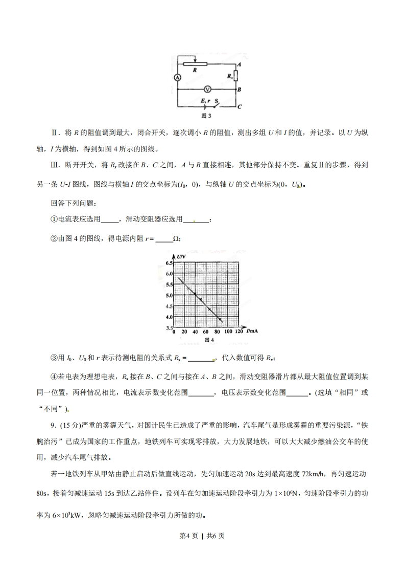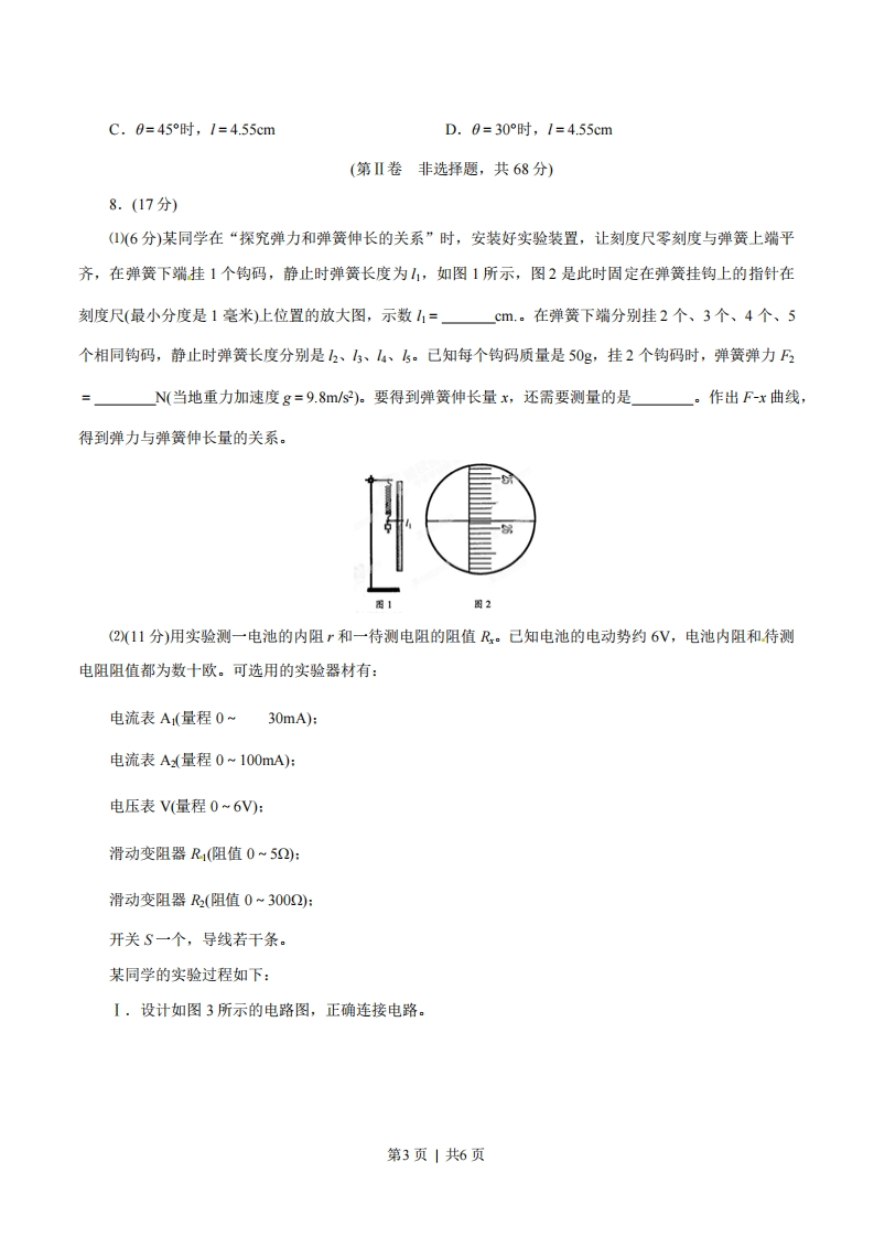 2015年高考四川卷理科综合(物理部分)试题(第I卷选择题共7题,共42分)年题给出的四个选项中,有的只有一个选项、有的有多个选项符合题目要求,全部选对的得6分,选对但不全的得3分,有错选和不选的得0分。1.在同一位置以相同的速率把三个小球分别沿水平、斜向上、斜向下方向抛出,不计空气阻力,则落在同一水平地面时的速度大小A.一样大B.水平抛的最大C.斜向上抛的最大D.斜向下抛的最大2.平静湖面传播着一列水面波(横波),在波的传播方向上有相距3m的甲、乙两小木块随波上下运动,测得两个小木块每分钟都上下30次,甲在波谷时,乙在波峰,且两木块之间有一个波峰。这列水面波A.频率是30HzB.波长是3mC.波速是1m/sD.周期是0.1s3.直线PP2过均匀玻璃球球心O,细光束α、b平行且关于PP2对称,由空气射入玻璃球的光路如图。a、b光相比6A.玻璃对a光的折射率较大B.玻璃对a光的临界角较小C.b光在玻璃中的传播速度较小、D.b光在玻璃中的传播时间较短4.小型手摇发电机线圈共N匝,每匝可简化为矩形线圈abcd,磁极间的磁场视为匀强磁场,方向垂直于线圈中心轴OO',线圈绕OO'匀速转动,如图所示。矩形线圈ab边和cd边产生的感应电动势的最大值都为0,不计线圈电阻,则发电机输出电压A.峰值是eoB.峰值是2eoC有效值是9心D.有效值是V2Ne5.登上火星是人类的梦想,“嫦娥之父”欧阳自远透露:中国计划于2020年登陆火星。地球和火星公转视为匀速圆周运动,忽略行星自转影响。根据下表,火星和地球相比第1页|共6页行星半径m质量kg轨道半径m地球6.4×1056.0×10241.5×1011火星3.4×1066.4×10232.3×1011A.火星的公转周期较小B.火星做圆周运动的加速度较小C.火星表面的重力加速度较大,D.火星的第一宇宙速度较大6.如图所示,半圆槽光滑、绝缘、固定,圆心是O,最低点是P,直径MN水平,a、b是两个完全相同的带正电小球(视为点电荷),b固定在M点,α从N点静止释放,沿半圆槽运动经过P点到达某点Q(图中未画出)时速度为零。则小球aMA.从N到Q的过程中,重力与库仑力的合力先增大后减小B.从N到P的过程中,速率先增大后减小C.从N到Q的过程中,电势能一直增加D.从P到Q的过程中,动能减少量小于电势能增加量7.如图所示,S处有一电子源,可向纸面内任意方向发射电子,平板N垂直于纸面,在纸面内的长度L=9.1cm,中点O与S间的距离d=4.55cm,MN与S0直线的夹角为0,板所在平面有电子源的一侧区域有方向垂直于纸面向外的匀强磁场,磁感应强度B=2.0×104T,电子质量m=9.1×10~3kg,电量e=-1.6×101℃,不计电子重力。电子源发射速度v=1.6×10m/s的一个电子,该电子打在板上可能位置的区域的长度为,则M0A.0=90°时,1=9.1cmB.0=60°时,1=9.1cm第2页|共6页C.0=45°时,1=4.55cmD.0=30°时,1=4.55cm(第Ⅱ卷非选择题,共68分)8.(17分)((6分)某同学在“探究弹力和弹簧伸长的关系”时,安装好实验装置,让刻度尺零刻度与弹簧上端平齐,在弹簧下端挂1个钩码,静止时弹簧长度为1,如图1所示,图2是此时固定在弹簧挂钩上的指针在刻度尺(最小分度是1毫米)上位置的放大图,示数1=cm.。在弹簧下端分别挂2个、3个、4个、5个相同钩码,静止时弹簧长度分别是2、、4、5。己知每个钩码质量是50g,挂2个钩码时,弹簧弹力F2=N(当地重力加速度g=9.8m/s2)。要得到弹簧伸长量x,还需要测量的是。作出F-x曲线,得到弹力与弹簧伸长量的关系。图1图2(2(11分)用实验测一电池的内阻r和一待测电阻的阻值R。己知电池的电动势约6V,电池内阻和待测电阻阻值都为数十欧。可选用的实验器材有:电流表A(量程0~30mA):电流表A(量程0~100mA):电压表V(量程0~6V):滑动变阻器R1(阻值0~52):滑动变阻器R2(阻值0~3002):开关S一个,导线若干条。某同学的实验过程如下:I,设计如图3所示的电路图,正确连接电路。第3页|共6页