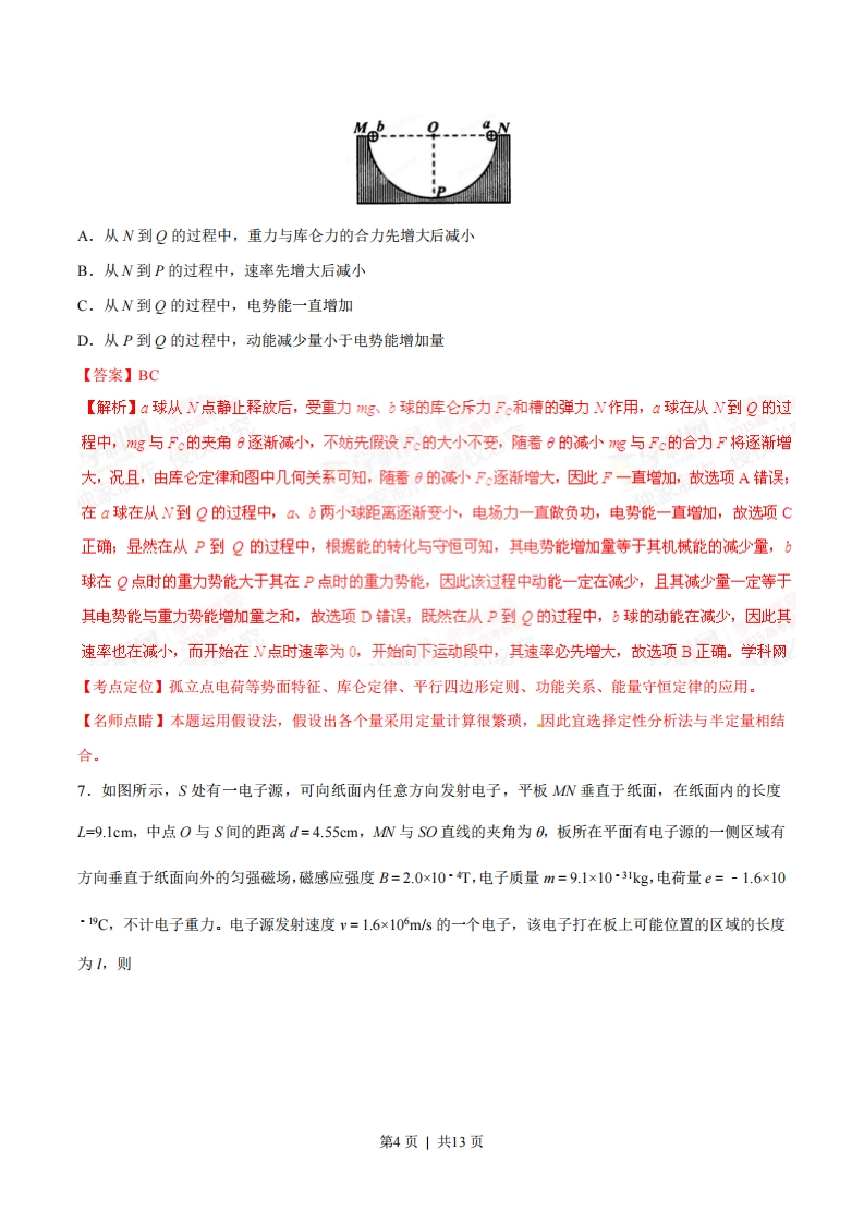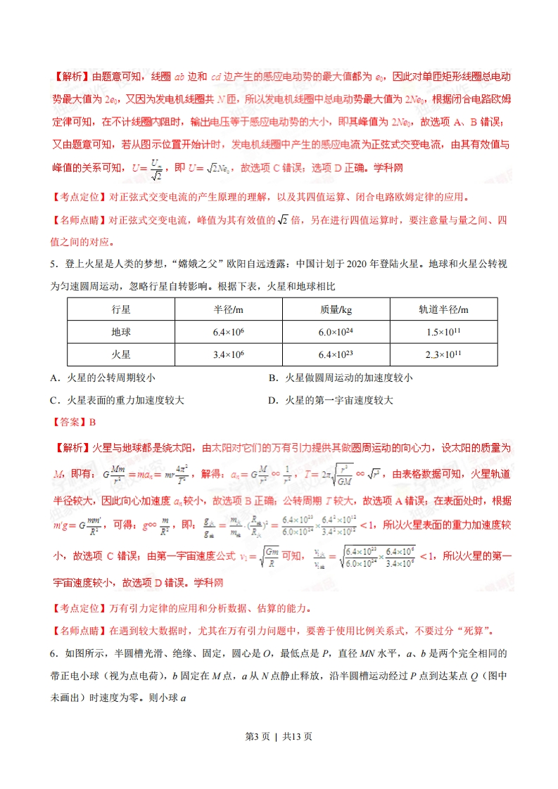 2015年高考四川卷理科综合(物理部分)斌题解析(精编版)(第1卷选择题共7题,共42分)年题给出的四个选项中,有的只有一个选项、有的有多个选项符合题目要求,全部选对的得6分,选对但不全的得3分,有错选和不选的得0分。1.在同一位置以相同的速率把三个小球分别沿水平、斜向上、斜向下方向抛出,不计空气阻力,则落在同一水平地面时的速度大小A.一样大B.水平抛的最大C.斜向上抛的最大D.斜向下抛的最大【答案】A【解析】三个小球被抛出后,均仅在重力作用下运动,三球从同一位置落至同一水平地面时,设其下落高度为%并设小球的质量为m根据动能定理有:g=m-m,解得小球的末速度大小为y=+2g,与小球的质量无关,即三球的末速度大小相等,故选项A正确。学科网家带【考点定位】抛体运动特点、动能定理(或机械能守恒定律)的理解与应用。【名师点睛】落体运动中,物体的速率变化与其质量无关。2.平静湖面传播着一列水面波(横波),在波的传播方向上有相距3m的甲、乙两小木块随波上下运动,测得两个小木块每分钟都上下30次,甲在波谷时,乙在波峰,且两木块之间有一个波峰。这列水面波A.频率是30HzB.波长是3mC.波速是1m/sD.周期是0.1s【答案】C【解析】木块的上下运动反映了所在位置水面质点的振动情况,即被传播方向上的质点每分钟完成30次全振动,因此其周期为:1=0=2,故选项D错误:频率为:户=0,5H2,故选项A错误又因为甲在波谷时,乙在波峰,且两木块之间有一个波峰,所以5=2,解得波长为:=学=2m,故选项B错3误,根据波长、波速、周期间联系可知,这列水面波的波速为:=乡=和s=1m故选项C正确。【考点定位】对机械波、机械振动特点和规律的理解与应用。【名师点睛】(1)受迫振动的周期(频率)等于驱动力的周期(频率):(2)在波的传播方向上,振动同步的质点,相距半波长的偶数倍,振动异步的质点,相距半波长的奇数倍。3.直线PP2过均匀玻璃球球心O,细光束a、b平行且关于PP2对称,由空气射入玻璃球的光路如图。a、b光相比第1页|共13页A.玻璃对a光的折射率较大B.玻璃对a光的临界角较小C.b光在玻璃中的传播速度较小D.b光在玻璃中的传播时间较短【答案】C【解析】由于、)光平行且关于过球心O的直线PP对称,因此它们的入射角i相等,根据图中几何关系可知,力光在玻璃球中的光路偏离进入球之前方向较多,即光的折射角,较小,根据折射定律有:?=血,siny所以玻璃对3光的折射率较大,故选项A错误,根据临界角公式有:如C=。,所以玻璃对a光的临界角较大,故选项B错误,根据折射率的定义式有:?=三,所以光在玻璃中的传播速度v较小,故选项℃正确;根据图中几何关系可知,a、6光进入玻璃球后,光的光程较大,根据匀速直线运动规律有:【=已,所以b光在玻璃中的传播时间较长,故选项D错误。学科网【考点定位】对折射率、临界角、光的折射定律的理解与应用。【名师点睛】在光的折射中,光线便折程度越大,介质对其折射率越大、临界角越小、在介质中的传播速率越小、波长越短,值得注意的是,光(波)在进入介质前后频率不变。4.小型手摇发电机线圈共N匝,每匝可简化为矩形线圈bcd,磁极间的磁场视为匀强磁场,方向垂直于线圈中心轴OO',,线圈绕OO匀速转动,如图所示。矩形线圈ab边和cd边产生的感应电动势的最大值都为0,不计线圈电阻,则发电机输出电压A.峰值是0B.峰值是2eoC.有效值是正%,D.有效值是2Ne2【答案】D第2页|共13页【解析】由题意可知,线圈α边和c边产生的感应电动势的最大值都为,因此对单匝矩形线圈总电动势最大值为2侧,又因为发电机线圈共V匝,所以发电机线圈中总电动势最大值为2,根据闭合电路欧姆定律可知,在不计线圈内阻时,输出电压等于感应电动势的大小,即其峰值为2,故选项A、B错误:又由题意可知,若从图示位置开始计时,发电机线圈中产生的感应电流为正弦式交变电流,由其有效值与峰值的关系可知,心=二,即U=,故选项C错误,选项D正确。学科网【考点定位】对正弦式交变电流的产生原理的理解,以及其四值运算、闭合电路欧姆定律的应用。【名师点睛】对正弦式交变电流,峰值为其有效值的2倍,另在进行四值运算时,要注意量与量之间、四值之间的对应。5.登上火星是人类的梦想,“嫦娥之父”欧阳自远透露:中国计划于2020年登陆火星。地球和火星公转视为匀速圆周运动,忽略行星自转影响。根据下表,火星和地球相比行星半径m质量kg轨道半径m地球6.4×1066.0×10241.5×1011火星3.4×10%6.4×10232.3×1011A.火星的公转周期较小B.火星做圆周运动的加速度较小C.火星表面的重力加速度较大D.火星的第一宇宙速度较大【答案】B【解析】火星与地球都是绕太阳,由太阳对它们的万有引力提供其做圆周运动的向心力,设太阳的质量为6即有:G“=a=m其,解得:a=6兰0之,1=2©√F,,由表格数据可知,火星轨道VGM半径较大,因此向心加速度a较小,故选项B正确:公转周期T较大,故选项A错误,在表面处时,根据6.4×106.42×10g=6受,可得:g”,即受=<1所火里来面的重力加速度软小,故选项C错误:由第一宇宙速度公式=,可知,达=6.4×106.4×100V6.0x103.4×10<1,所以火星的第一宇宙速度较小,故选项D错误。学科网【考点定位】万有引力定律的应用和分析数据、估算的能力。【名师点睛】在遇到较大数据时,尤其在万有引力问题中,要善于使用比例关系式,不要过分“死算”。6.如图所示,半圆槽光滑、绝缘、固定,圆心是O,最低点是P,直径MN水平,a、b是