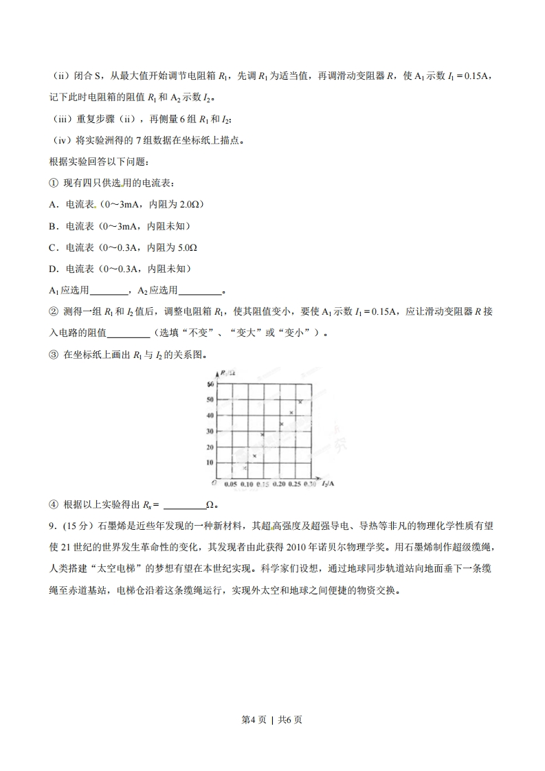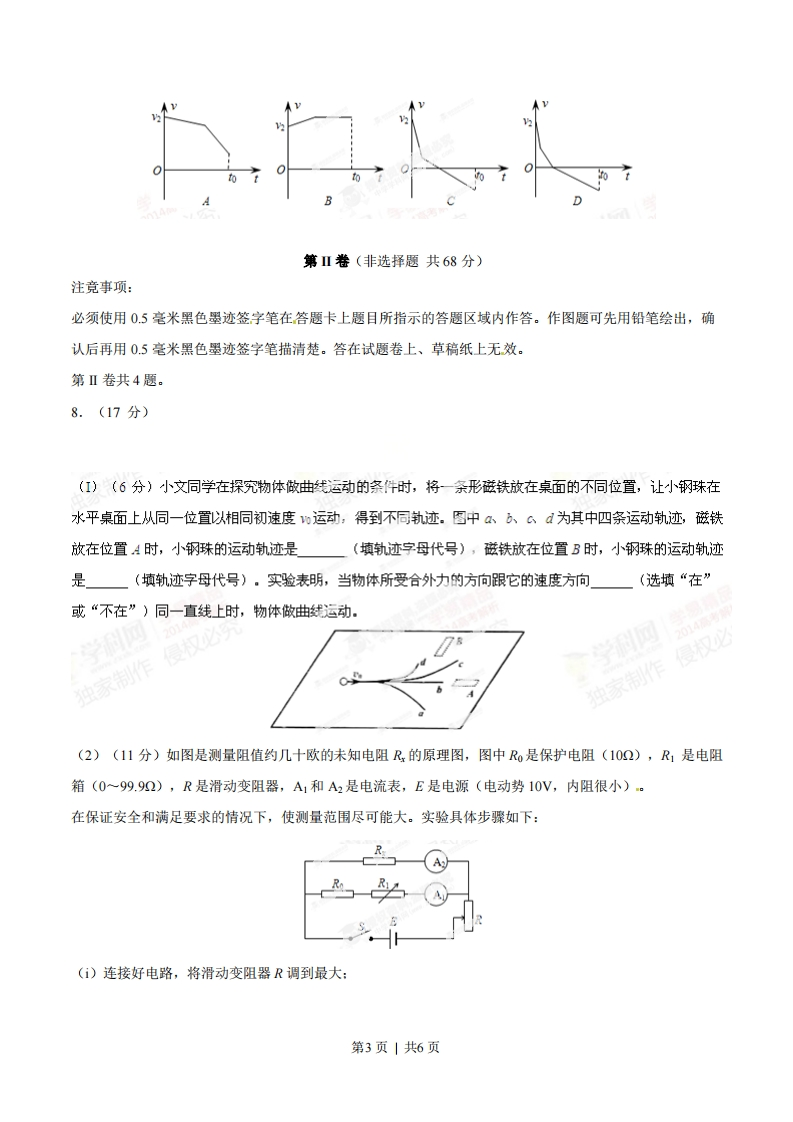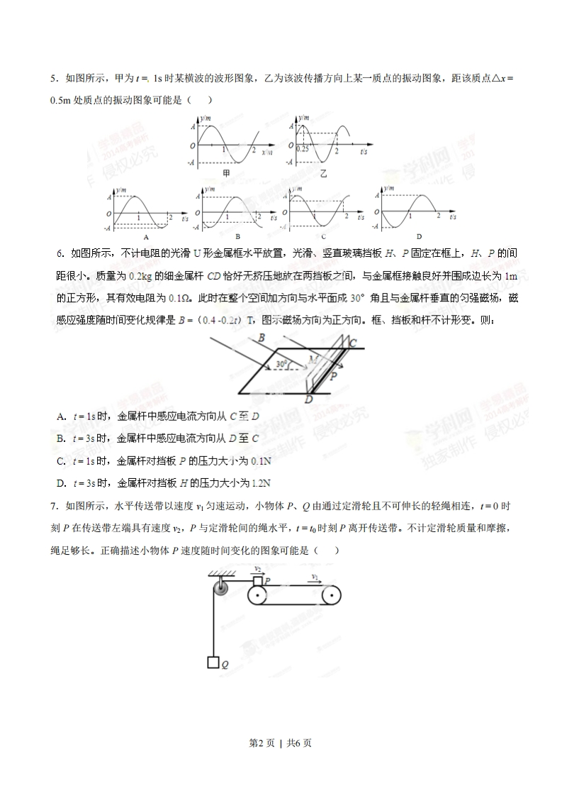 2014年高考四川卷理科综合(物理部分)理科综合考试时间共150分钟,满分300分。其中,物理110分,化学100分,生物90分。第I卷(选择题共42分)第I卷共7题,每题6分。每题给出的四个选项中,有的只有一个选项、有的有多个选项符合题目要求,全部选对的得6分,选对但不全的得3分,有选错和不选的得0分。1.如图所示,甲是远距离的输电示意图,乙是发电机输出电压随时间变化的图象,则()发电机升压变压器A.用户用电器上交流电的频率是10OHzB.发电机输出交流电的电压有效值是500VC.输电线的电流只由降压变压器原副线圈的匝数比决定D.当用户用电器的总电阻增大时,输电线上损失功率减小2.电磁波己广泛运用于很多领域,下列关于电磁波的说法符实际的是(。)A.电磁波不能产生衍射现象B.常用的遥控器通过里出紫外线脉冲信号来遥控电视机C.根据多普勒效应可以判断遥远天体相对于地球的运动速度D.光在真空中运动的速度在不同惯性系中测得的数值可能不同3.如图所示,口径较大、充满水的薄壁圆柱形玻璃缸底有一发光小球,则()A.小球必须位于缸底中心才能从侧面看到小球B.小球所发的光能从水面任何区域射出2014C.小球所发的光从水中进入空气后频率变大作侵权必究D.小球所发的光从水中进入空气后传播速度变大4.有一条两岸平直、河水均匀流动、流速恒为ⅴ的大河。小明驾着小船渡河,去程时船头指向始终与河岸垂直,回程时行驶路线与河岸垂直。去程与回程所用时间的比值为k,船在静水中的速度大小相同,则小船在静水中的速度大小为()vA.B.C...DVk2-1V1-k2V1-k2Vk2-1第1页|共6页5.如图所示,甲为t=1s时某横波的波形图象,乙为该波传播方向上某一质点的振动图象,距该质点△x=0.5m处质点的振动图象可能是()侵权必究56.如图所示,不计电阻的光滑U形金属框水平放置,光滑、竖直玻璃挡板H、P固定在框上,以、P的间距很小。质量为0.2kg的细金属杆CD恰好无挤压地放在两挡板之间,与金属框接触良好并围成边长为1m的正方形,其有效电阻为0.12。此时在整个空间加方向与水平面成30°角且与金属杆垂直的匀强磁场,磁感应强度随时间变化规律是B=(0.4-0.2)T,图示磁场方向为正方向。框、挡板和杆不计形变。则:BA.t=1s时,金属杆中感应电流方向从C至DB.t=3s时,金属杆中感应电流方向从D至C学到品C.t=1s时,金属杆对挡板P的压力大小为0.1N独家制作侵权必D.t=3s时,金属杆对挡板H的压力大小为12N7.如图所示,水平传送带以速度1匀速运动,小物体P、Q由通过定滑轮且不可伸长的轻绳相连,1=0时刻P在传送带左端具有速度2,P与定滑轮间的绳水平,1=6时刻P离开传送带。不计定滑轮质量和摩擦,绳足够长。正确描述小物体P速度随时间变化的图象可能是()第2页|共6页第Ⅱ卷(非选择题共68分)注竞事项:必须使用0.5毫米黑色墨迹签字笔在答题卡上题目所指示的答题区域内作答。作图题可先用铅笔绘出,确认后再用0.5毫米黑色墨迹签字笔描清楚。答在试题卷上、草稿纸上无效。第Ⅱ卷共4题.8.(17分)(I)(6分)小文同学在探究物体做曲线运动的条件时,将一条形磁铁放在桌面的不同位置,让小钢珠在水平桌面上从同一位置以相同初速度0运动,得到不同轨迹。图中a么、、6d为其中四条运动轨迹,磁铁放在位置A时,小钢珠的运动轨迹是(填轨迹字母代号),磁铁放在位置B时,小钢珠的运动轨迹是(填轨迹字母代号)。实验表明,当物体所受合外力的方向跟它的速度方向(选填“在”或“不在”)同一直线上时,物体做曲线运动。独家制作侵权必独家制作侵权必(2)(11分)如图是测量阻值约几十欧的未知电阻R的原理图,图中Ro是保护电阻(10Q),R1是电阻箱(0~99.90),R是滑动变阻器,A1和A2是电流表,E是电源(电动势10V,内阻很小)。在保证安全和满足要求的情况下,使测量范围尽可能大。实验具体步骤如下:()连接好电路,将滑动变阻器R调到最大:第3页|共6页