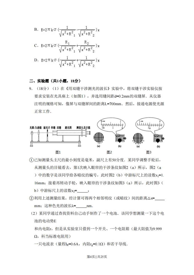 2009年北京市高考物理试卷一、选择题.本题包括8小题.每题6分,共48分.每小题只有一个选项符合题意1.(6分)做布朗运动实验,得到某个观测记录如图。图中记录的是()A.分子无规则运动的情况B.某个微粒做布朗运动的轨迹C.某个微粒做布朗运动的速度·-时间图线D.按等时间间隔依次记录的某个运动微粒位置的连线2.(6分)下列现象中,与原子核内部变化有关的是()A.α粒子散射现象B.天然放射现象C.光电效应现象D.原子发光现象3.(6分)类比是一种有效的学习方法,通过归类和比较,有助于掌握新知识,提高学习效率。在类比过程中,既要找出共同之处,又要抓住不同之处。某同学对机械波和电磁波进行类比,总结出下列内容,其中不正确的是()A.机械波的频率、波长和波速三者满足的关系,对电磁波也适用B.机械波和电磁波都能产生干涉和衍射现象C.机械波的传播依赖于介质,而电磁波可以在真空中传播D.机械波既有横波又有纵波,而电磁波只有纵波4.(6分)某静电场的电场线分布如图所示,图中P、Q两点的电场强度的大小分别为Ep和Eo,电势分别为Up和Uo,则()第1页1共25页A.Ep>Eo,Up>UoB.Ep>Eo,Up