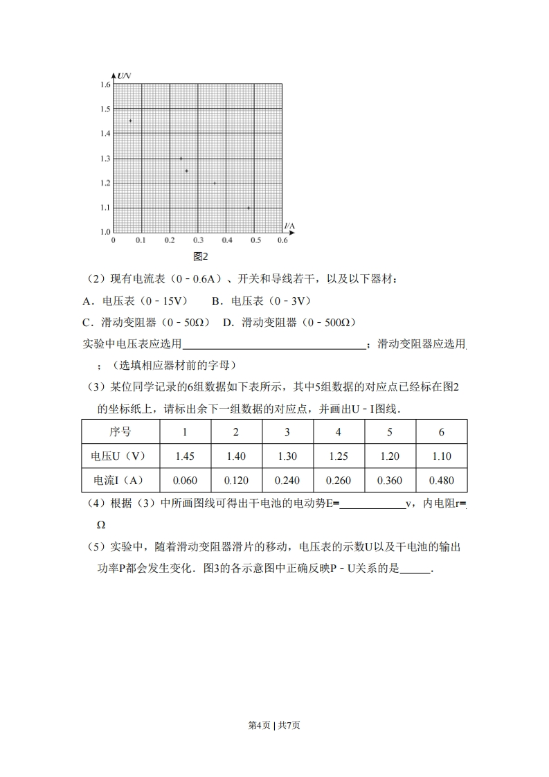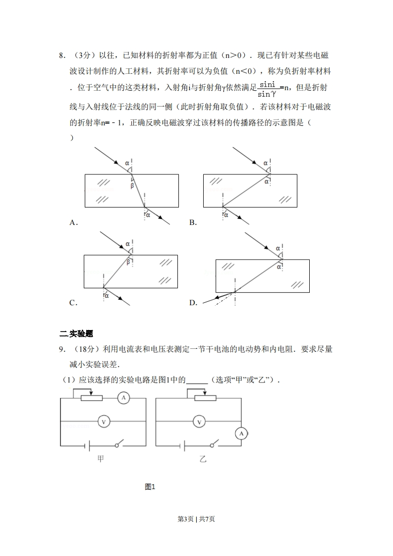 2014年北京市高考物理试卷一选择题1.(3分)下列说法中正确的是()A.物体温度降低,其分子热运动的平均动能增大B.物体温度升高,其分子热运动的平均动能增大C.物体温度降低,其内能一定增大D.物体温度不变,其内能一定不变2.(3分)质子、中子和氘核的质量分别为m1、m2和m3.当一个质子和一个中子结合成氘核时,释放的能量是(c表示真空中的光速)()A.(m1+m2-m3)cB.(m1-m2-m3)cC.(m1+m2-m3)c2D.(m1-m2-m3)c23.(3分)如图所示,实线表示某静电场的电场线,虚线表示该电场的等势面。下列判断正确的是()A.1、2两点的场强相等B.1、3两点的场强相等C.1、2两点的电势相等D.2、3两点的电势相等4.(3分)带电粒子a、b在同一匀强磁场中做匀速圆周运动,它们的动量大小相等,a运动的半径大于b运动的半径.若a、b的电荷量分别为qa、qb,质量分别为ma、mb,周期分别为Ta、T·则一定有()A.qaqbB.ma0).现已有针对某些电磁波设计制作的人工材料,其折射率可以为负值(<0),称为负折射率材料.位于空气中的这类材料,入射角i与折射角y依然满足sini=n,但是折射sinY线与入射线位于法线的同一侧(此时折射角取负值)·若该材料对于电磁波的折射率=-1,正确反映电磁波穿过该材料的传播路径的示意图是(aB.的aCD二实验题9.(18分)利用电流表和电压表测定一节干电池的电动势和内电阻.要求尽量减小实验误差,(1)应该选择的实验电路是图1中的(选项“甲”或“乙”),甲乙图1第3页|共7页
