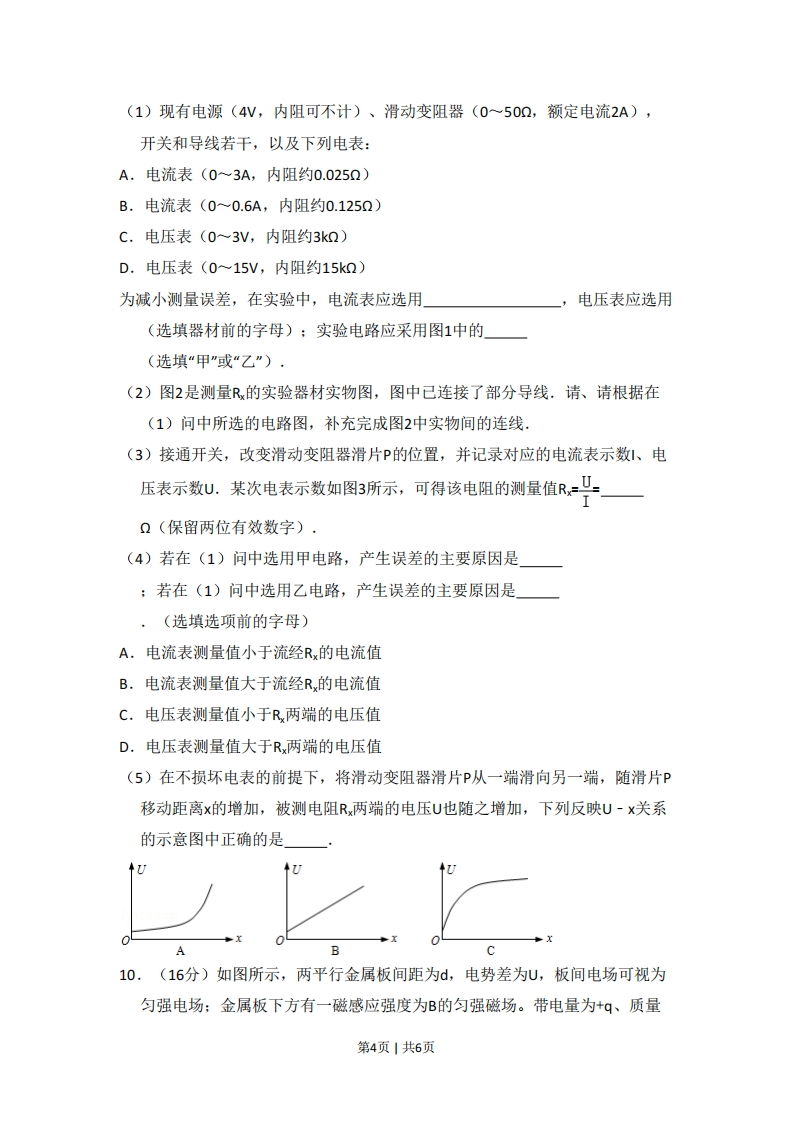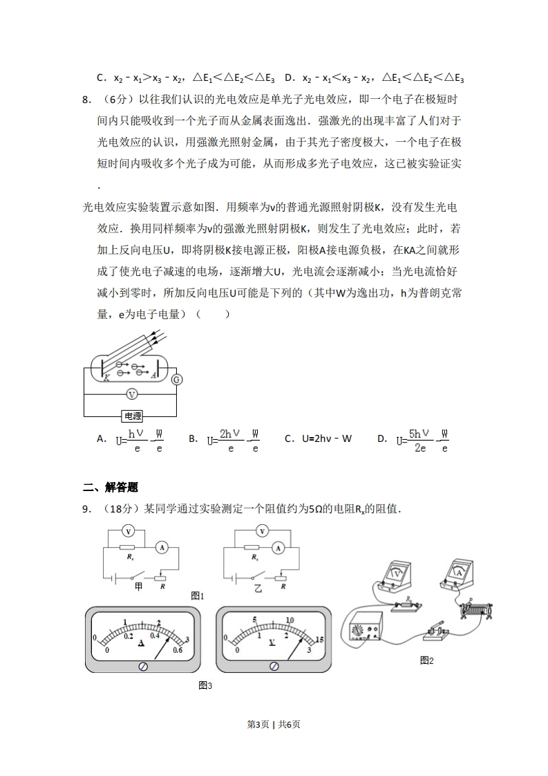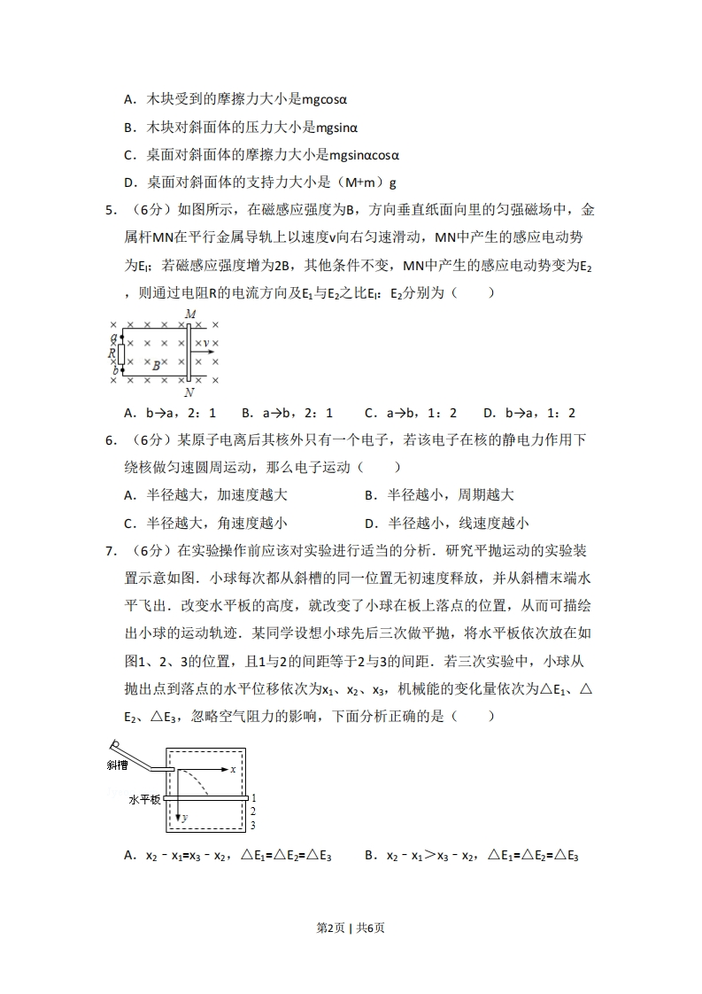 2013年北京市高考物理试卷一、选择题(共8小题,每小题6分,满分48分)1.(6分)下列说法正确的是()A.液体中悬浮的微粒的无规则运动称为布朗运动B.液体分子的无规则运动称为布朗运动C.物体从外界吸收热量,其内能一定增加D.物体对外界做功,其内能一定减少2.(6分)如图所示,一束可见光射向半圆形玻璃砖的圆心0,经折射后分为两束单色光a和b.下列判断正确的是()A.玻璃对a光的折射率小于对b光的折射率B.a光的频率大于b光的频率C.在真空中a光的波长大于b光的波长D.a光光子能量小于b光光子能量3.(6分)一列沿x轴正方向传播的简谐机械横波,波速为4m/s.某时刻波形如图所示,下列说法正确的是()1012+xmA.这列波的振幅为4cmB.这列波的周期为1sC.此时x=4m处质点沿y轴负方向运动D.此时x=4m处质点的加速度为04.(6分)倾角为a、质量为M的斜面体静止在水平桌面上,质量为m的木块静止在斜面体上.下列结论正确的是()第1页1共6页A.木块受到的摩擦力大小是mgcosaB.木块对斜面体的压力大小是ngsinaC.桌面对斜面体的摩擦力大小是mgsinacosaD.桌面对斜面体的支持力大小是(M什m)g5,(6分)如图所示,在磁感应强度为B,方向垂直纸面向里的匀强磁场中,金属杆MN在平行金属导轨上以速度v向右匀速滑动,MN中产生的感应电动势为E:若磁感应强度增为2B,其他条件不变,MN中产生的感应电动势变为E2,则通过电阻R的电流方向及E1与E2之比E:E2分别为()MXXXV×RXXX XUX XA.b→a,2:1B.a→b,2:1C.a>b,1:2D.b→a,1:26,(6分)某原子电离后其核外只有一个电子,若该电子在核的静电力作用下绕核做匀速圆周运动,那么电子运动()A.半径越大,加速度越大B.半径越小,周期越大C.半径越大,角速度越小D.半径越小,线速度越小7.(6分)在实验操作前应该对实验进行适当的分析.研究平抛运动的实验装置示意如图.小球每次都从斜槽的同一位置无初速度释放,并从斜槽末端水平飞出.改变水平板的高度,就改变了小球在板上落点的位置,从而可描绘出小球的运动轨迹.某同学设想小球先后三次做平抛,将水平板依次放在如图1、2、3的位置,且1与2的间距等于2与3的间距.若三次实验中,小球从抛出点到落点的水平位移依次为x1、2、3,机械能的变化量依次为△E1、△E2、△E3,忽略空气阻力的影响,下面分析正确的是()斜槽水平板A.X2-X1=X3-X2,△E1=△E2=△E3B.X2-X1>X3-X2,△E1=△E2=△E3第2页1共6页C.X2-X1>X3-X2,△E1<△E2<△E3D.X2-X1