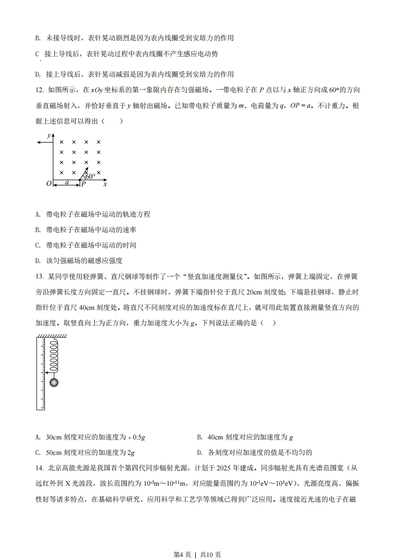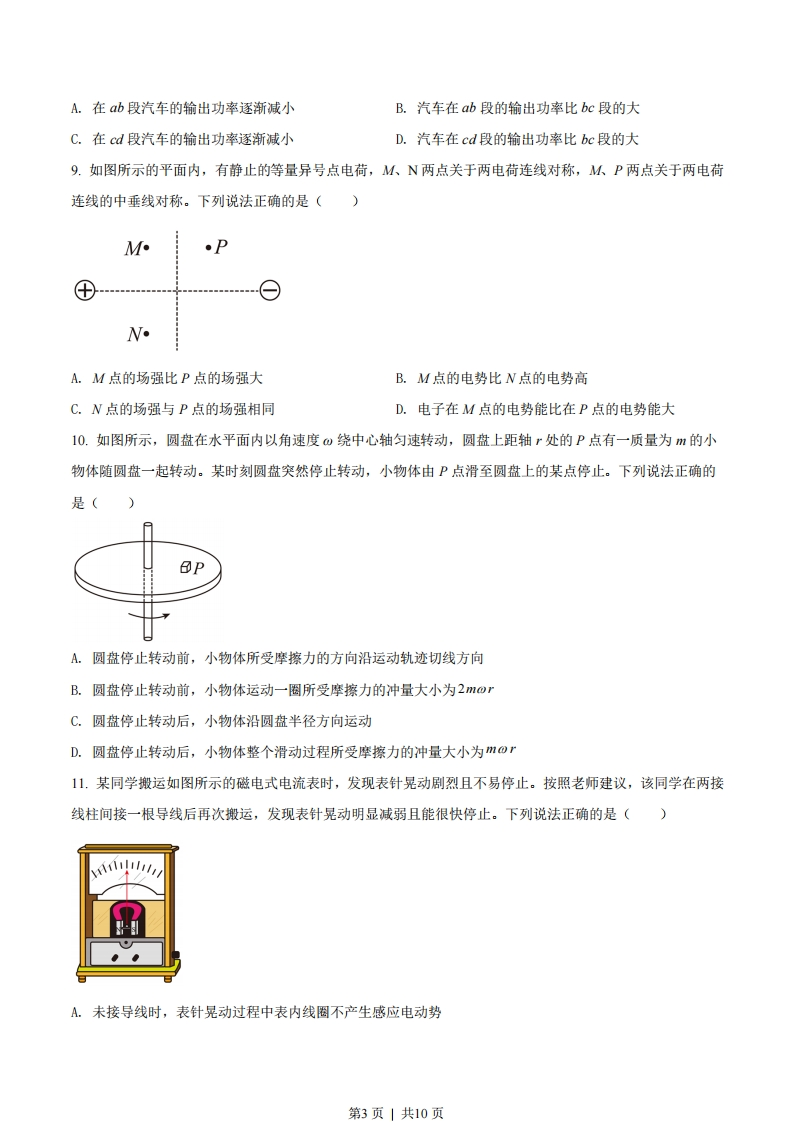 北京市2021年普通高中学业水平等级性考试物理本试卷共8页,100分。考试时长90分钟。考生务必将答案答在答题卡上,在试卷上作答无效。考试结束后,将本试卷和答题卡一并交回。第一部分本部分共14题,每题3分,共42分。在每题列出的四个选项中,选出最符合题目要求的一项。1.硼(B)中子俘获治疗是目前最先进的癌症治疗手段之一、治疗时先给病人注射一种含硼的药物,随后用中子照射,硼俘获中子后,产生高杀伤力的α粒子和锂(L)离子。这个核反应的方程是()A.B+n→Li+HeB.gB+He→N+。nC.N+He→0+HD.N+dn→4C+H2.如图所示的平面内,光束α经圆心O射入半圆形玻璃砖,出射光为b、c两束单色光。下列说法正确的是()CA.这是光的干涉现象B.在真空中光束b的波长大于光束c的波长C.玻璃砖对光束b的折射率大于对光束c的折射率D.在玻璃砖中光束b的传播速度大于光束c的传播速度3.一列简谐横波某时刻的波形图如图所示。此后K质点比L质点先回到平衡位置。下列判断正确的是()A.该简谐横波沿x轴负方向传播B.此时K质点沿y轴正方向运动C.此时K质点的速度比L质点的小D.此时K质点的加速度比L质点的小4.比较45C的热水和100C的水蒸汽,下列说法正确的是()第1页」共10页A.热水分子的平均动能比水蒸汽的大B.热水的内能比相同质量的水蒸汽的小C.热水分子的速率都比水蒸汽的小D.热水分子的热运动比水蒸汽的剧烈5.一正弦式交变电流的1-t图像如图所示。下列说法正确的是()i/A00.0230.40.5六A.在1=0.4s时电流改变方向B.该交变电流的周期为0.5sC.该交变电流的表达式为i=2cos5AD.该交变电流的有效值为巨A26.2021年5月,“天问一号”探测器成功在火星软着陆,我国成为世界上第一个首次探测火星就实现“绕、落、巡”三项任务的国家。“天问一号”在火星停泊轨道运行时,近火点距离火星表面2.8×102k、远火点距离火星表面5.9×105km,则“天问一号”()A.在近火点的加速度比远火点的小B.在近火点的运行速度比远火点的小C.在近火点的机械能比远火点的小D.在近火点通过减速可实现绕火星做圆周运动7.如图所示,在竖直向下的匀强磁场中,水平U型导体框左端连接一阻值为R的电阻,质量为m、电阻为r的导体棒ab置于导体框上。不计导体框的电阻、导体棒与框间的摩擦。ab以水平向右的初速度o开始运动,最终停在导体框上。在此过程中()aRA.导体棒做匀减速直线运动B.导体棒中感应电流的方向为a→bC.电阻R消耗的总电能为mvoR2(R+r)D。导体棒克服安培力做的总功小于万m网8.如图所示,高速公路上汽车定速巡航(即保持汽车的速率不变)通过路面abcd,其中ab段为平直上坡路面,bc段为水平路面,cd段为平直下坡路面。不考虑整个过程中空气阻力和摩擦阻力的大小变化。下列说法正确的是()bCa高8高9d第2页1共10页A.在☑b段汽车的输出功率逐渐减小B.汽车在ab段的输出功率比bc段的大C.在cd段汽车的输出功率逐渐减小D.汽车在cd段的输出功率比bc段的大9.如图所示的平面内,有静止的等量异号点电荷,M、N两点关于两电荷连线对称,山、P两点关于两电荷连线的中垂线对称。下列说法正确的是()MP⊕WA.M点的场强比P点的场强大B.M点的电势比W点的电势高C.N点的场强与P点的场强相同D.电子在M点的电势能比在P点的电势能大10.如图所示,圆盘在水平面内以角速度。绕中心轴匀速转动,圆盘上距轴r处的P点有一质量为m的小物体随圆盘一起转动。某时刻圆盘突然停止转动,小物体由P点滑至圆盘上的某点停止。下列说法正确的是()OpA.圆盘停止转动前,小物体所受摩擦力的方向沿运动轨迹切线方向B.圆盘停止转动前,小物体运动一圈所受摩擦力的冲量大小为2m@”C.圆盘停止转动后,小物体沿圆盘半径方向运动D.圆盘停止转动后,小物体整个滑动过程所受摩擦力的冲量大小为m@”11.某同学搬运如图所示的磁电式电流表时,发现表针晃动剧烈且不易停止。按照老师建议,该同学在两接线柱间接一根导线后再次搬运,发现表针晃动明显减弱且能很快停止。下列说法正确的是()wjlA.未接导线时,表针晃动过程中表内线圈不产生感应电动势第3页」共10页