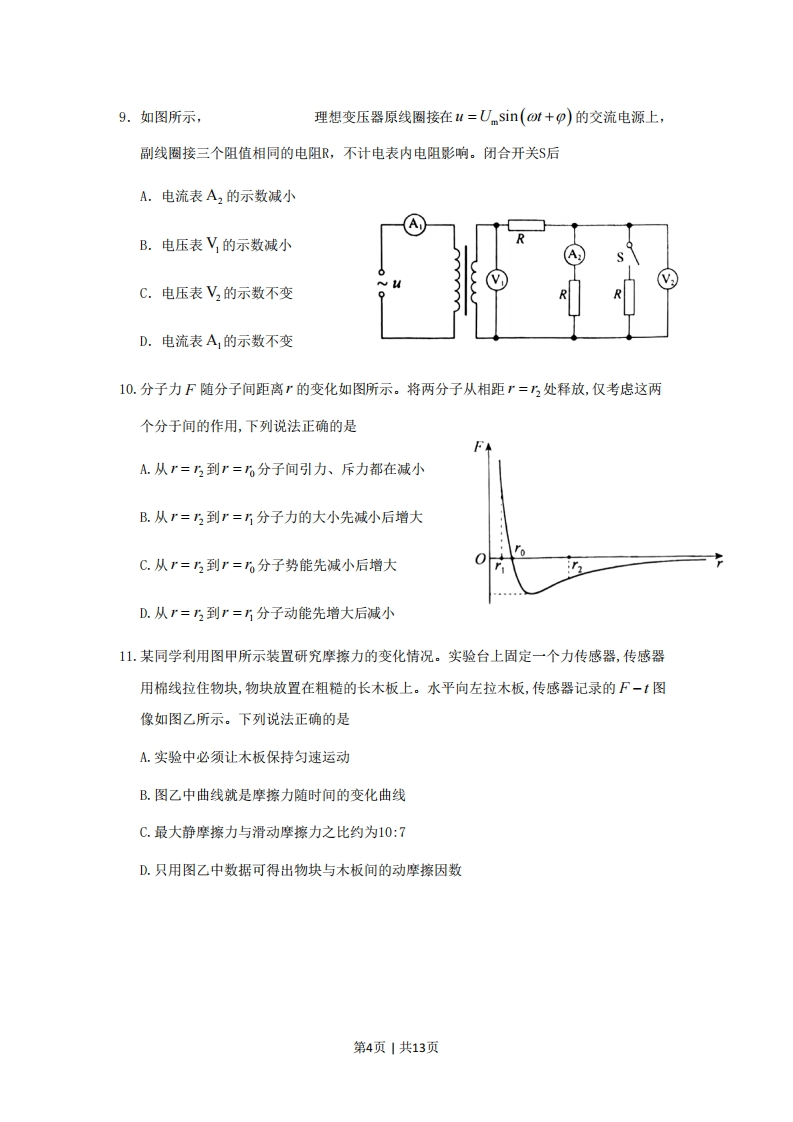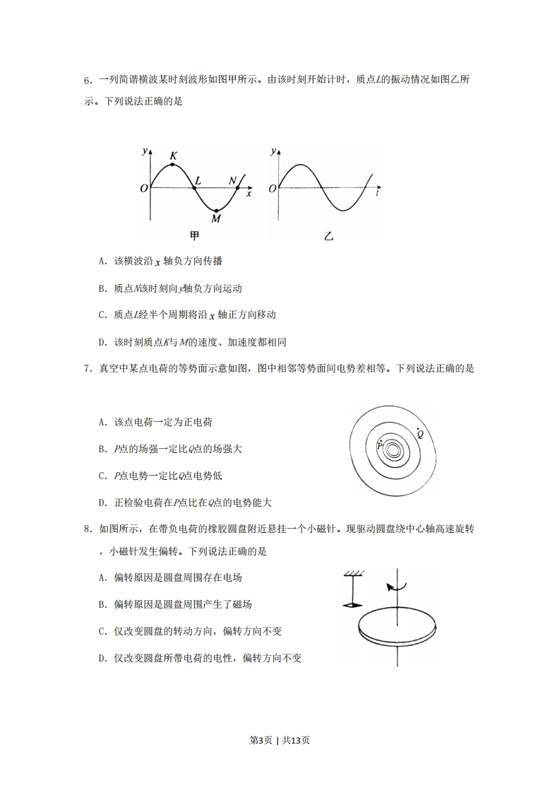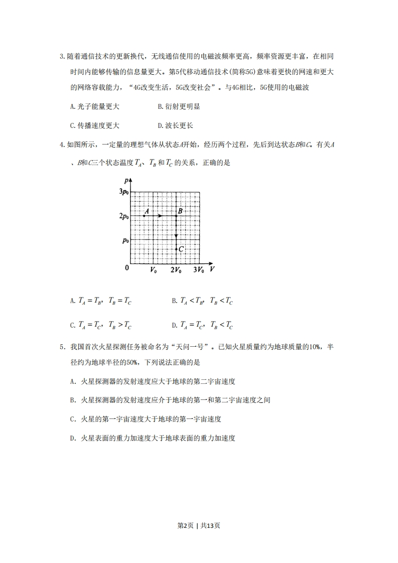 机密★本科目考试启用前北京市2020年普通高中学业水平等级性考试物理本试卷共8页,100分。考试时长90分钟。考生务必将答案答在答题卡上,在试卷上作答无效。考试结束后,将本试卷和答题卡一并交回。第一部分本部分共14题,每题3分,共42分。在每题列出的四个选项中,选出最符合题目要求的一项。1.以下现象不属于干涉的是A.白光经过杨氏双缝得到彩色图样B.白光照射肥皂膜呈现彩色图样C.白光经过三棱镜得到彩色图样D.白光照射水面油膜呈现彩色图样2.氢原子能级示意如图。现有大量氢原子处于=3能级上,下列说法正确的是nE/eV年里。年票里”年里”年年里年440-0.544-0.853-1.51-3.4-13.6A.这些原子跃迁过程中最多可辐射出2种频率的光子B.从n=3能级跃迁到n=1能级比跃迁到n=2能级辐射的光子频率低C.从n=3能级跃迁到n=4能级需吸收0.66eV的能量D.n=3能级的氢原子电离至少需要吸收13.6eV的能量第1页|共13页3.随着通信技术的更新换代,无线通信使用的电磁波频率更高,频率资源更丰富,在相同时间内能够传输的信息量更大。第5代移动通信技术(简称5G)意味着更快的网速和更大的网络容载能力,“4G改变生活,5G改变社会”。与4G相比,5G使用的电磁波A.光子能量更大B.衍射更明显C.传播速度更大D.波长更长4.如图所示,一定量的理想气体从状态开始,经历两个过程,先后到达状态和C。有关A、和C三个状态温度TAT和TCc的关系,正确的是P个3po0Vo2.3%vA.T=TR T8=TOB.T