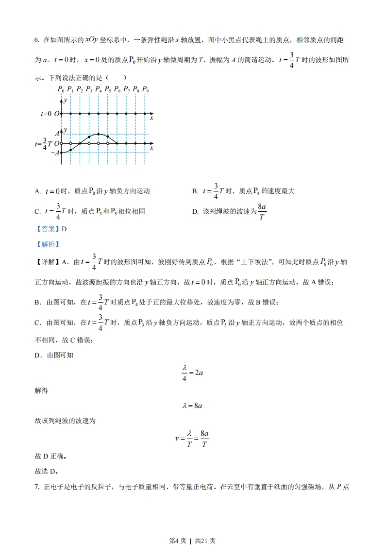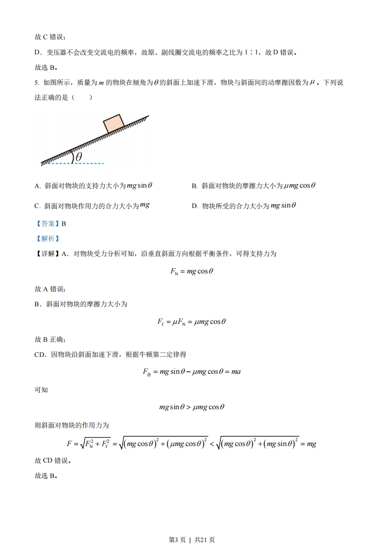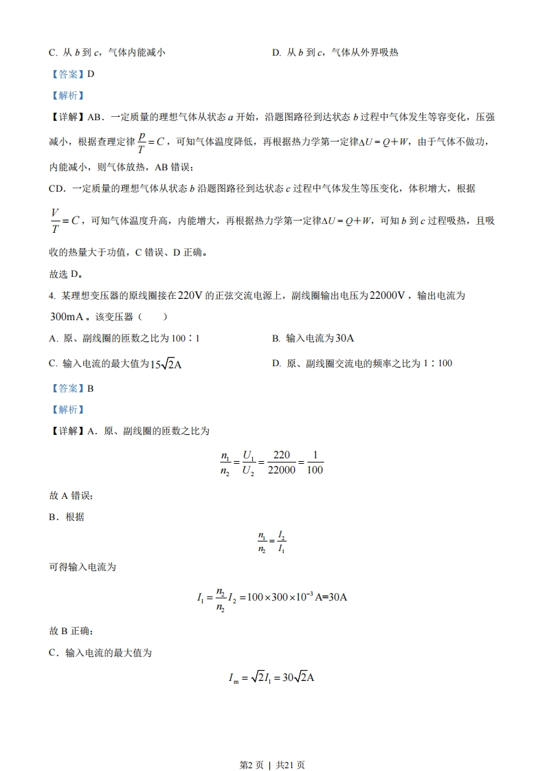 北京市2022年普通高中学业水平等级性考试物理试题本试卷共8页,100分。考试时长90分钟。考生务必将答案答在答题卡上,在试卷上作答无效。考试结束后,将本试卷和答题卡一并交回。第一部分本部分共14题,每题3分,共42分。在每题列出的四个选项中,选出最符合题目要求的一项。1.氢原子从某激发态跃迁到基态,则该氢原子()A.放出光子,能量增加B.放出光子,能量减少C.吸收光子,能量增加D.吸收光子,能量减少【答案】B【解析】【详解】氢原子从某激发态跃迁到基态,则该氢原子放出光子,且放出光子的能量等于两能级之差,能量减少。故选B。2.下列现象能说明光是横波的是()A.光的衍射现象B.光的折射现象C.光的偏振现象D.光的干涉现象【答案】C【解析】【详解】光的偏振现象能说明光是横波。故选C。3.如图所示,一定质量的理想气体从状态开始,沿图示路径先后到达状态b和c。下列说法正确的是()A.从a到b,气体温度保持不变B.从a到b,气体对外界做功第1页」共21页C.从b到c,气体内能减小D.从b到c,气体从外界吸热【答案】D【解析】【详解】AB.一定质量的理想气体从状态α开始,沿题图路径到达状态b过程中气体发生等容变化,压强减小,根据查理定律卫=C,可知气体温度降低,再根据热力学第一定律AU=Q十W,由于气体不做功,内能减小,则气体放热,AB错误:CD.一定质量的理想气体从状态b沿题图路径到达状态c过程中气体发生等压变化,体积增大,根据7=C,可知气体温度升高,内能增大,再根据热力学第一定律4U=Q+取,可知b到c过程吸热,且吸收的热量大于功值,C错误、D正确。故选D。4.某理想变压器的原线圈接在220V的正弦交流电源上,副线圈输出电压为22000V,输出电流为300mA。该变压器()A.原、副线圈的匝数之比为100:1B.输入电流为30AC.输入电流的最大值为15V2AD.原、副线圈交流电的频率之比为1:100【答案】B【解析】【详解】A.原、副线圈的匝数之比为h=凸-2201n2U222000-100故A错误:B.根据丝-上51可得输入电流为1=12=100×300×10A=30An故B正确:C.输入电流的最大值为1m=V21=30W2A第2页共21页故C错误:D.变压器不会改变交流电的频率,故原、副线圈交流电的频率之比为1:1,故D错误。故选B。5.如图所示,质量为m的物块在倾角为B的斜面上加速下滑,物块与斜面间的动摩擦因数为4。下列说法正确的是()等年年细年●年年A.斜面对物块的支持力大小为ng sin0B.斜面对物块的摩擦力大小为gcos0C.斜面对物块作用力的合力大小为mgD.物块所受的合力大小为ng sin0【答案】B【解析】【详解】A.对物块受力分析可知,沿垂直斜面方向根据平衡条件,可得支持力为F mg cos0故A错误:B.斜面对物块的摩擦力大小为F =uF umg cos0故B正确:CD.因物块沿斜面加速下滑,根据牛顿第二定律得Fa=mg sine-umg cos=ma可知mgsin>umg cos则斜面对物块的作用力为F=+2=(mg cos0)+(umg cos0)<(mg cos0)+(mg sin0)2=mg故CD错误。故选B。第3页」共21页