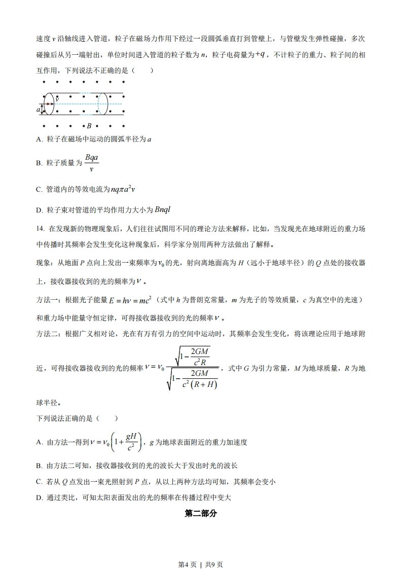 2023年普通高中学业水平等级性考试(北京卷)物理本试卷分第一部分和第二部分。满分100分,考试时间90分钟。第一部分本部分共14小题,每小题3分,共42分。在每小题列出的四个选项中,选出最符合题目要求的一项。1.夜间由于气温降低,汽车轮胎内的气体压强变低。与白天相比,夜间轮胎内的气体()A.分子的平均动能更小B.单位体积内分子的个数更少C.所有分子的运动速率都更小D.分子对轮胎内壁单位面积的平均作用力更大2.阳光下的肥皂膜呈现彩色条纹,这种现象属于光的()A.偏振现象B.衍射现象C.干涉现象D.全反射现象3.下列核反应方程中括号内的粒子为中子的是()A.25U+n→6Ba+Kr+()B.2U→8Th+()c.N+He→870+()D.C”N+()4.位于坐标原点处的波源发出一列沿x轴正方向传播的简谐横波。t=0时波源开始振动,其位移y随时间t变化的关系式为y=Asin(2严),则1=T时的波形图为()5.如图所示,L是自感系数很大、电阻很小的线圈,P、Q是两个相同的小灯泡,开始时,开关S处于闭合状态,P灯微亮,Q灯正常发光,断开开关()第1页」共9页A.P与Q同时熄灭B.P比Q先熄灭C.Q闪亮后再熄灭D.P闪亮后再熄灭6.如图所示,在光滑水平地面上,两相同物块用细线相连,两物块质量均为1kg,细线能承受的最大拉力为2N。若在水平拉力F作用下,两物块一起向右做匀加速直线运动。则F的最大值为()7777777777777A.INB.2NC.4ND.5N7.自制一个原、副线圈匝数分别为600匝和190匝的变压器,原线圈接12V的正弦交流电源,副线圈接额定电压为3.8V的小灯泡。实际测得小灯泡两端电压为2.5V。下列措施有可能使小灯泡正常发光的是()A.仅增加原线圈匝数B.仅增加副线圈匝数C.将原、副线圈匝数都增为原来的两倍D.将两个3.8V小灯泡并联起来接入副线圈8.如图所示,两个带等量正电的点电荷位于M、N两点上,E、F是MN连线中垂线上的两点,O为EF、MN的交点,EO=OF。一带负电的点电荷在E点由静止释放后()白ENFA.做匀加速直线运动B.在O点所受静电力最大C.由E到O的时间等于由O到F的时间D.由E到F的过程中电势能先增大后减小9.如图所示,光滑水平面上的正方形导线框,以某一初速度进入竖直向下的匀强磁场并最终完全穿出。线框的边长小于磁场宽度。下列说法正确的是()XXXXA.线框进磁场的过程中电流方向为顺时针方向B.线框出磁场的过程中做匀减速直线运动C.线框在进和出的两过程中产生的焦耳热相等D.线框在进和出的两过程中通过导线横截面的电荷量相等10.在太空实验室中可以利用匀速圆周运动测量小球质量。如图所示,不可伸长的轻绳一端固定于O点,第2页」共9页另一端系一待测小球,使其绕O做匀速圆周运动,用力传感器测得绳上的拉力为F,用停表测得小球转过圈所用的时间为,用刻度尺测得O点到球心的距离为圆周运动的半径R。下列说法正确的是()A.圆周运动轨道可处于任意平面内B.小球的质量为FR4π2n2C.若误将n-1圈记作n圈,则所得质量偏大D.若测R时未计入小球半径,则所得质量偏小11.如图所示,一物体在力F作用下沿水平桌面做匀加速直线运动。己知物体质量为m,加速度大小为,物体和桌面之间的动摩擦因数为“,重力加速度为g,在物体移动距离为x的过程中()77777777777777777777777A.摩擦力做功大小与F方向无关B.合力做功大小与F方向有关C.F为水平方向时,F做功为4mgD.F做功的最小值为m12.2022年10月9日,我国综合性太阳探测卫星“夸父一号”成功发射,实现了对太阳探测的跨越式突破。“夸父一号”卫星绕地球做匀速圆周运动,距地面高度约为720,运行一圈所用时间约为100分钟。如图所示,为了随时跟踪和观测太阳的活动,“夸父一号”在随地球绕太阳公转的过程中,需要其轨道平面始终与太阳保持固定的取向,使太阳光能照射到“夸父一号”,下列说法正确的是()轨道平面一极轴地球公转轨道A.“夸父一号”的运行轨道平面平均每天转动的角度约为1°B.“夸父一号”绕地球做圆周运动的速度大于7.9km/sC.“夸父一号”绕地球做圆周运动的向心加速度大于地球表面的重力加速度D.由题干信息,根据开普勒第三定律,可求出日地间平均距离13.如图所示,在磁感应强度大小为B、方向垂直纸面向外的匀强磁场中,固定一内部真空且内壁光滑的圆柱形薄壁绝缘管道,其轴线与磁场垂直。管道横截面半径为,长度为1(1>>a)。带电粒子束持续以某一第3页|共9页